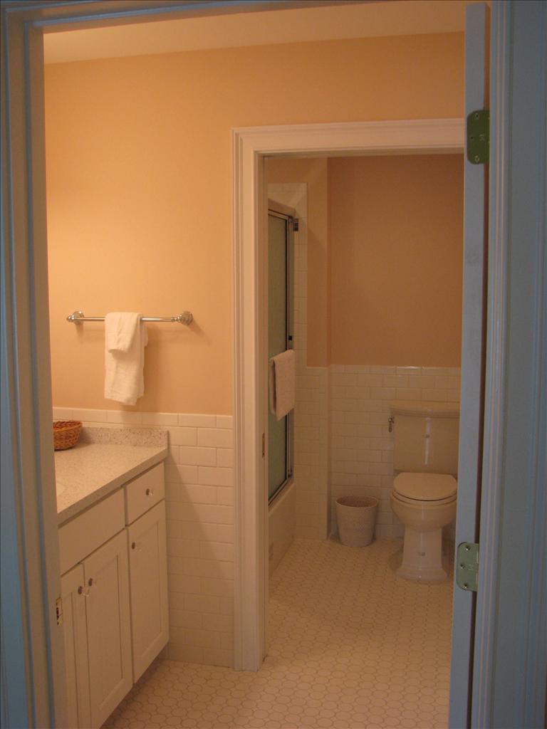 The front bedroom has two twin beds with an en suite full bathroom with a tub.  There is a separate vanity area .