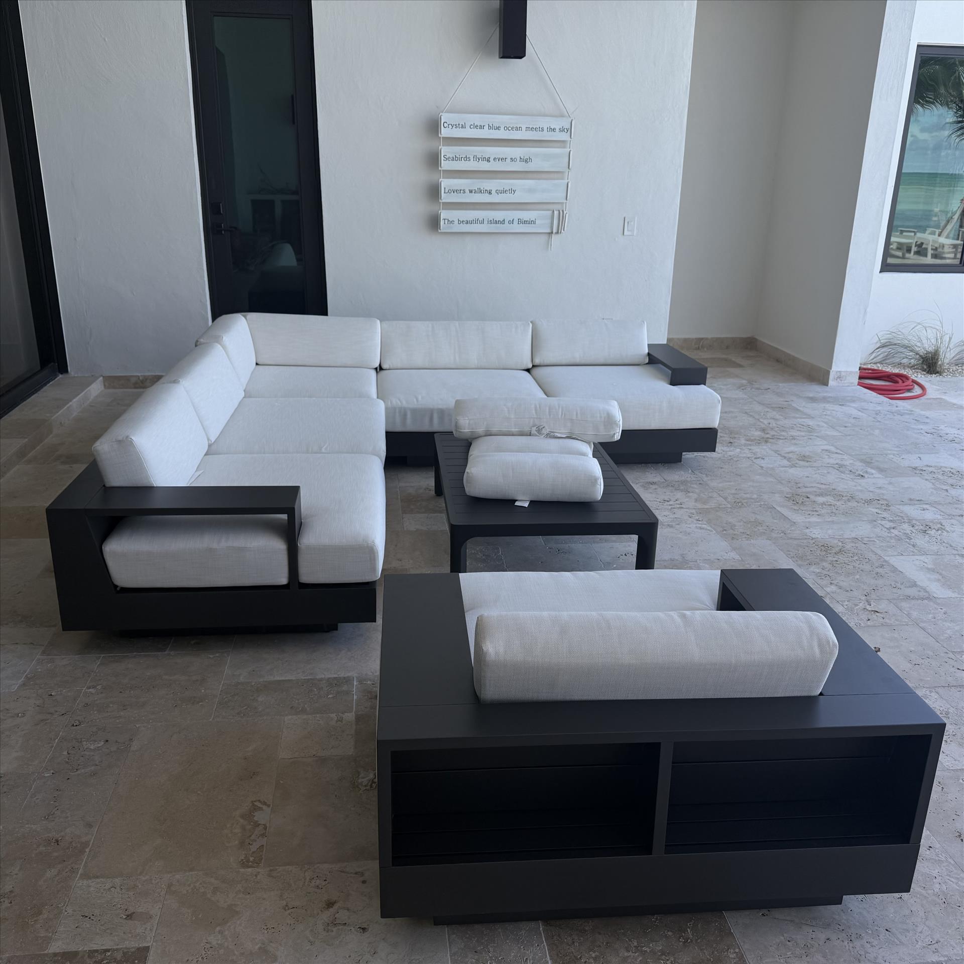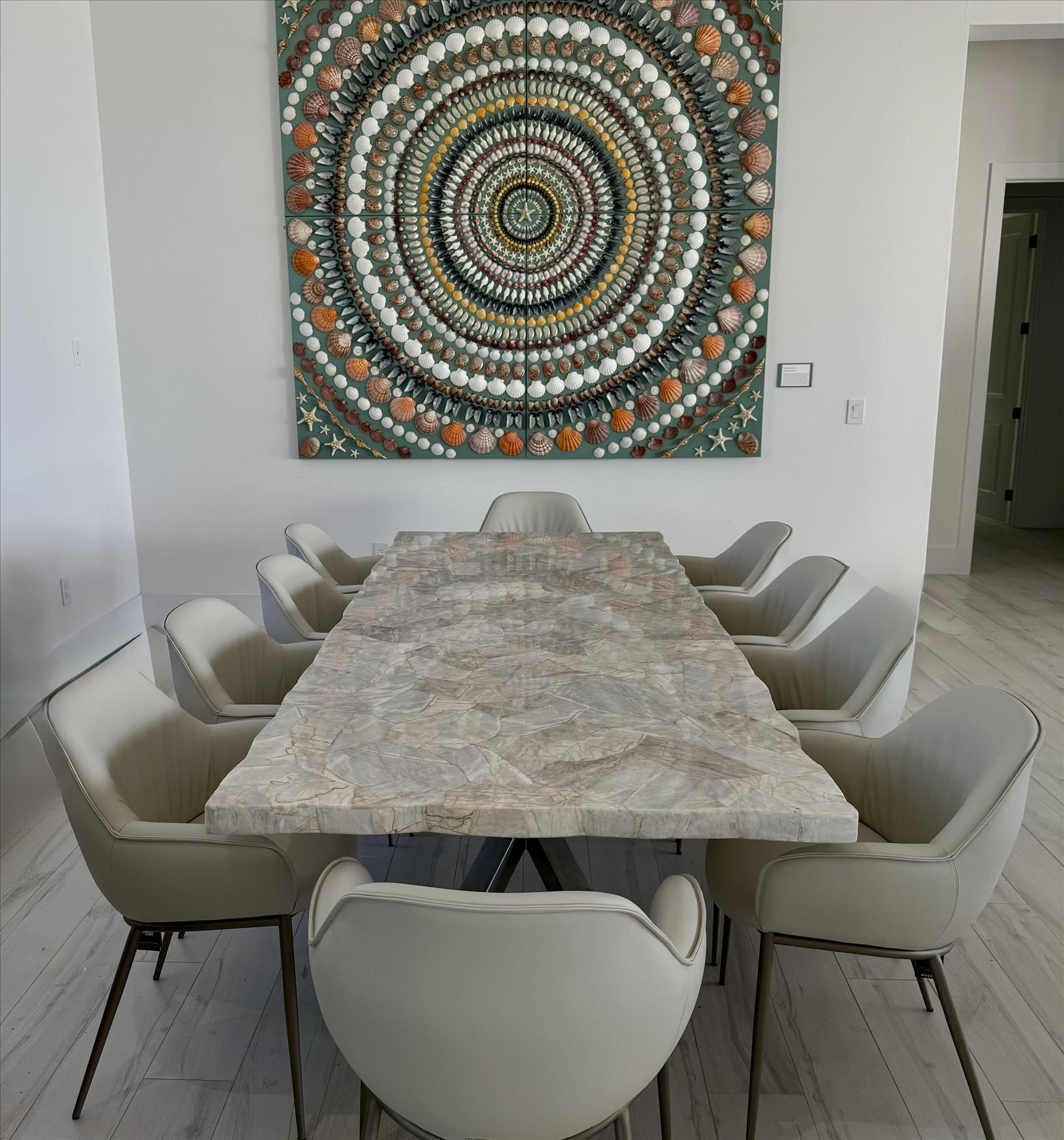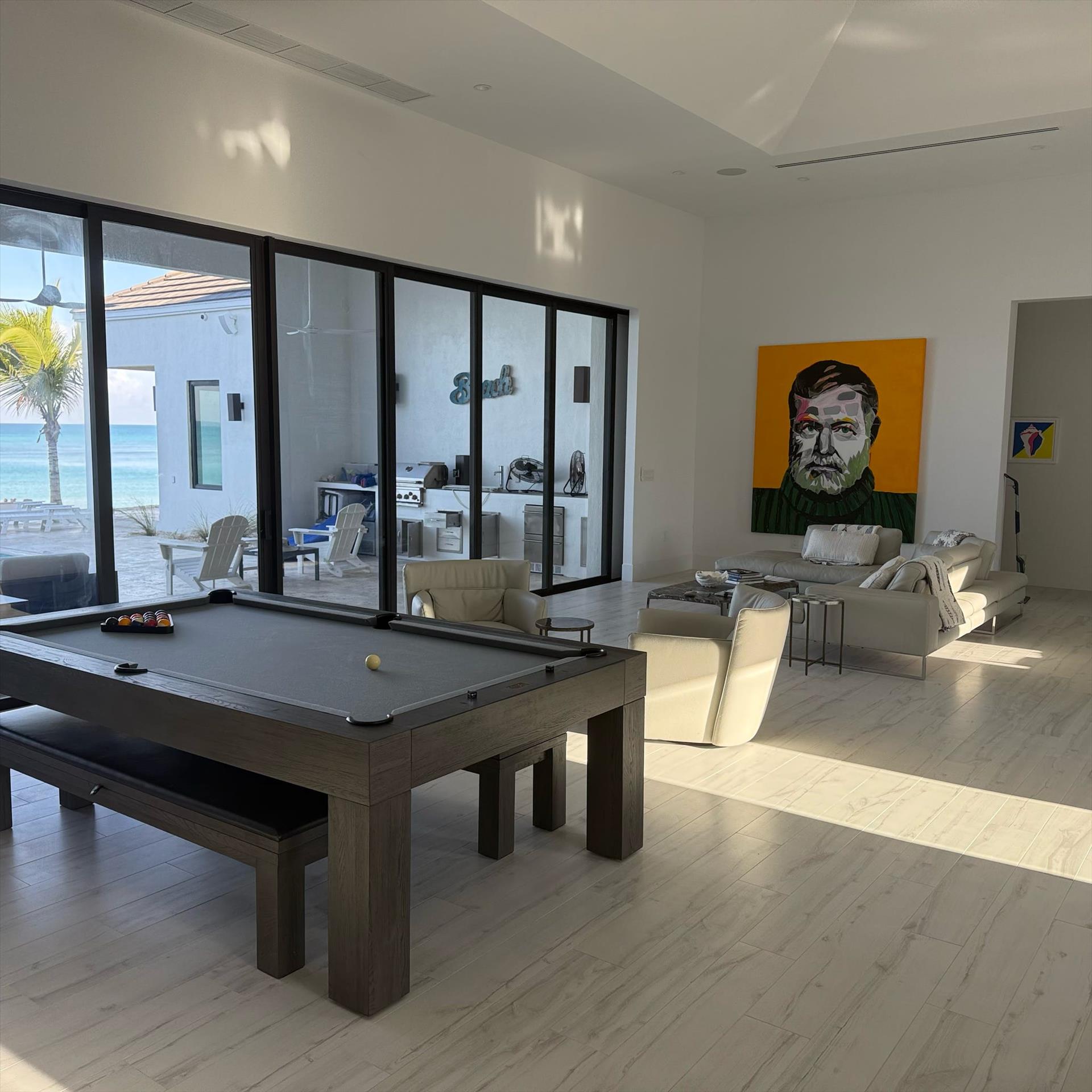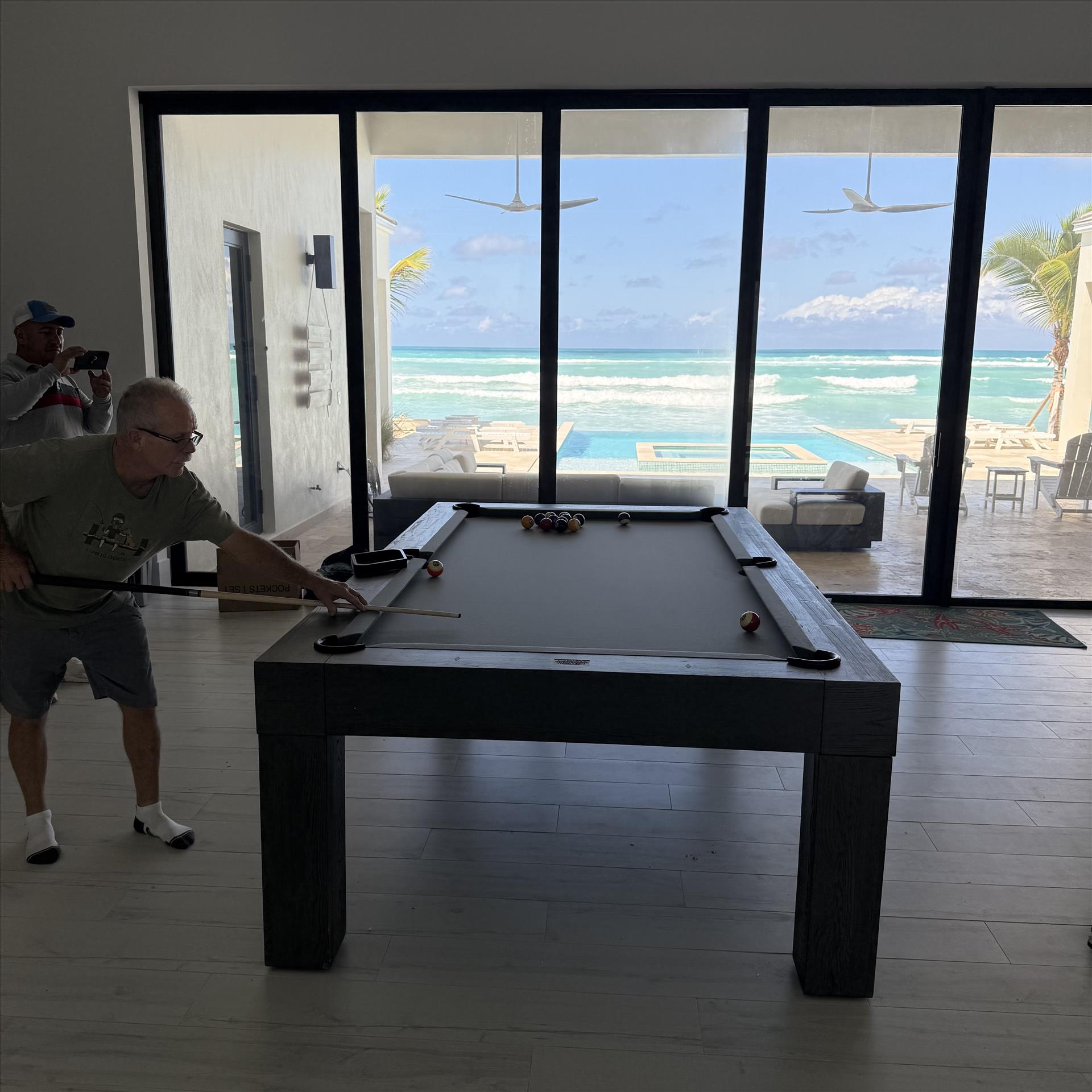 The Center Area of Estate consists of our dining area consists of a 110" Arhaus 'Petra' Dining table w/10 Anima Domus Italian leather chairs, our billiard area of The Alta 8' Slate Pool Table in marble grey finish by American Heritage Billiards. It's a perfect combination of modern design and professional performance. Its sleek, minimalist design and versatile features make it a standout centerpiece for our contemporary home. The 1-inch, 3-piece certified slate playing surface, K66 premier cushion rubber, and internal drop pockets. The black matte diamond rail sights. The Alta is as versatile as it is stylish. Has a dining top to seamlessly transform your pool table into a dining or entertaining surface. Paired with matching benches for a cohesive and functional setup. It is also paired with a ping pong tabletop for a fun game of ping Pong. Finally, our Italian leather Anima Domus 'Gamma' made sofa with Anima Domus coffee table.