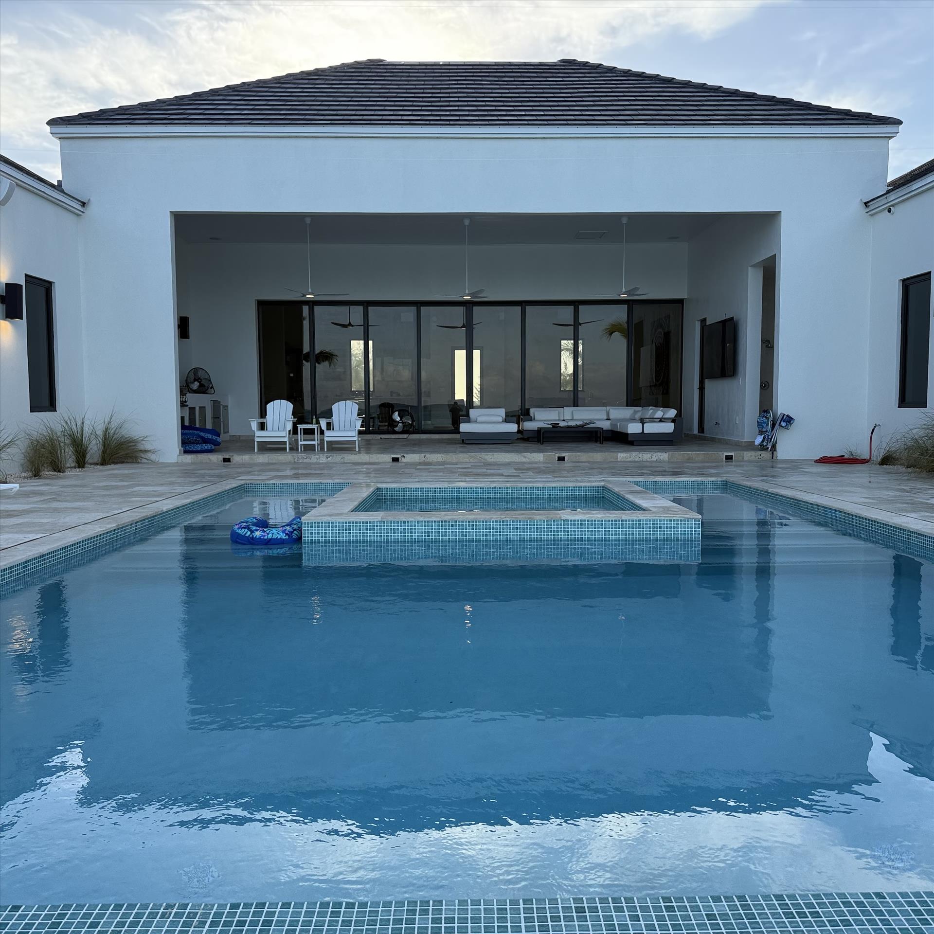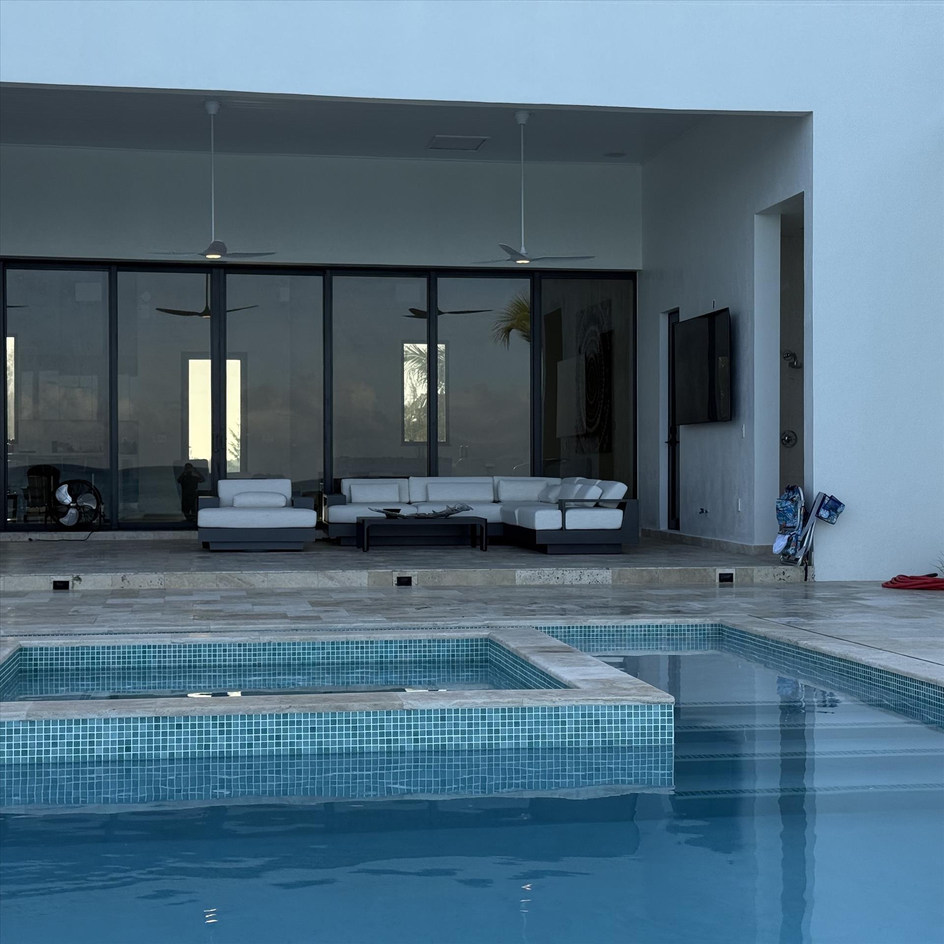 Our pool is an Infinity edge pool (20'x33.3'), Jacuzzi (10'x10'), Pool area bathroom, exterior pool shower overlooking ocean, (6) pool lounge chairs, (10) chairs, Restoration Hardware couch and chair, and BBQ area.