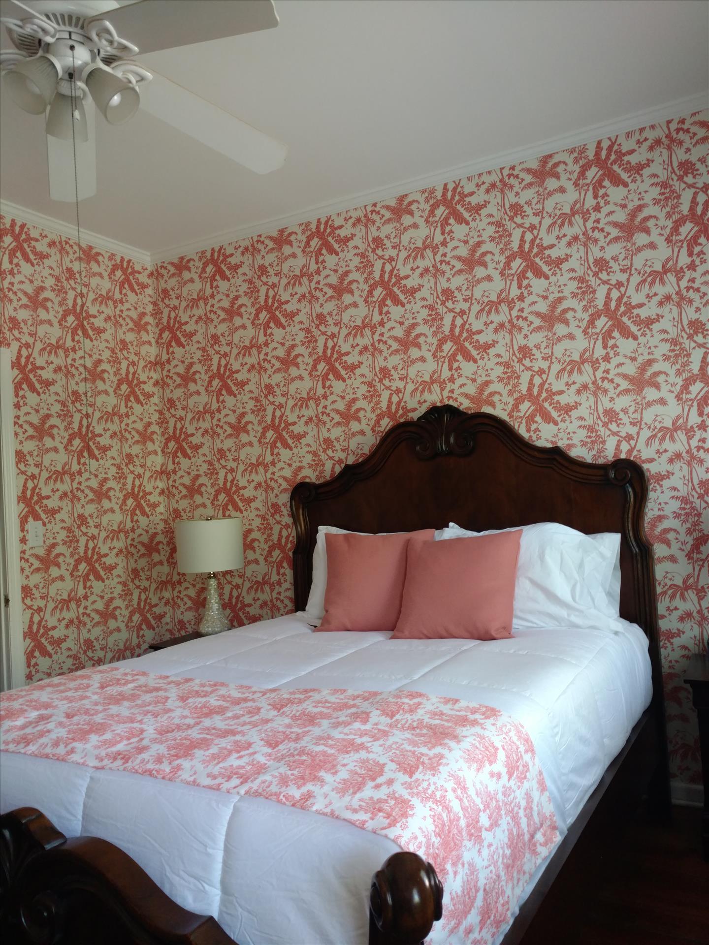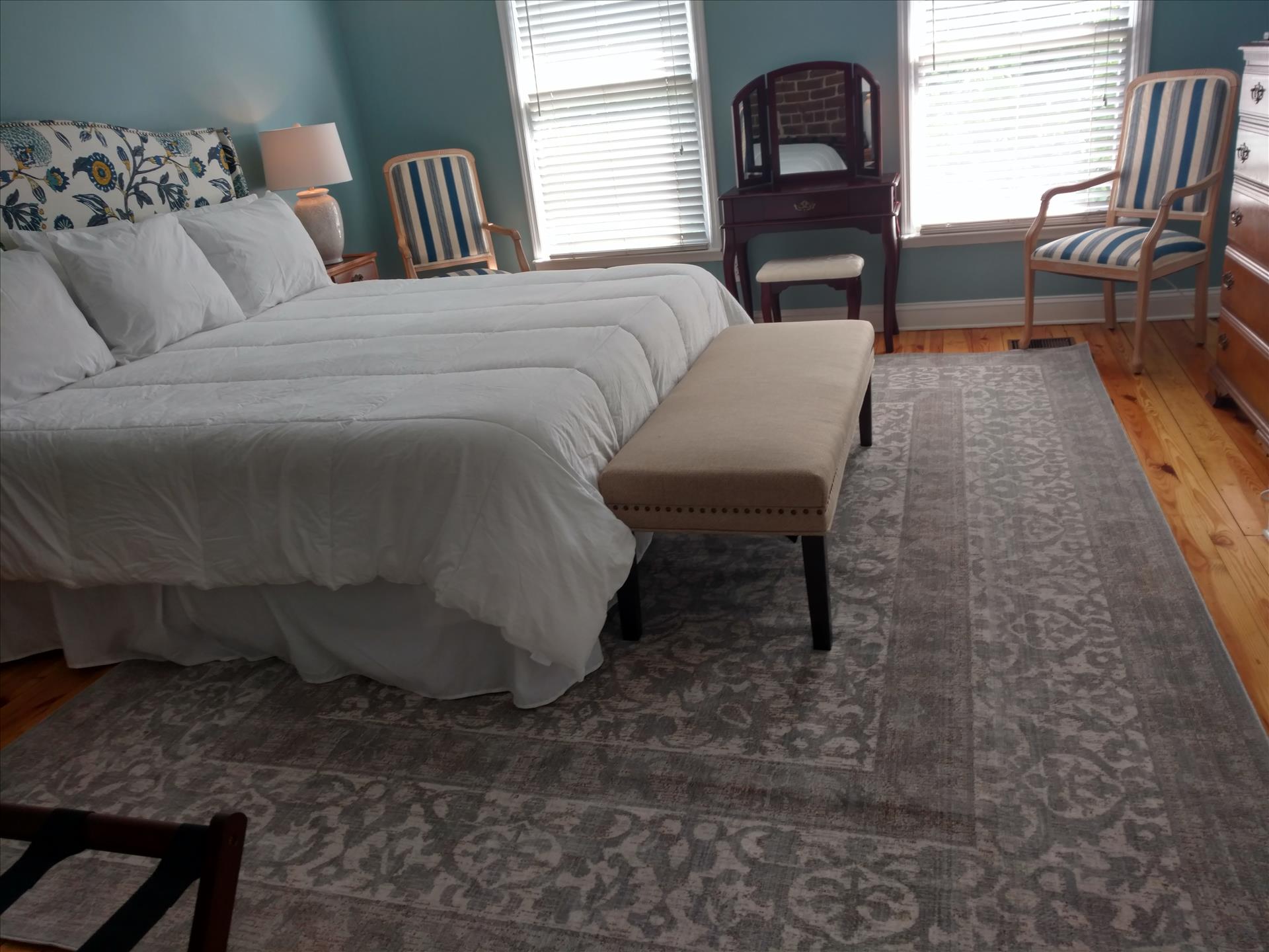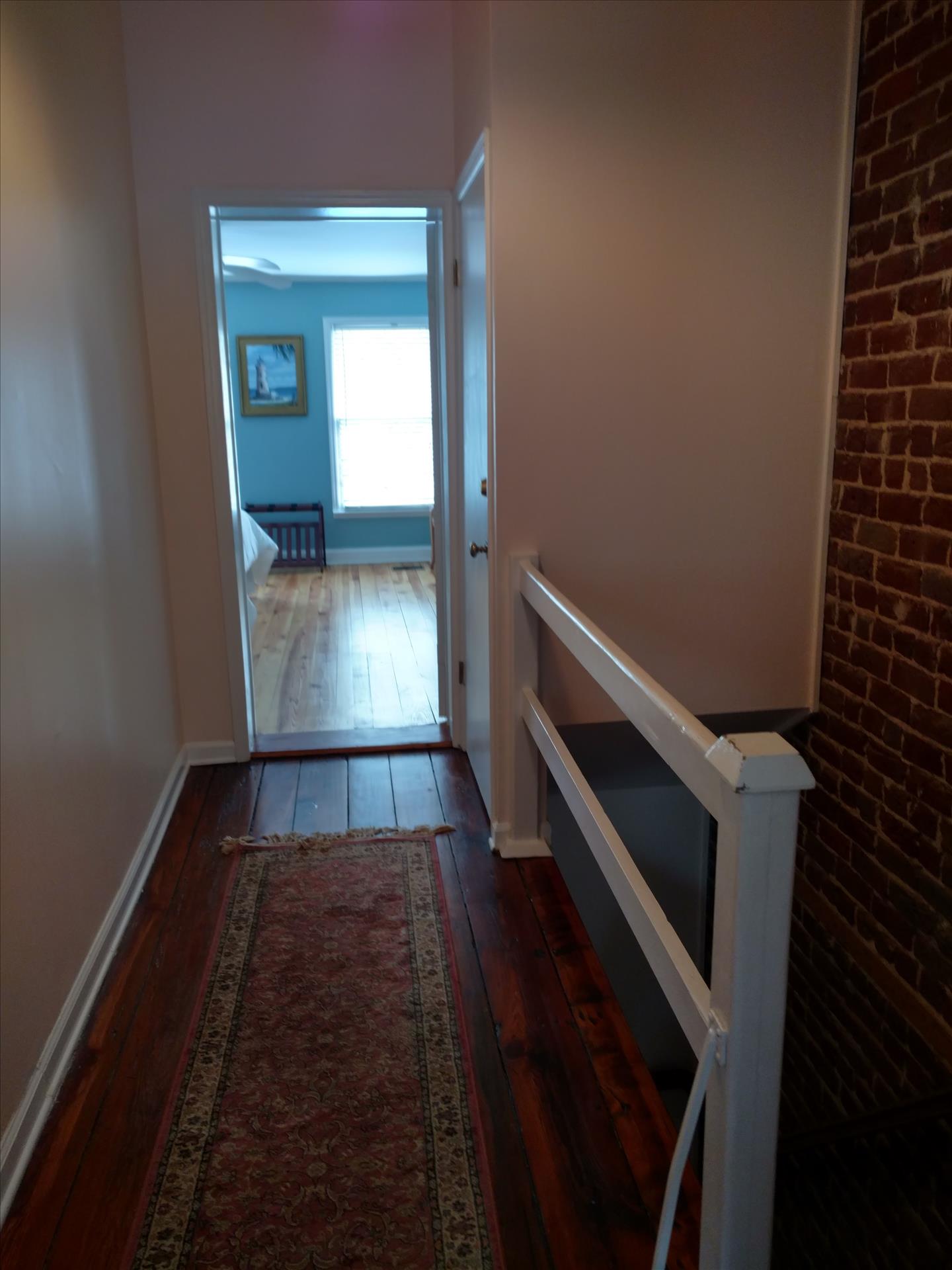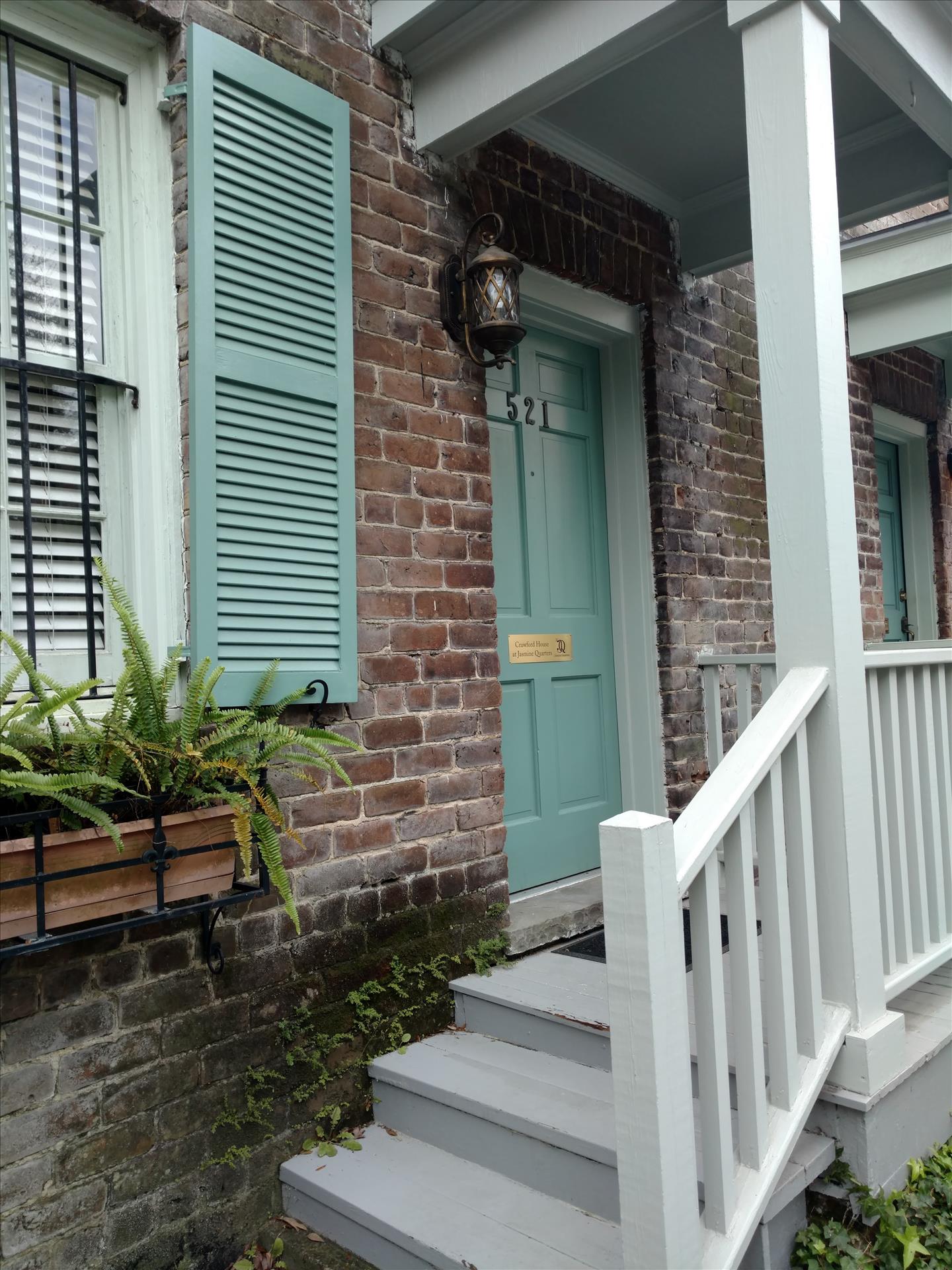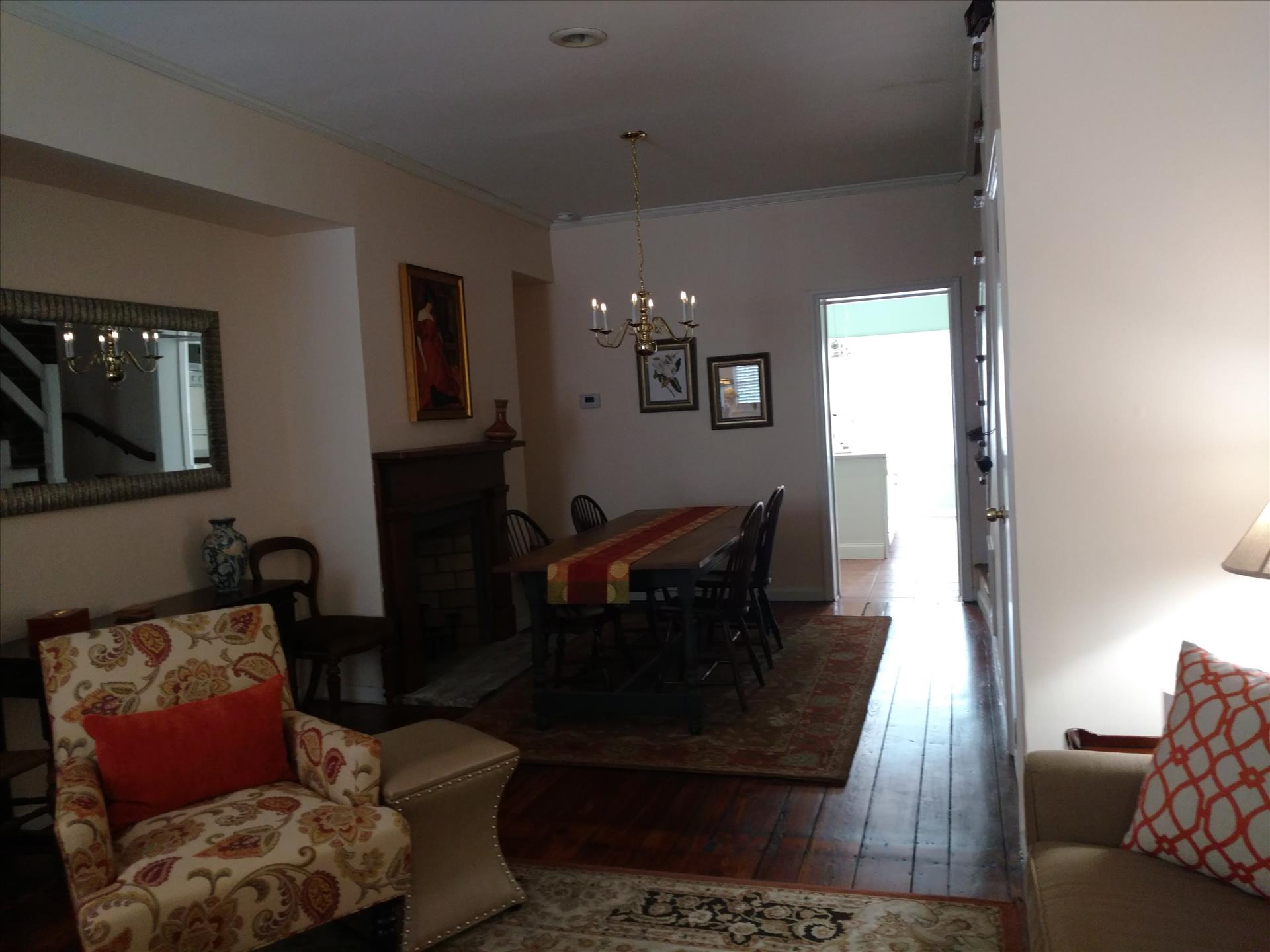 It is an 1850s two-story home with two bedrooms, 2.5 baths, living room, dining room and a newly renovated gourmet kitchen island seating for four guests facing Crawford Square.