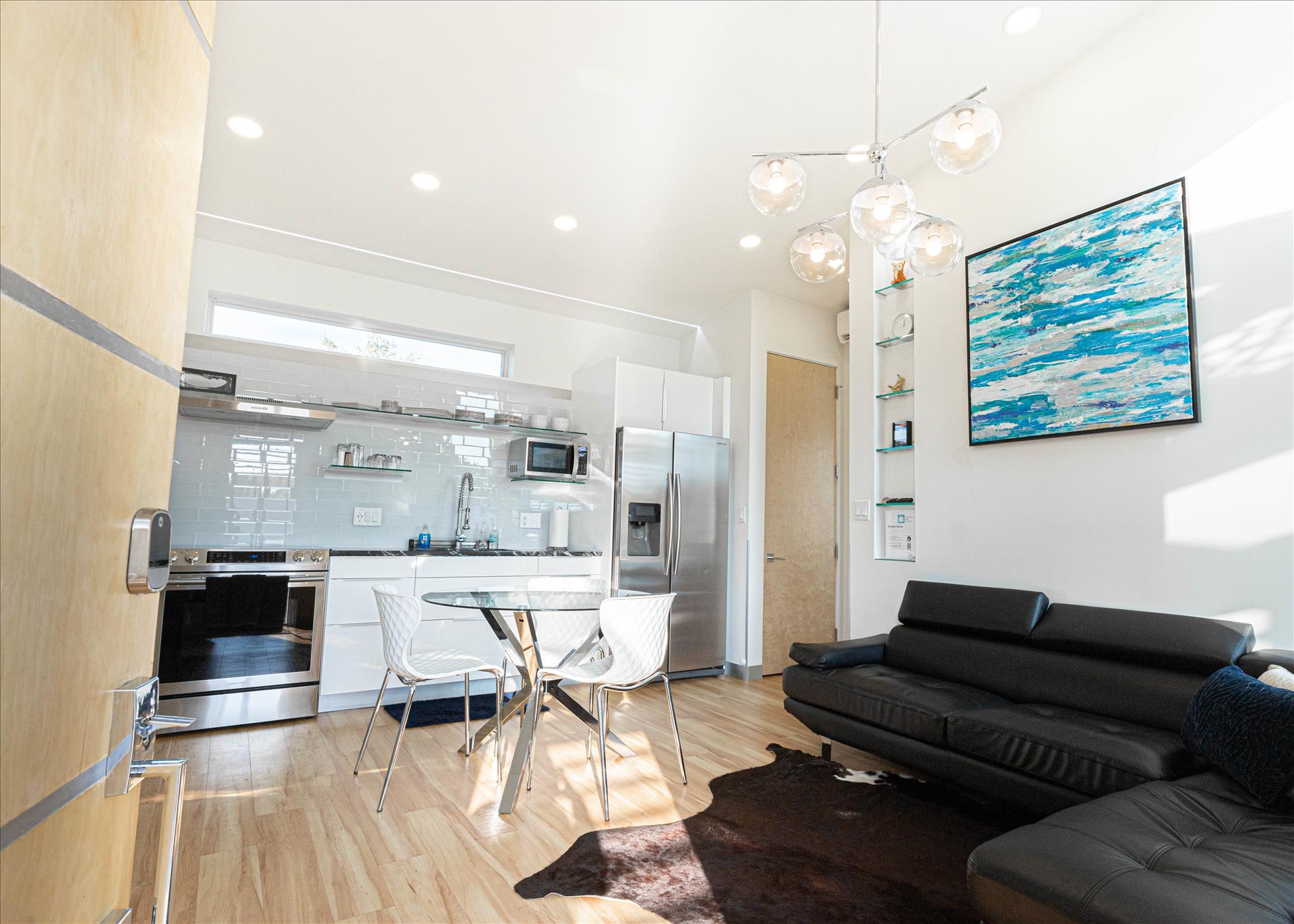 There's plenty of space to refresh and recharge in the spacious and sleek modern bathroom. Feel like royalty when you step foot onto the mosaic tiles of the European style shower. The vaulted ceiling and skylight, paired with a relaxing rainfall showerhead, ensures you leave the experience feeling invigorated and fresh. Fluffy towels, blow dryer, and shower toiletries for villa use will be provided so you can get ready for an exciting day of adventure at the lake or at one of the many trails perfect for hiking and biking. Guests will also enjoy a full size washer and dryer complete with all your laundry essentials.