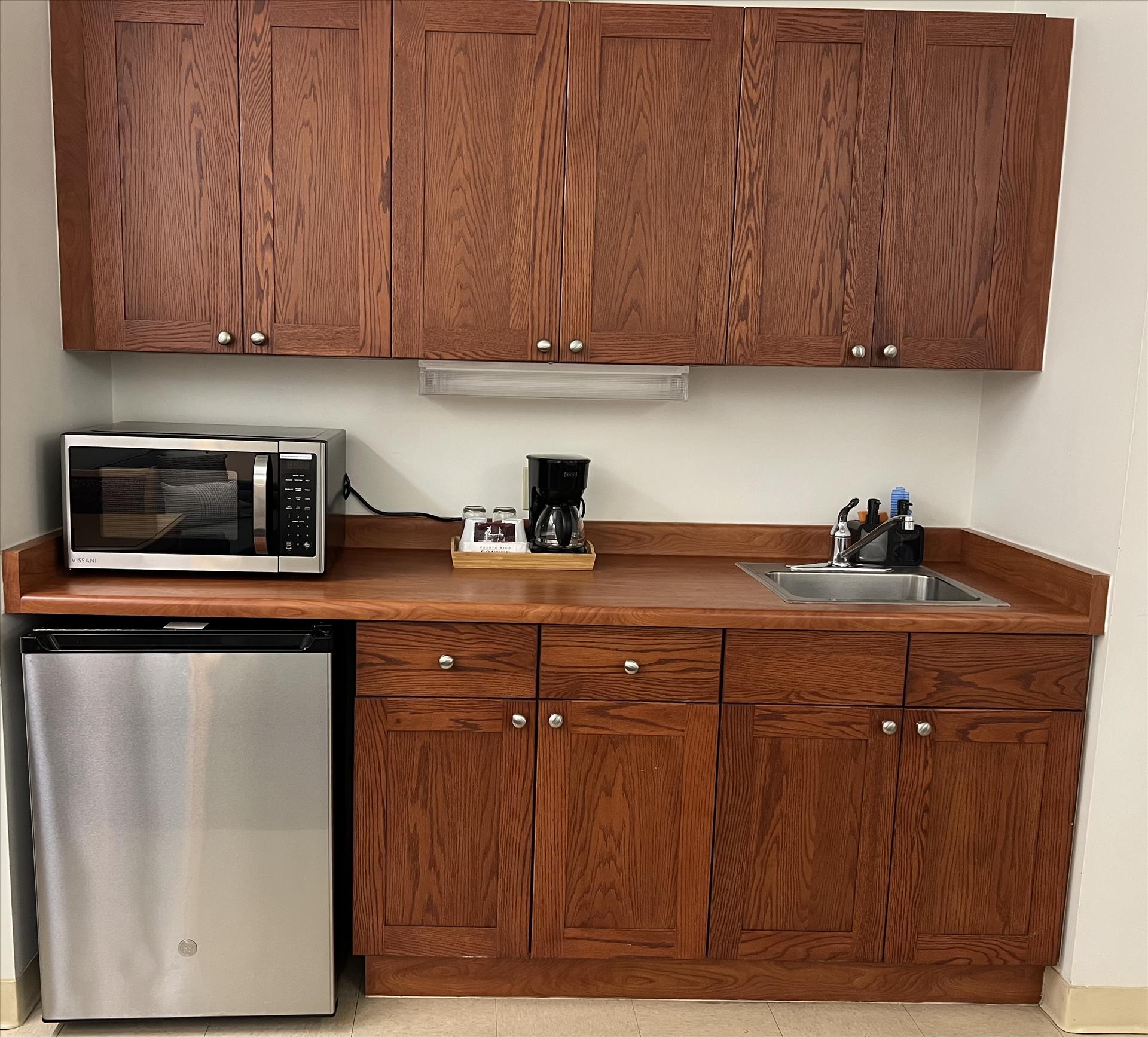 The suite features a small fridge, microwave, and coffee maker. This is a non-smoking, no pets allowed room.