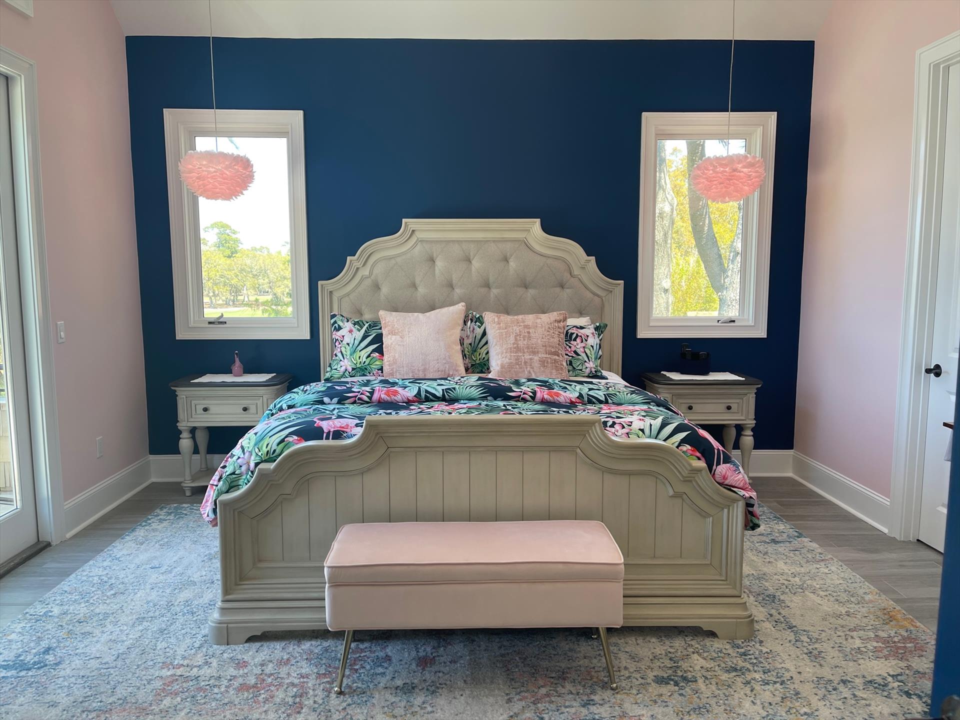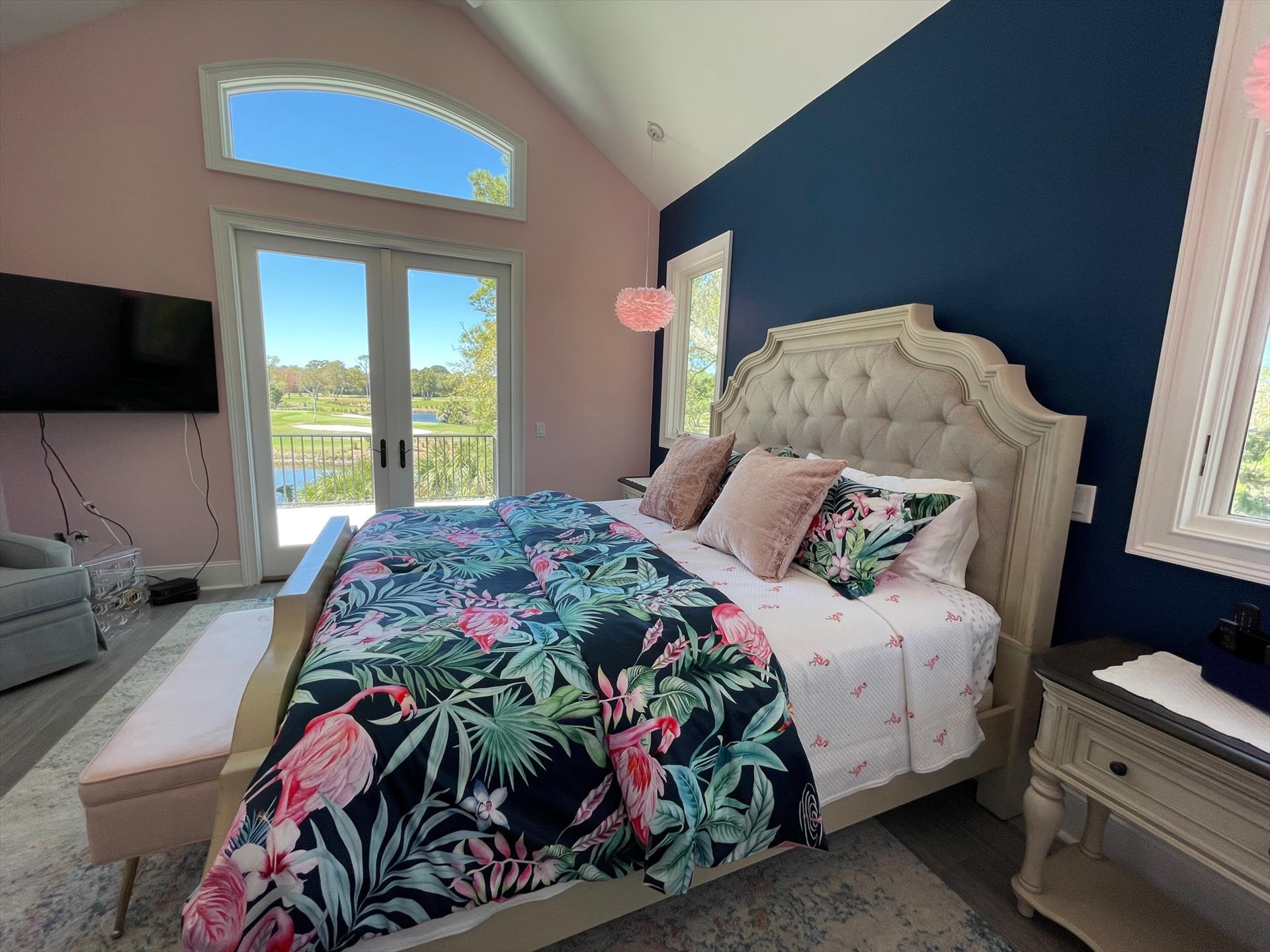 Bedroom #5: "Dancing with Flamingos" Bedroom - 1 king bed with private ensuite bath that has a clawfoot soaking tub and separate shower. Bedroom and bath are decorated in a beautiful Pink Flamingo theme. Has a 55" QLED TV