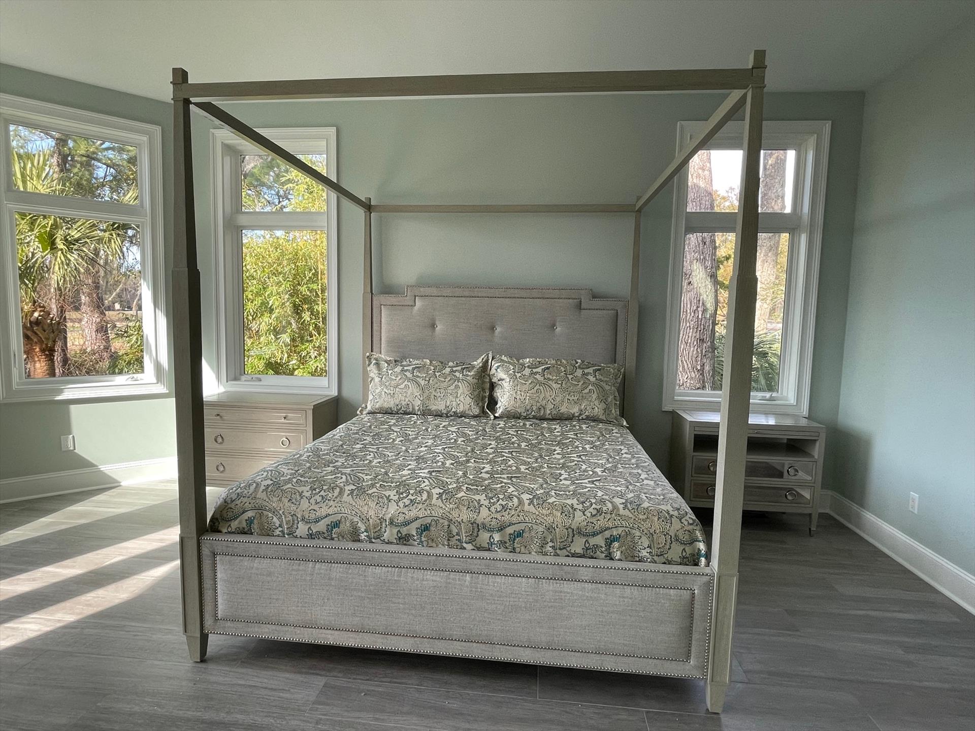 The house has been repainted inside and out in light, beachy colors. It has all new flooring and lighting, all new kitchen including new cabinets, counterops and appliances, all new bathrooms, and all new furnishings.