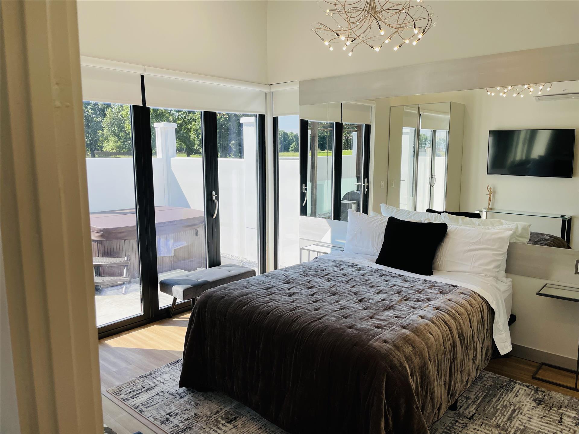 Completely relax in the two beautifully designed bedrooms, each with a roomy queen bed. Both stunning bedrooms boast high-end luxury linens, extra pillows and blankets for complete comfort, their own private bathrooms, plenty of closet space, big open window walls, mirrors and gorgeous chandeliers for an open and upscale feel.