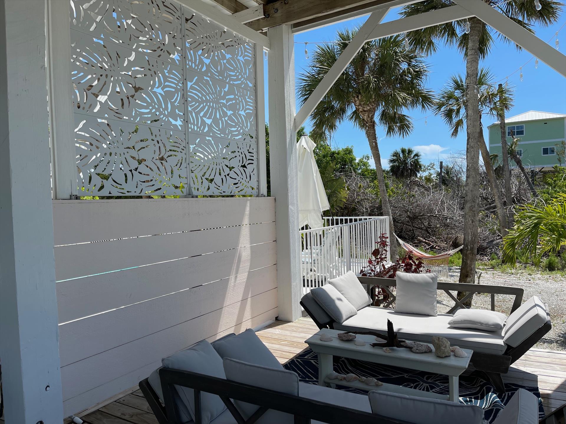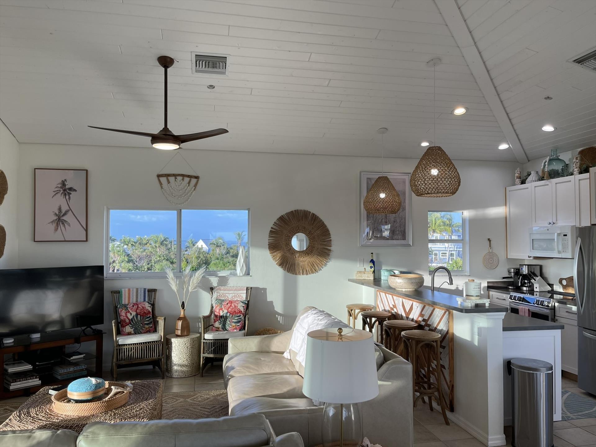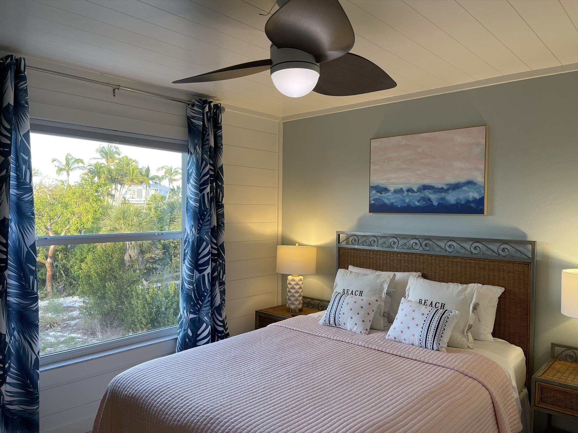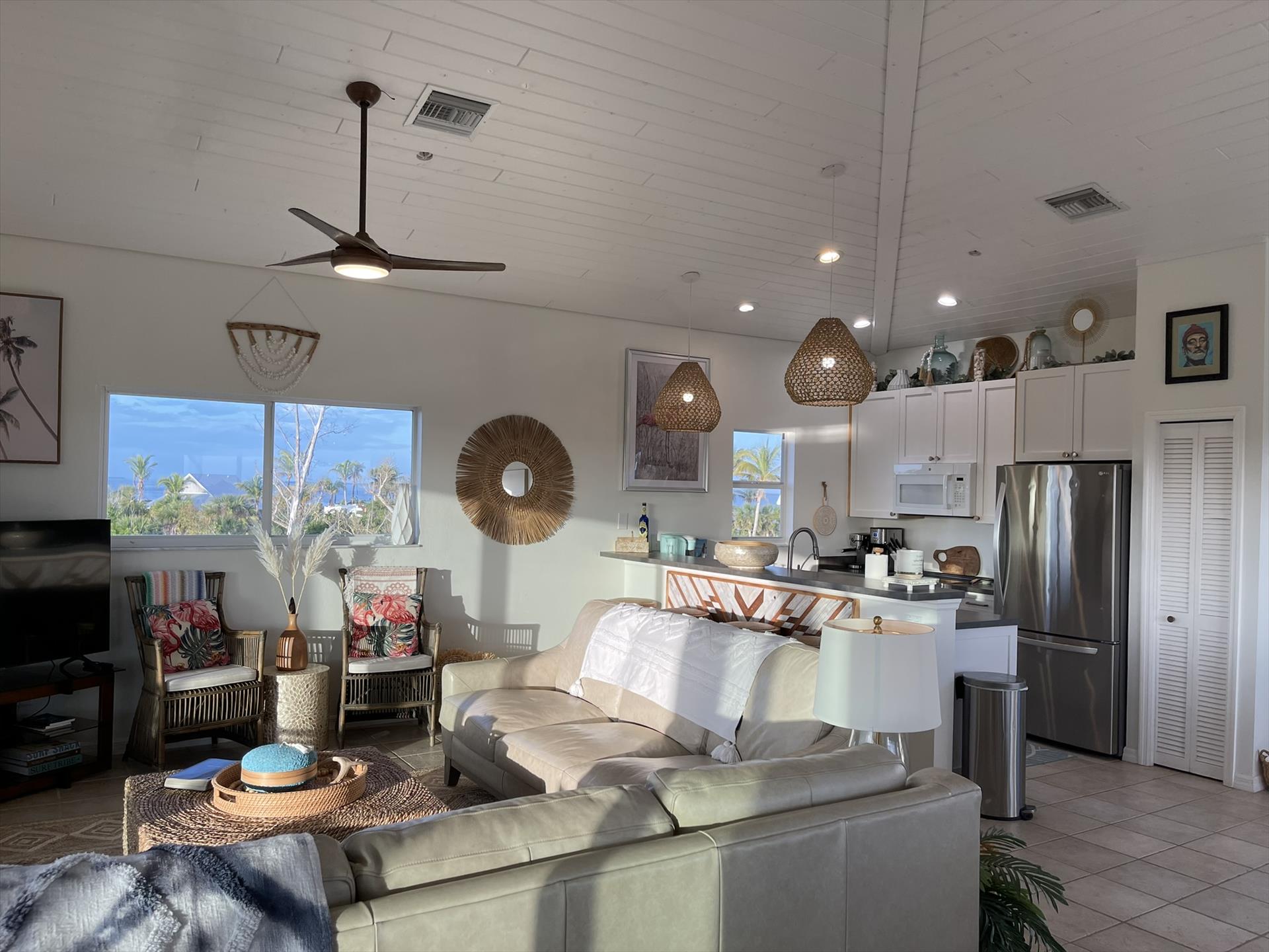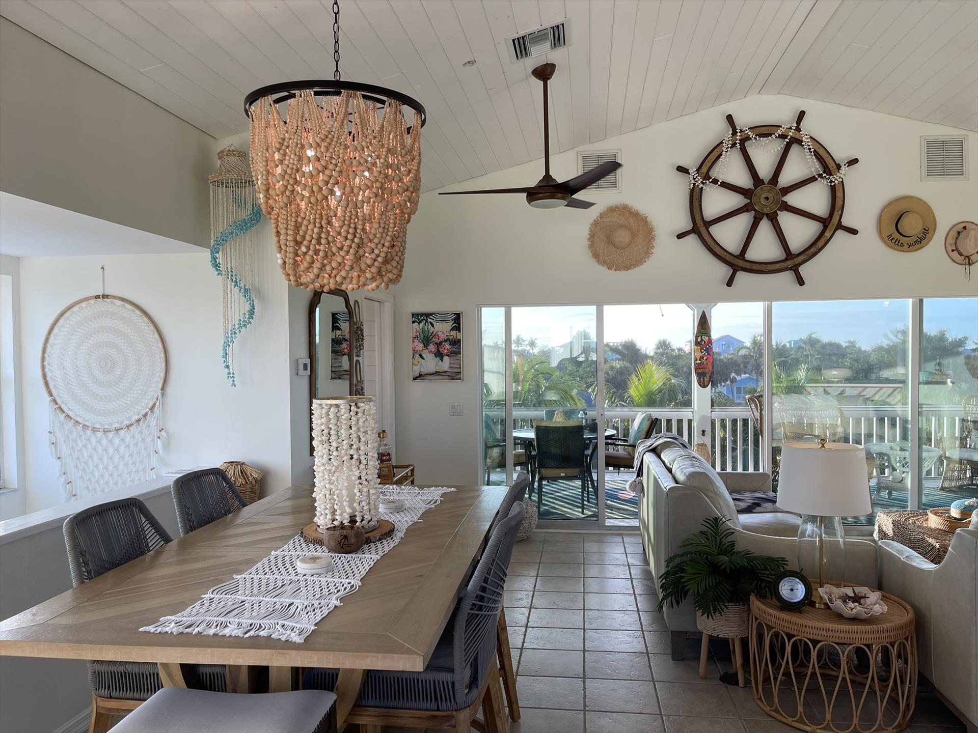Stepping into the Paloma Beach House will bring you to the recently remodeled and refurnished bedroom level – situated one level down from the expansive great room, dining area, and scenic tree-top vistas. In all levels of this island home, you will be taken away by the fresh Boho beach styling – as well as the vaulted wood ceilings and Florida Cyprus beams found on the great room level.