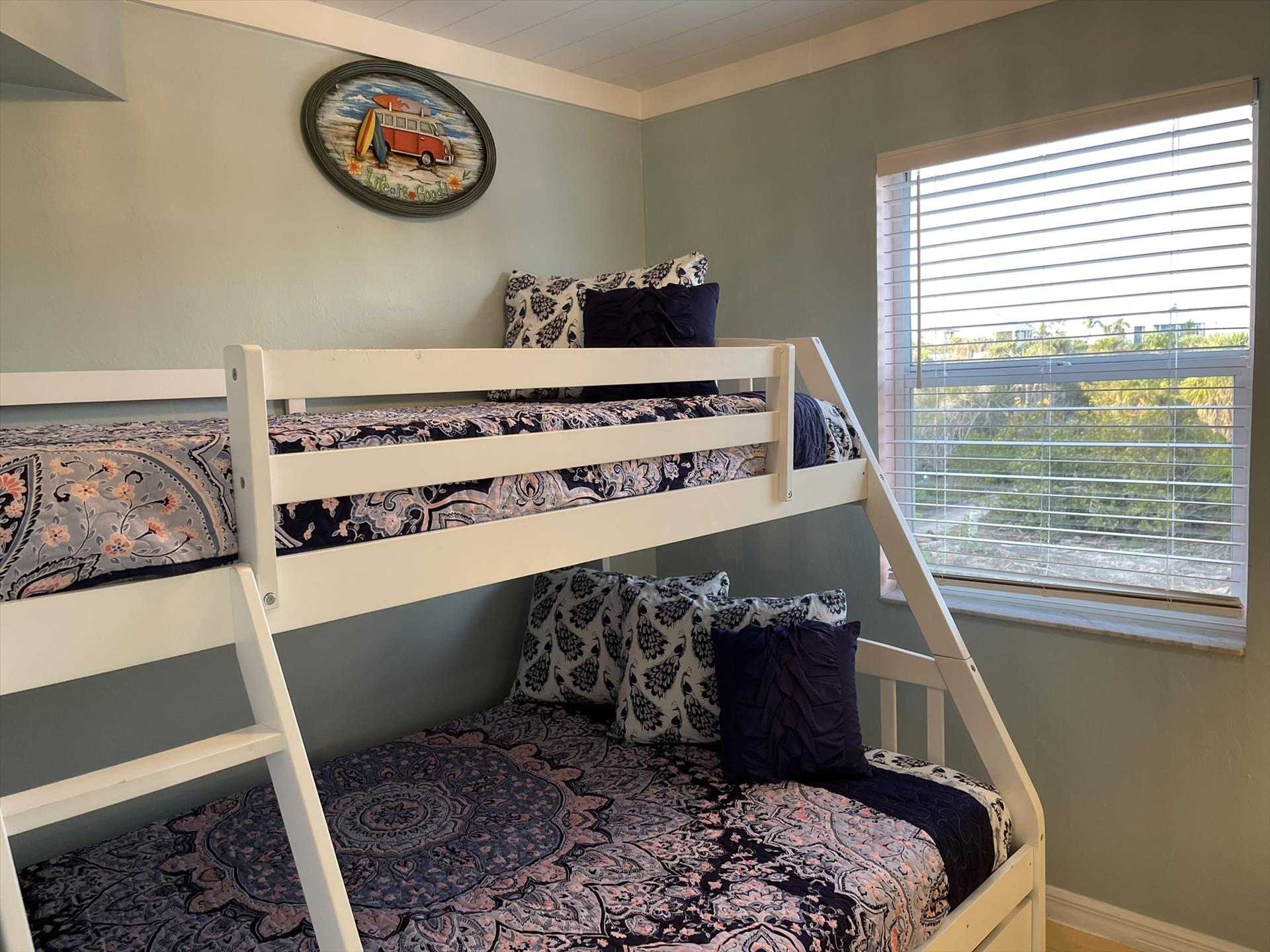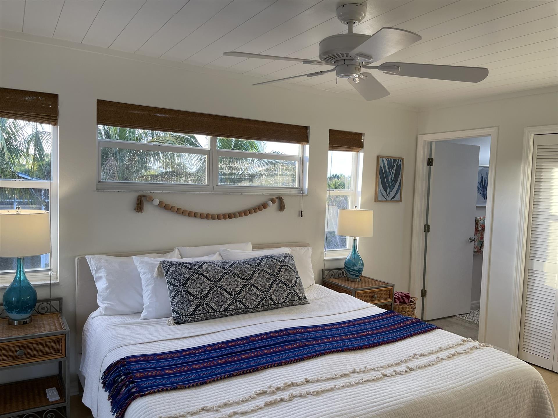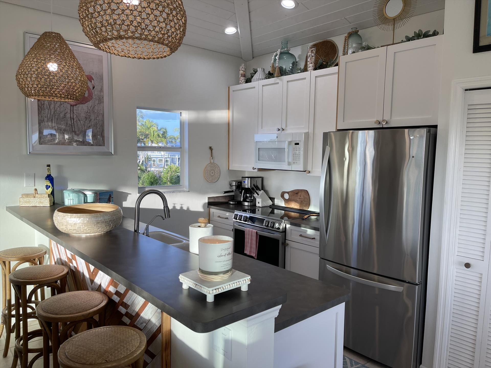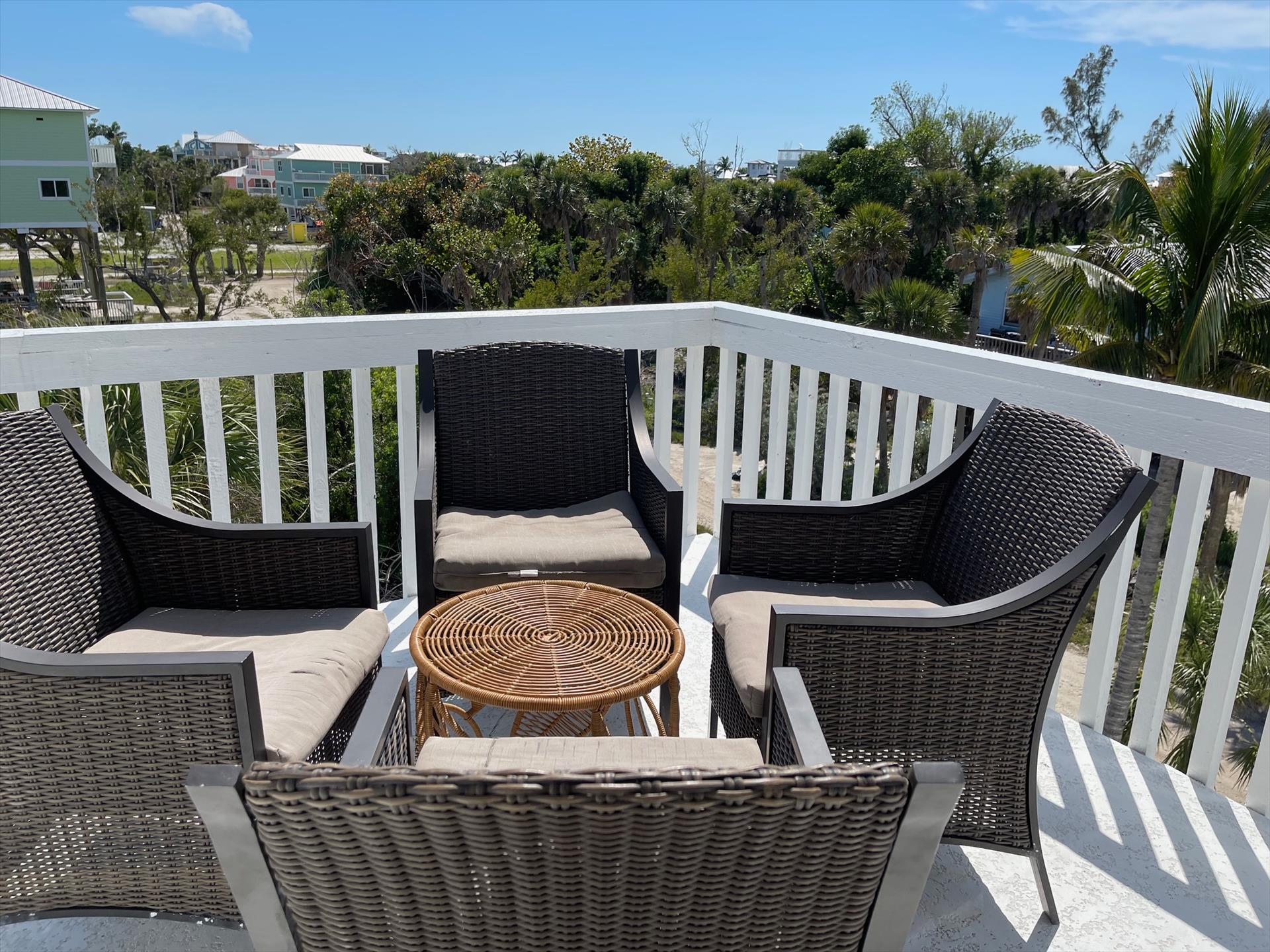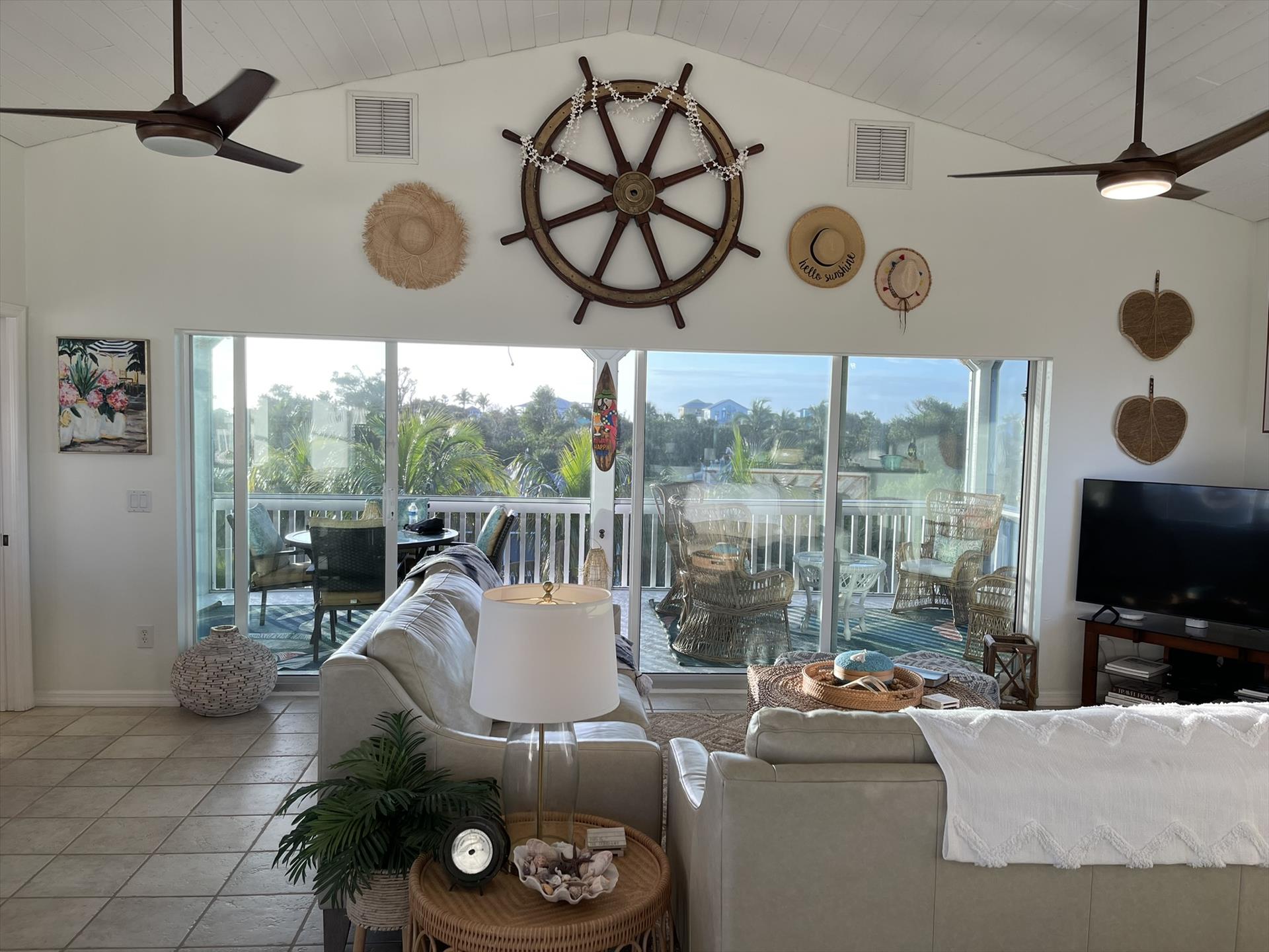 Stepping into the Paloma Beach House will bring you to the recently remodeled and refurnished bedroom level – situated one level down from the expansive great room, dining area, and scenic tree-top vistas. In all levels of this island home, you will be taken away by the fresh Boho beach styling – as well as the vaulted wood ceilings and Florida Cyprus beams found on the great room level.