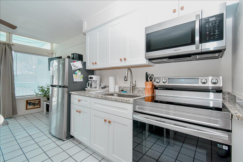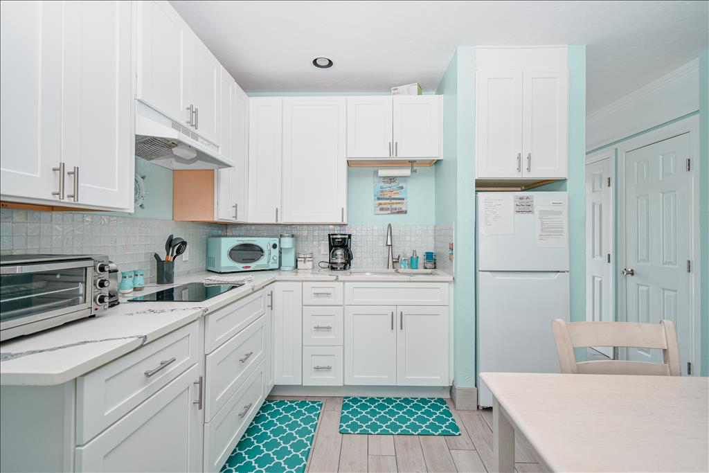 Welcome to our little slice of Old Florida heaven! This fully remodeled 1st floor condo features a fully stocked kitchen with a refrigerator, stove top and microwave...