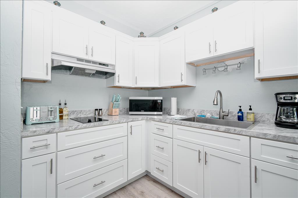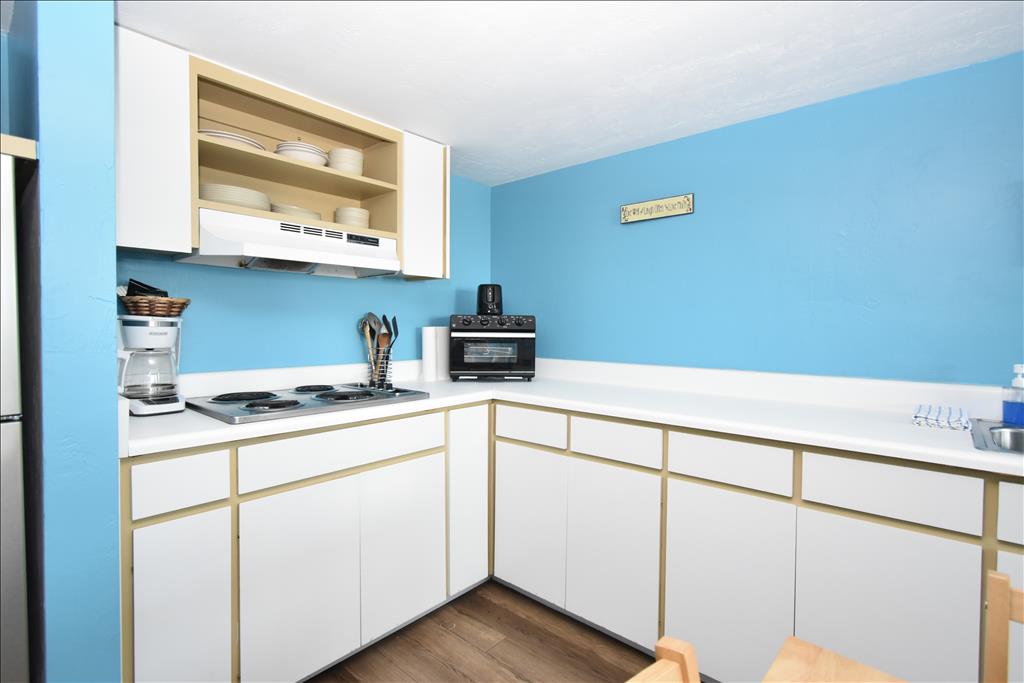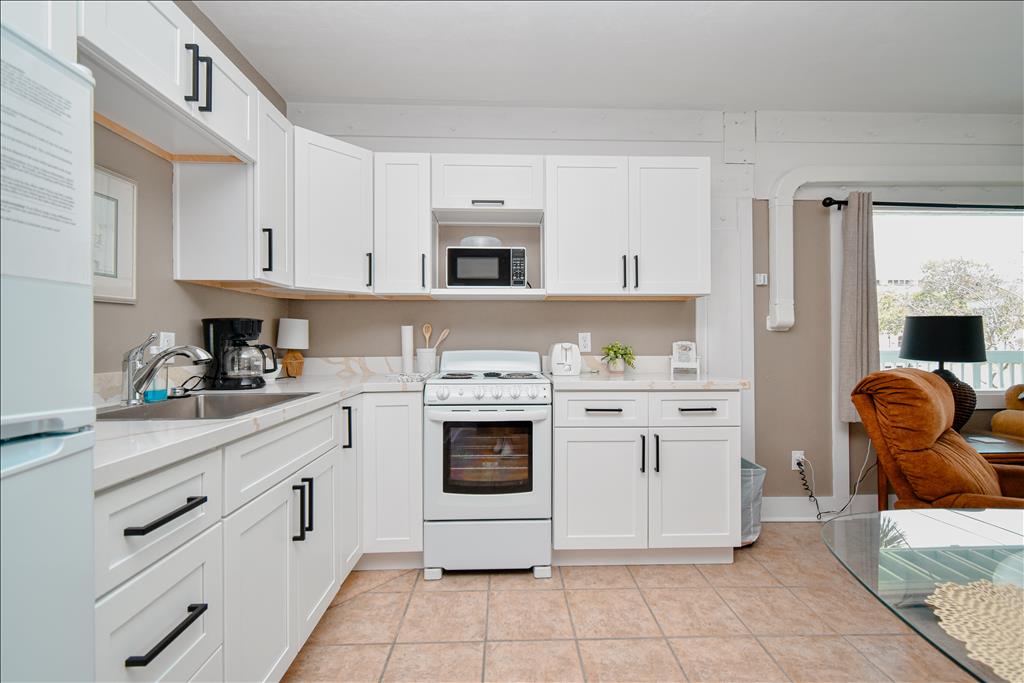 This newly renovated unit has a beautiful view with comfortable seating, perfectly cozy for a home away from home. The kitchen has a 4 burner stove, microwave, toast...