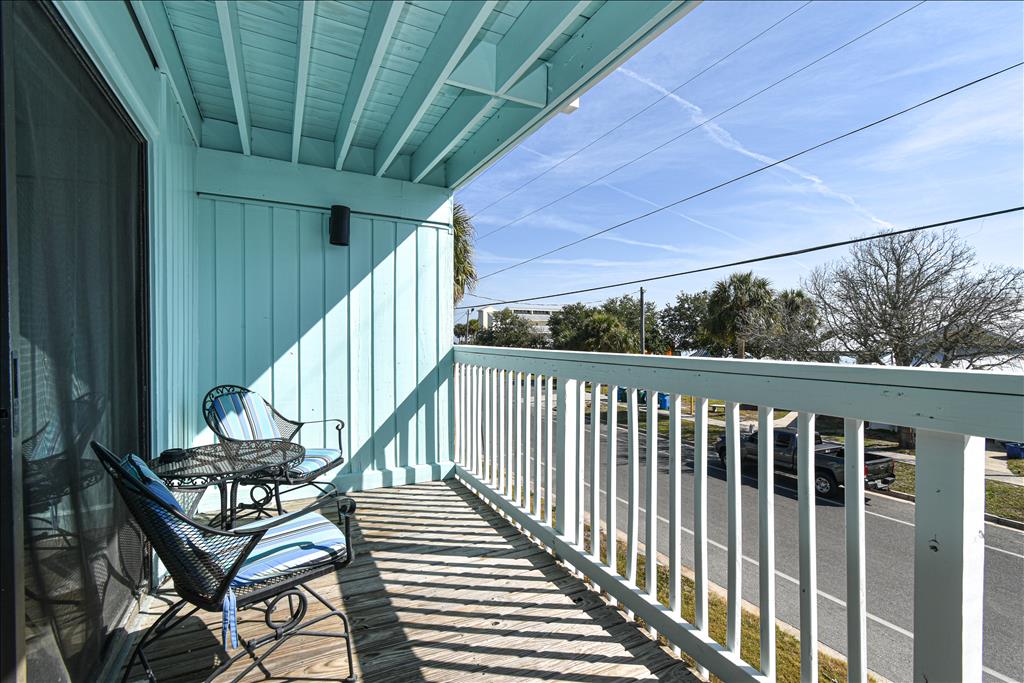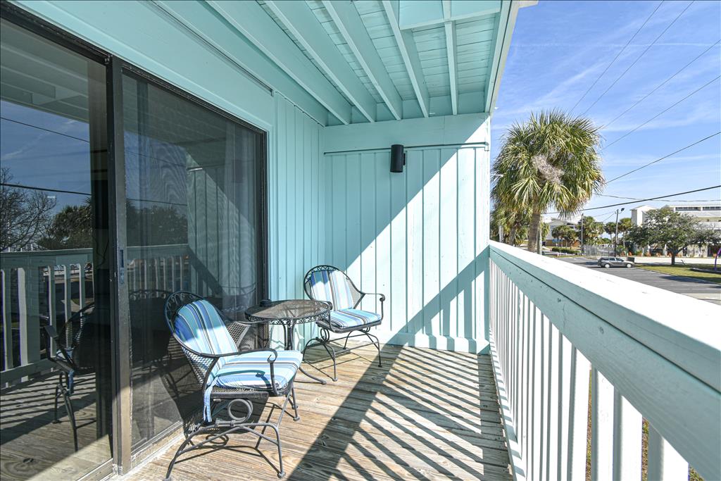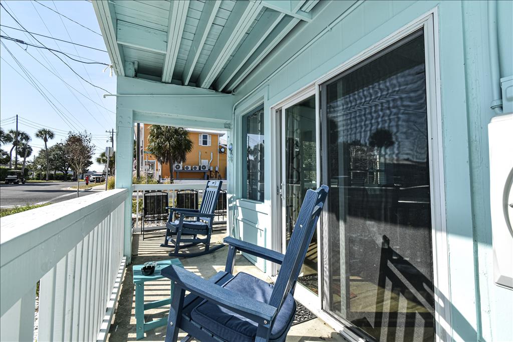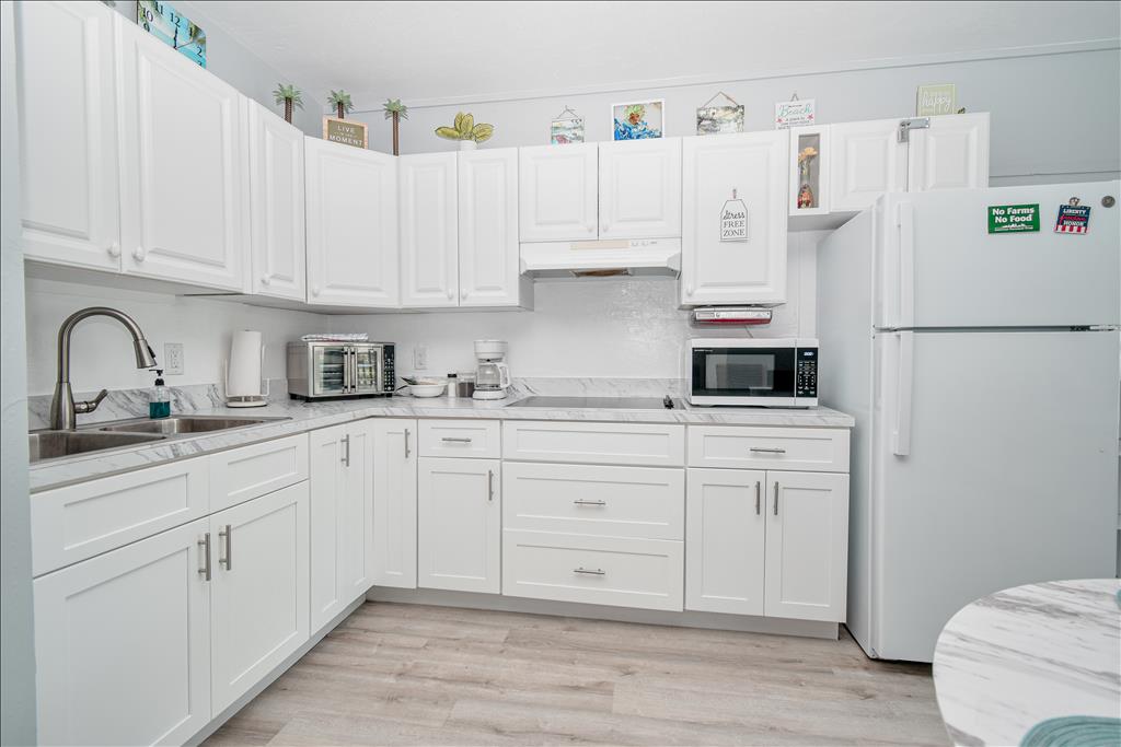 This corner unit has a wrap around porch, perfect for people watching. The kitchen has a 4 burner stove, microwave, toaster, coffee maker and refrigerator. See you soon!