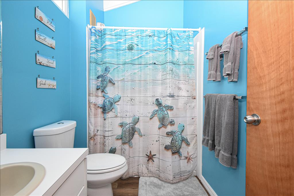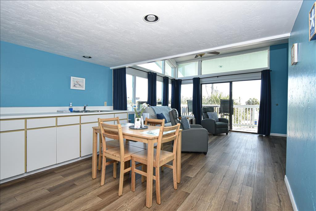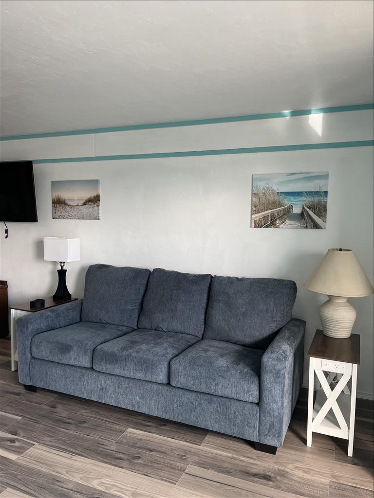 This beach style unit features laminate wood floors, a king bed and a futon sofa for your additional guests or kids. The kitchen has a 4-burner stove, microwave, cof...
