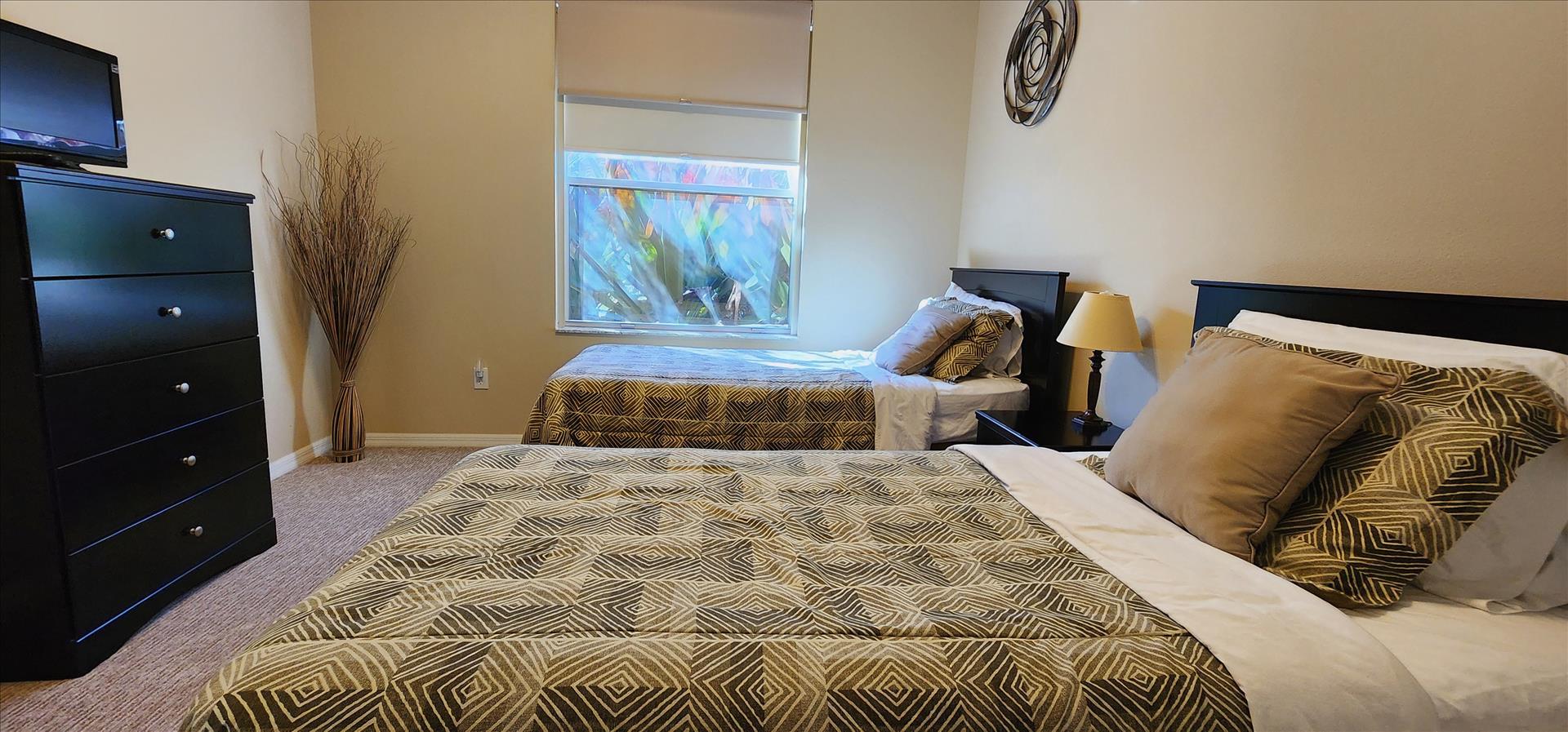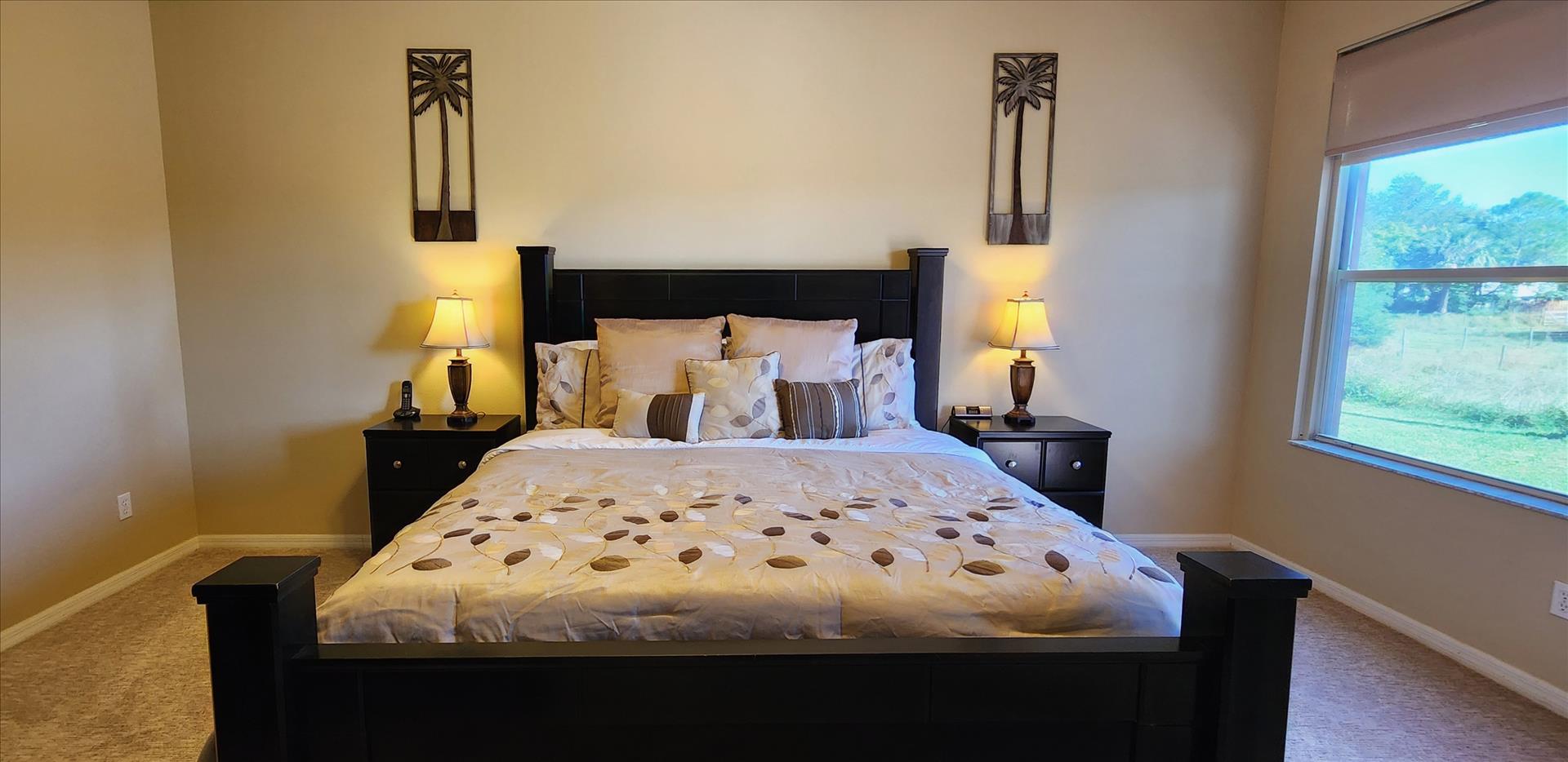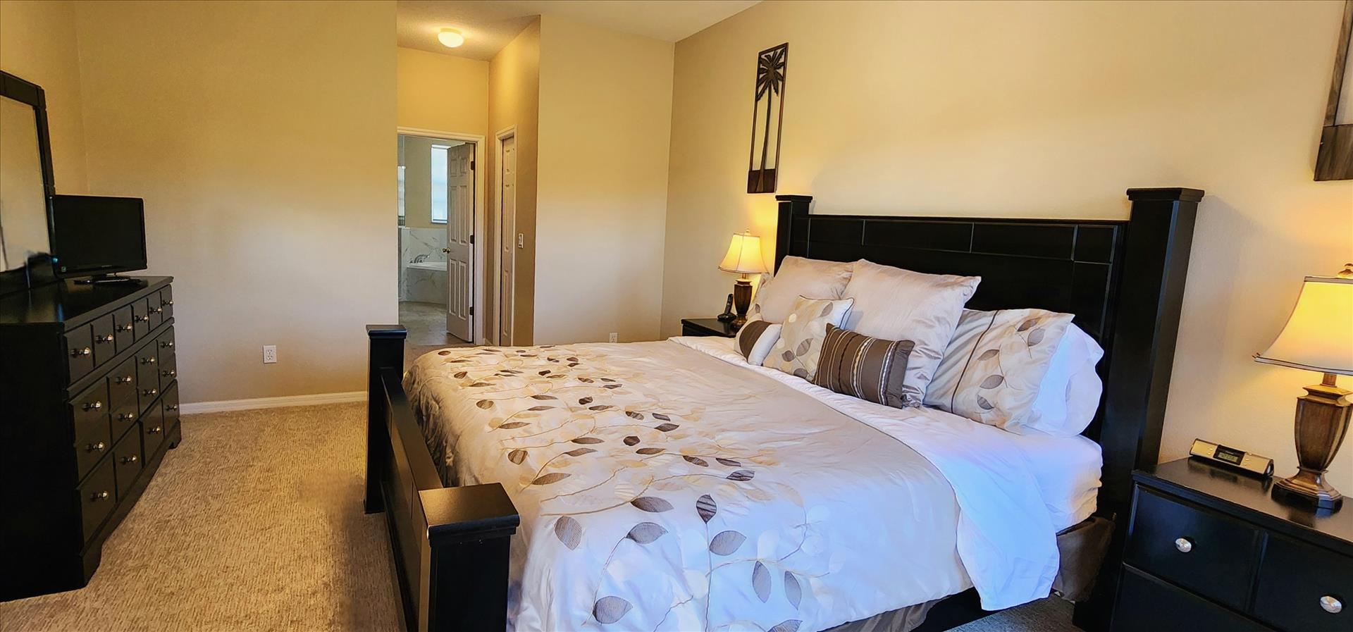 Our villa offers 4 beautifully appointed bedrooms. The two primary suites, each with a king-sized BeautyRest Disney Deluxe Resorts mattress, provide ultimate privacy and comfort. The third bedroom, adorned with soothing blues, features a queen-sized BeautyRest Disney Deluxe Resorts mattress, while the fourth room has twin beds with an African theme. Every bedroom is equipped with a TV, ceiling fan, and blackout/light-filtering shades for a restful night's sleep.