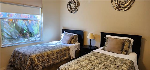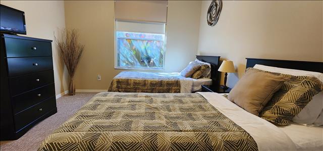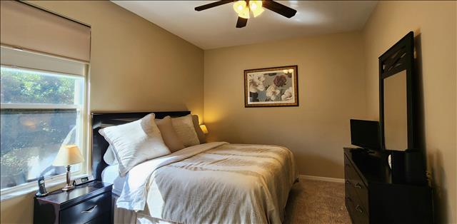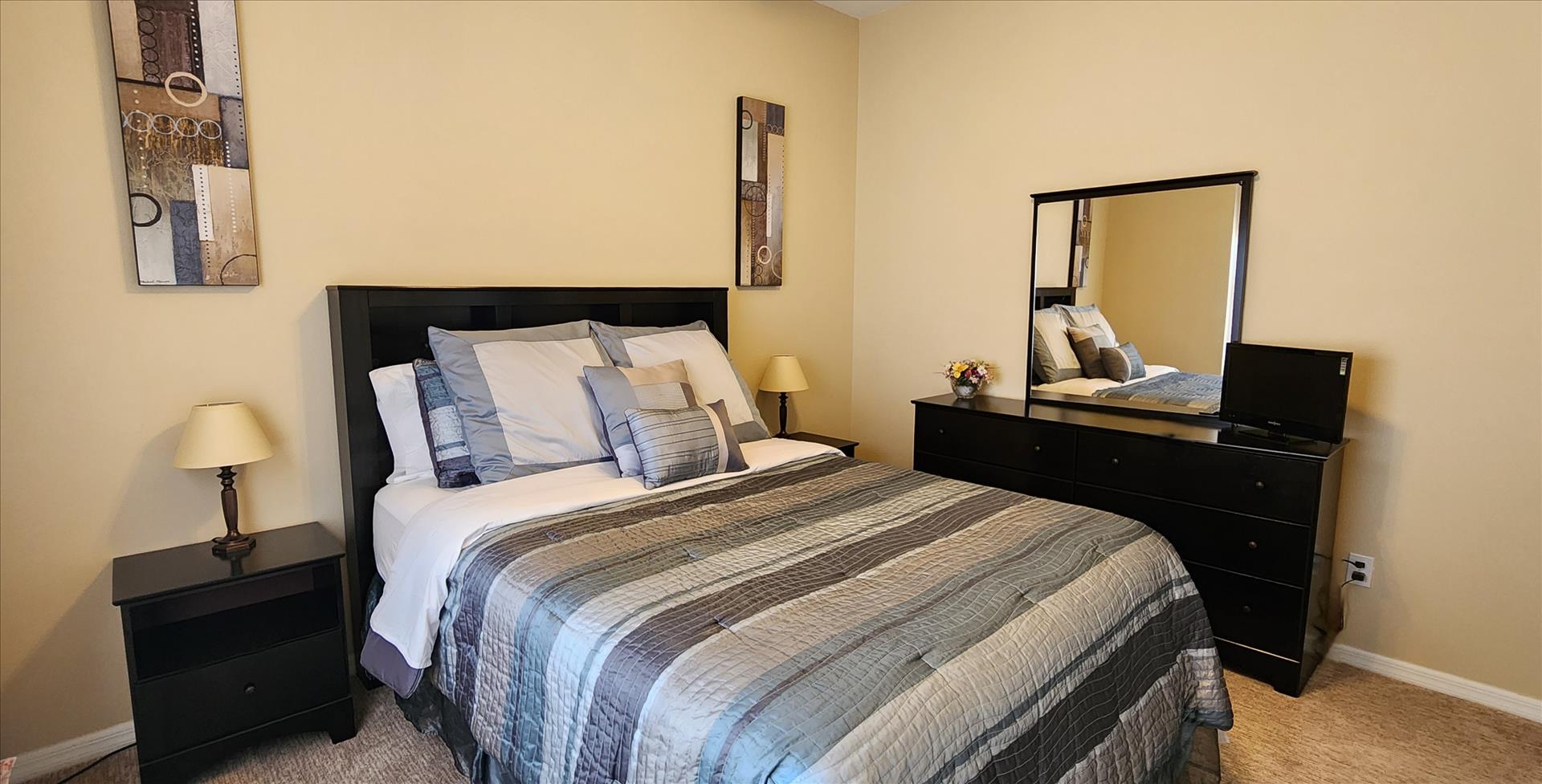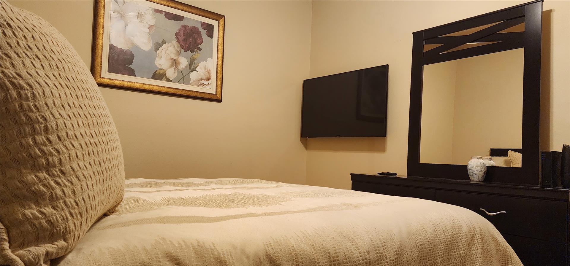 Our villa offers 4 beautifully appointed bedrooms. The two primary suites, each with a king-sized BeautyRest Disney Deluxe Resorts mattress, provide ultimate privacy and comfort. The third bedroom, adorned with soothing blues, features a queen-sized BeautyRest Disney Deluxe Resorts mattress, while the fourth room has twin beds with an African theme. Every bedroom is equipped with a TV, ceiling fan, and blackout/light-filtering shades for a restful night's sleep.