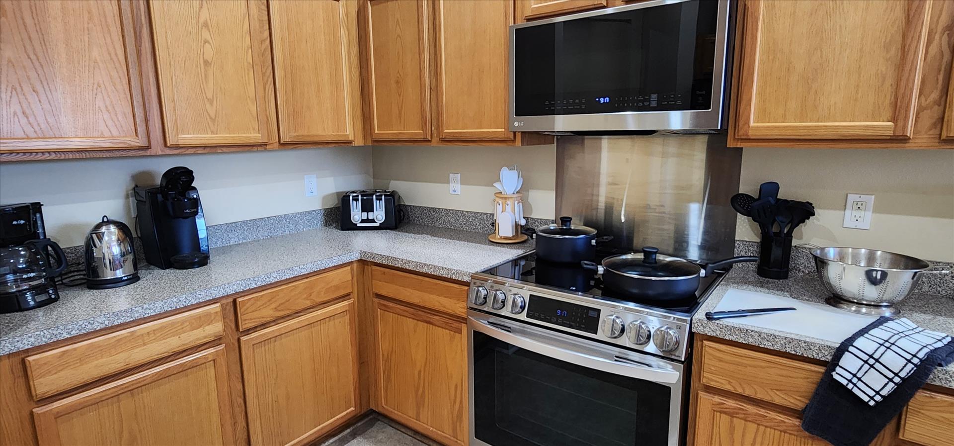 Gourmet Kitchen:Our fully equipped kitchen boasts top-of-the-line appliances, including a convection oven, microwave, and a large refrigerator with an ice maker. You'll find everything you need to prepare delicious meals, from cookware to dining ware.