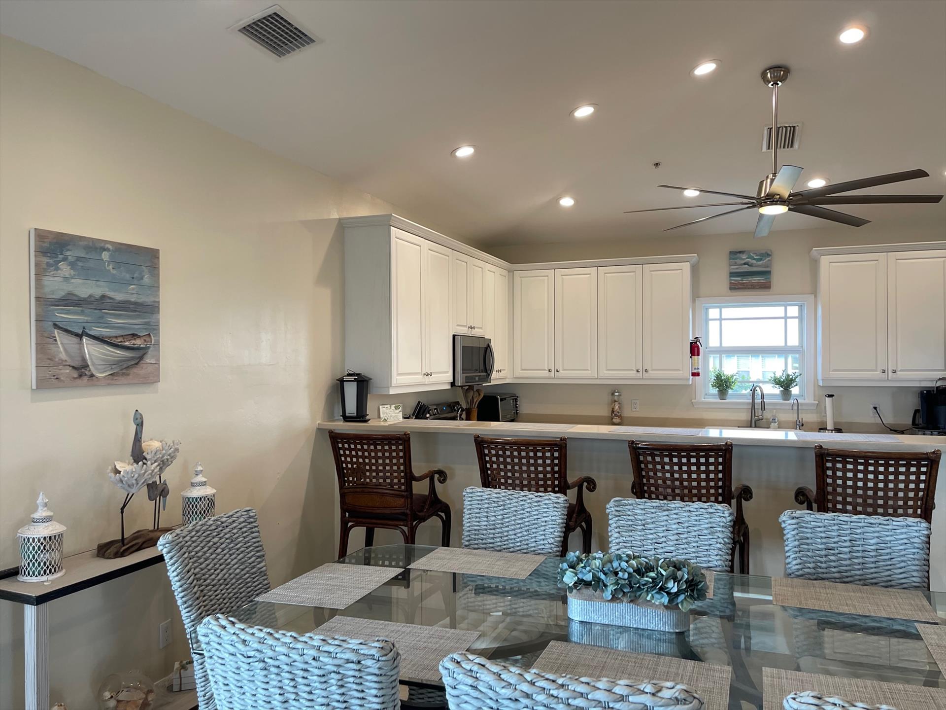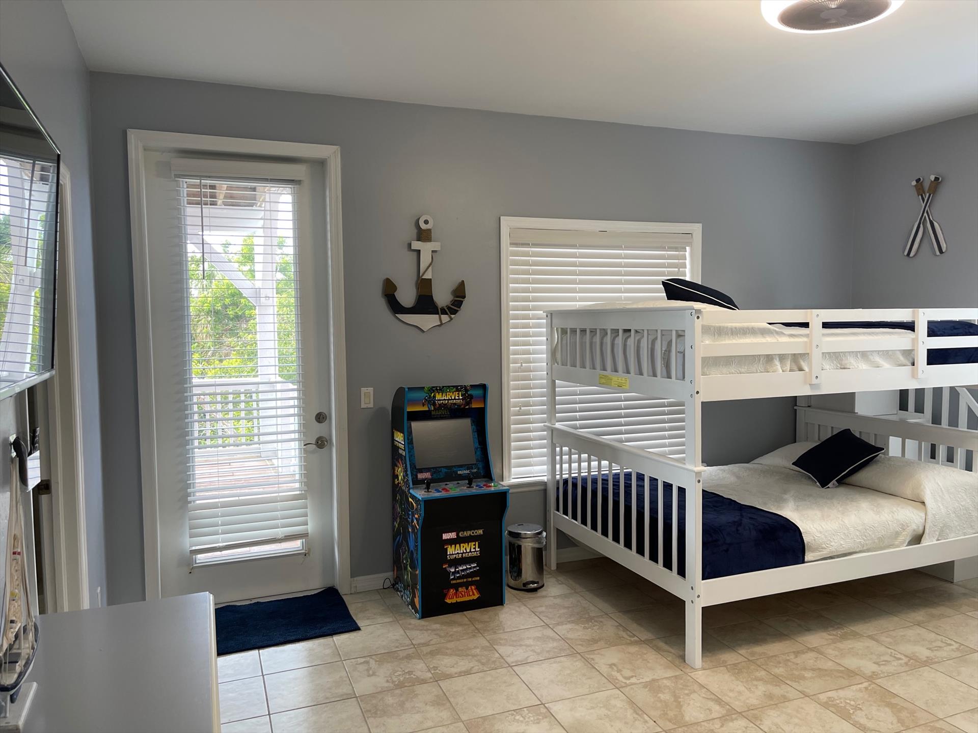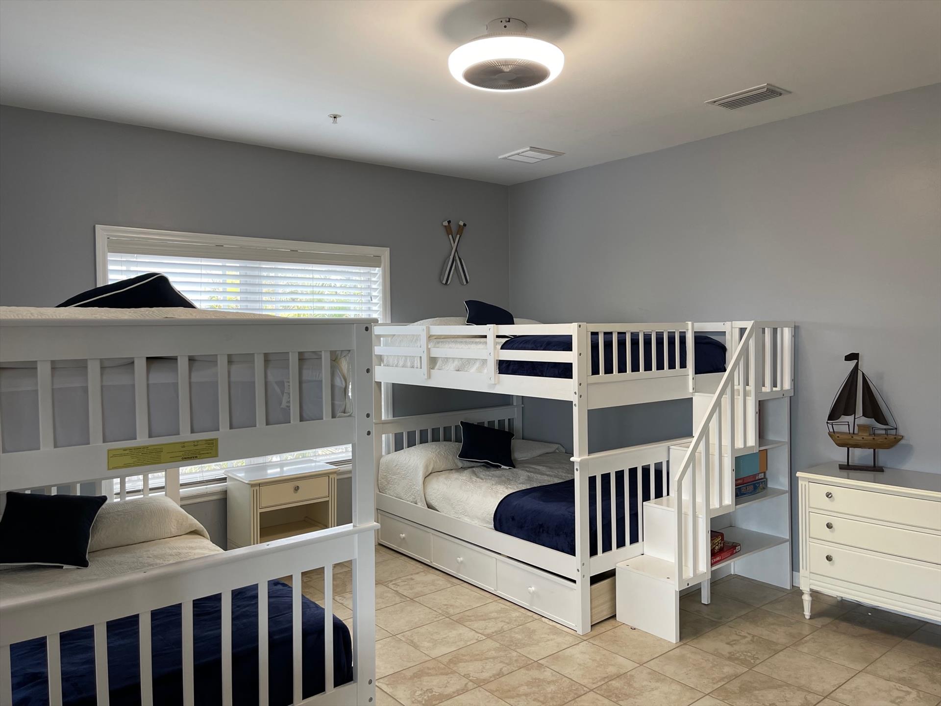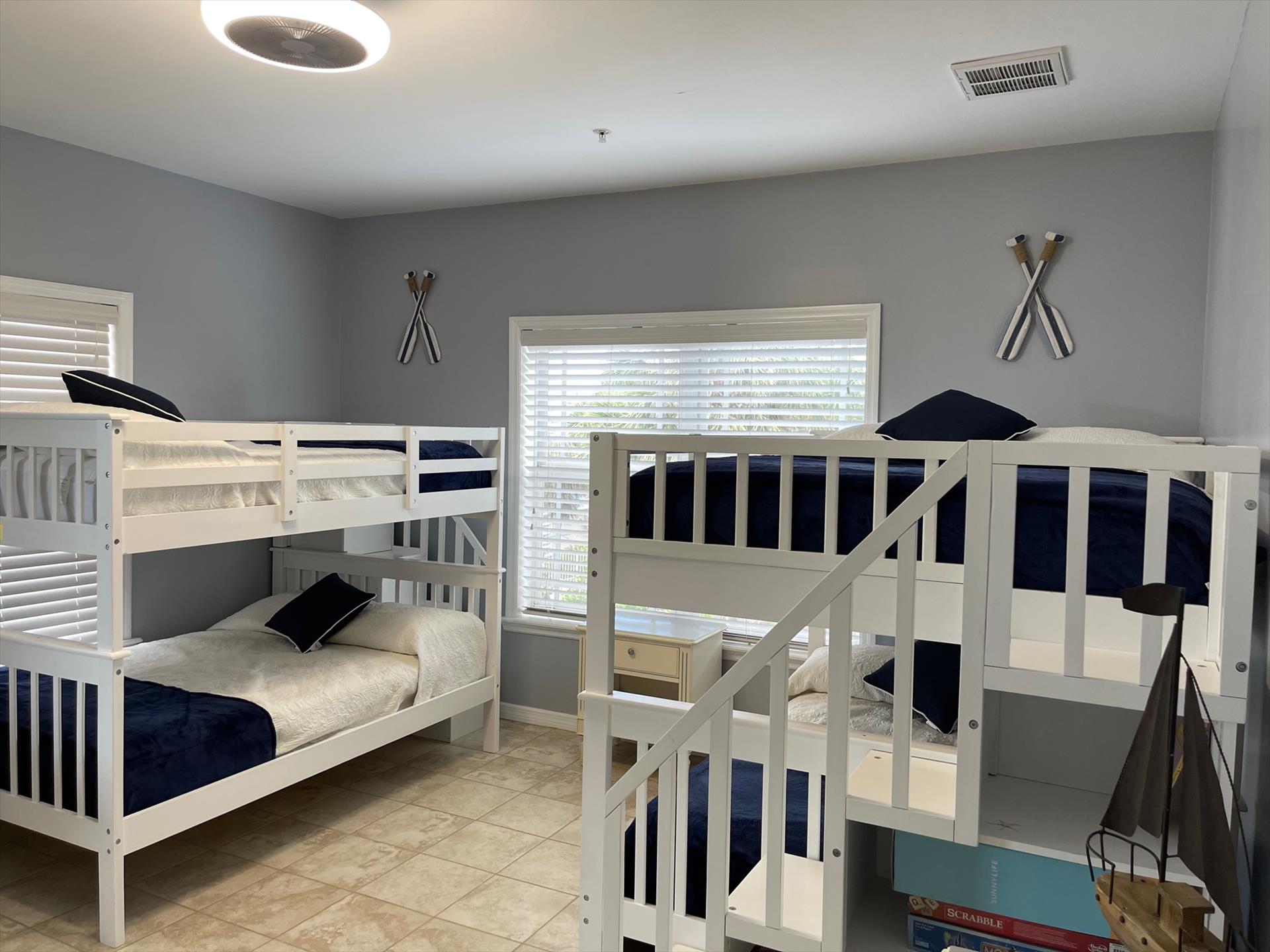 * Many Sleeping Options to accommodate your whole family ideally! Total 4 Bedrooms/5 Baths- 3 Full and 2 Half/Plus 2 Outdoor Showers * Two Large Main King Suites with Sitting Areas, Walk In Closets, TVs with DirecTV, Huge En Suite Full Baths with Large Jetted Soaking Tubs, Two Sinks, and Enormous Glass Enclosed Showers with Waterfall Shower Heads and each with Attached Balconies * Large 3rd Bedroom with King Bed with French Door to Amazing Screened Porch/Balcony and TV with DirecTV * Large "Kids Bedroom" with Four- Full Sized Bunk Beds (sleeps 8 kids) with Brand New TCL 43 Inch Smart TV with Access to that Amazing Screened Porch/Balcony * These Two Bedrooms share the Jack and Jill Bath with the Tub/Shower Combination and Vanity with Sink * Lovely Half Bath on Main Living Floor * Open Kitchen with Tons of Cabinetry and Countertop Space * Breakfast Bar * Large Convection Toaster Oven * Keurig and New Hamilton Beach 12 Cup Coffee Maker * Living Room with 80 Inch TV  U Shaped