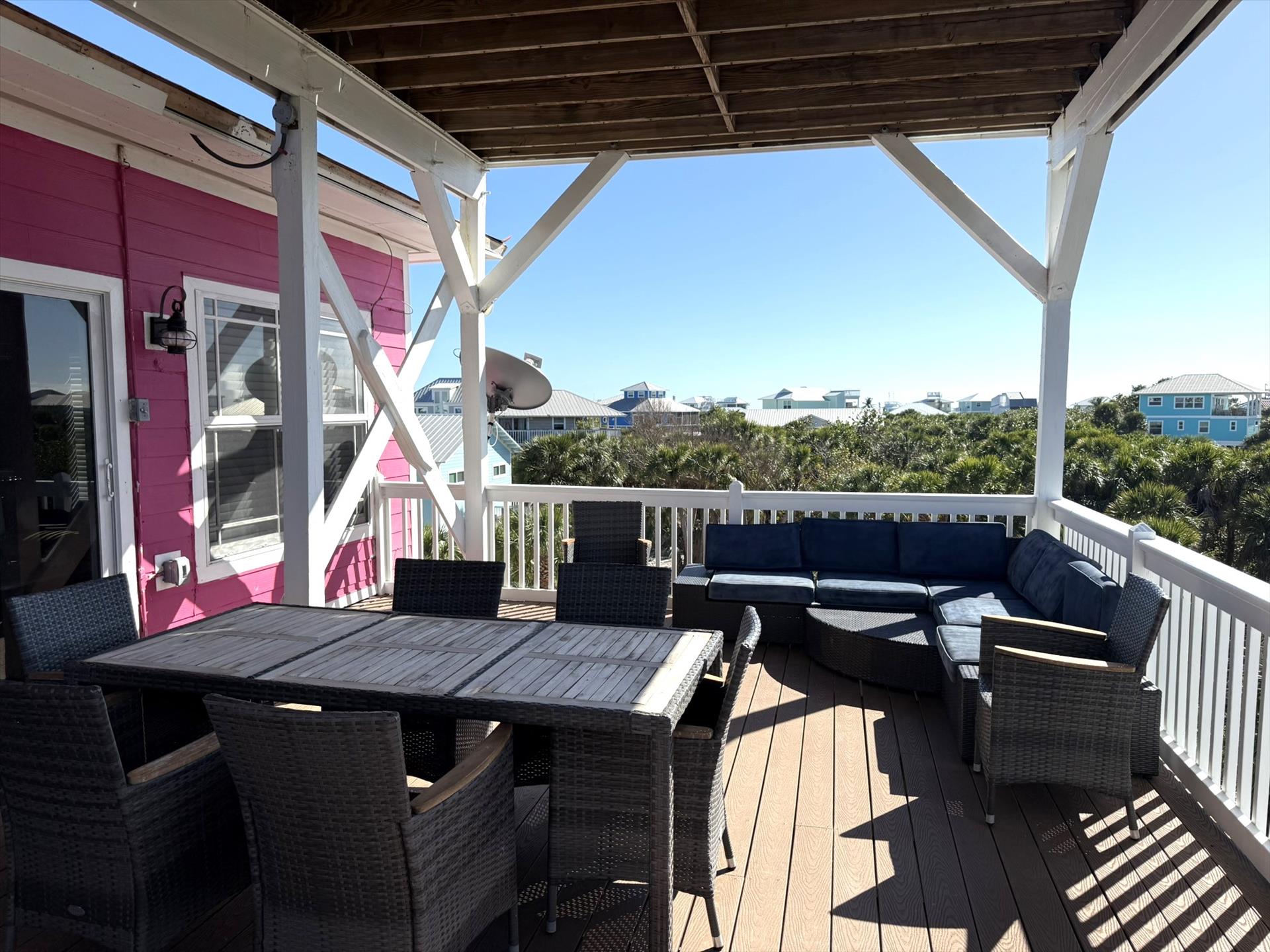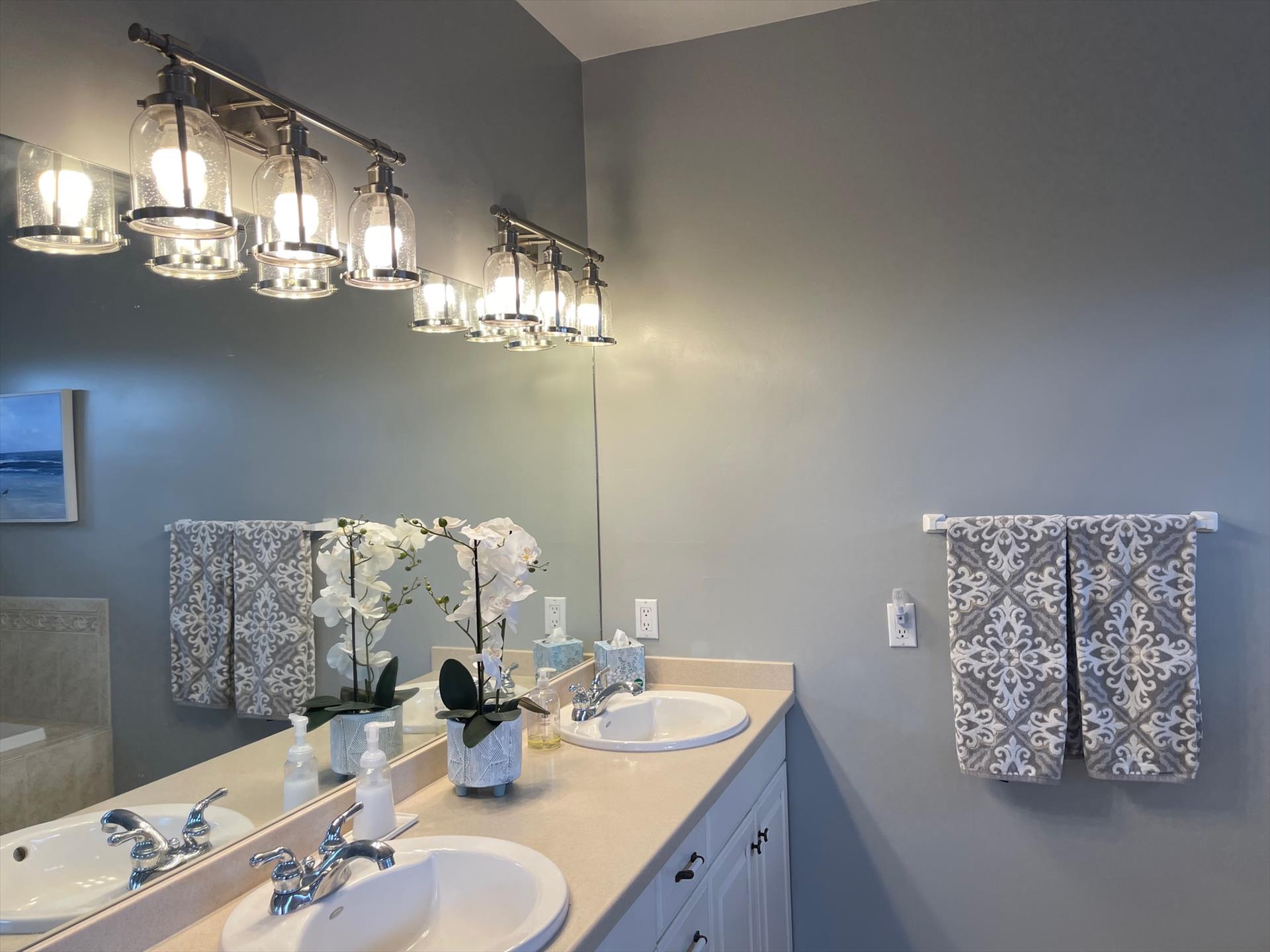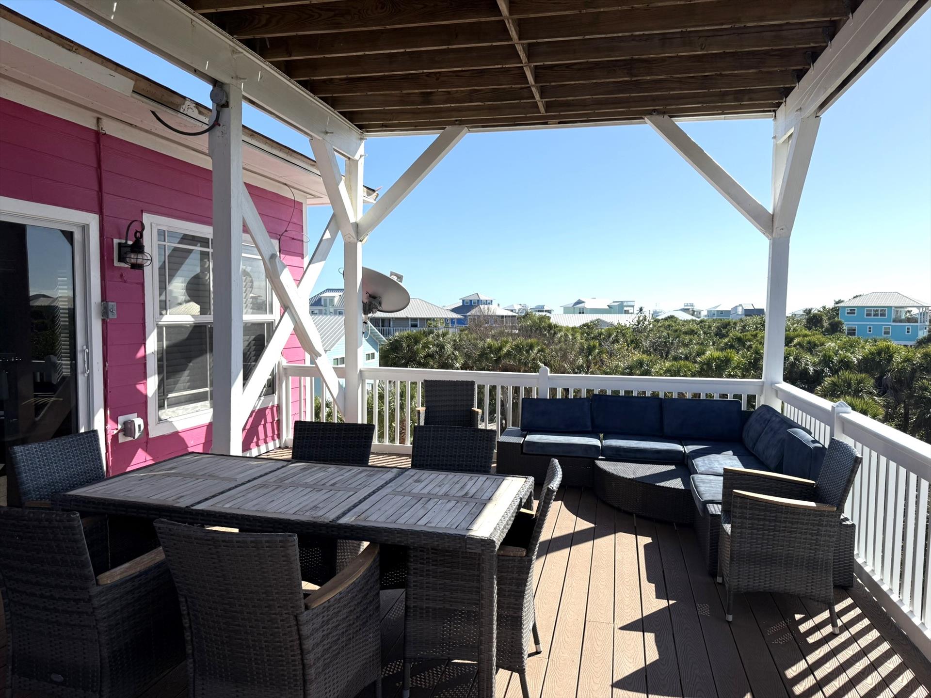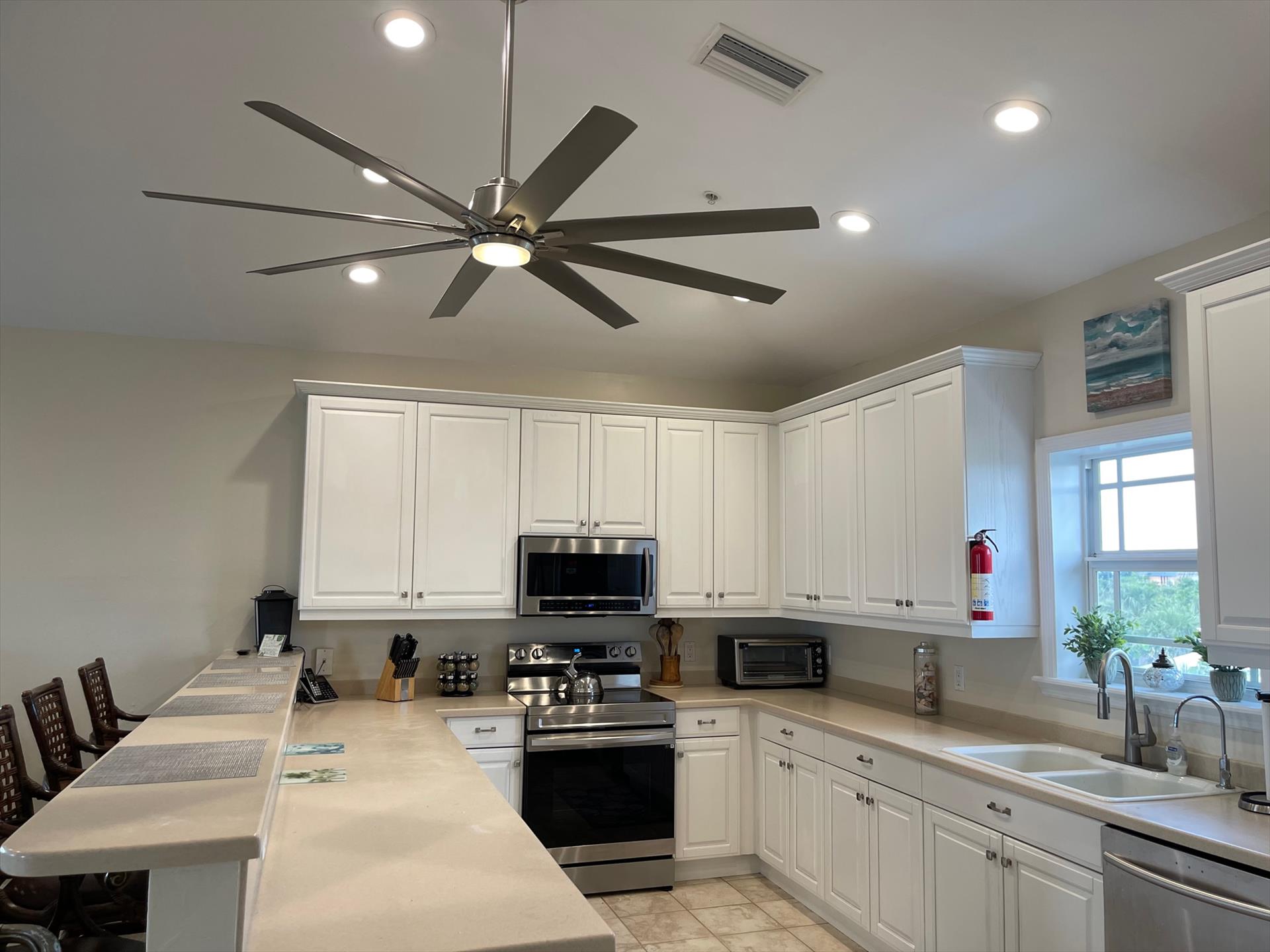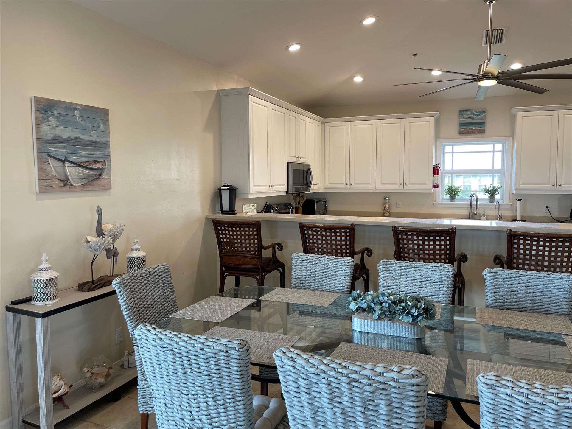 * Many Sleeping Options to accommodate your whole family ideally! Total 4 Bedrooms/5 Baths- 3 Full and 2 Half/Plus 2 Outdoor Showers * Two Large Main King Suites with Sitting Areas, Walk In Closets, TVs with DirecTV, Huge En Suite Full Baths with Large Jetted Soaking Tubs, Two Sinks, and Enormous Glass Enclosed Showers with Waterfall Shower Heads and each with Attached Balconies * Large 3rd Bedroom with King Bed with French Door to Amazing Screened Porch/Balcony and TV with DirecTV * Large "Kids Bedroom" with Four- Full Sized Bunk Beds (sleeps 8 kids) with Brand New TCL 43 Inch Smart TV with Access to that Amazing Screened Porch/Balcony * These Two Bedrooms share the Jack and Jill Bath with the Tub/Shower Combination and Vanity with Sink * Lovely Half Bath on Main Living Floor * Open Kitchen with Tons of Cabinetry and Countertop Space * Breakfast Bar * Large Convection Toaster Oven * Keurig and New Hamilton Beach 12 Cup Coffee Maker * Living Room with 80 Inch TV  U Shaped