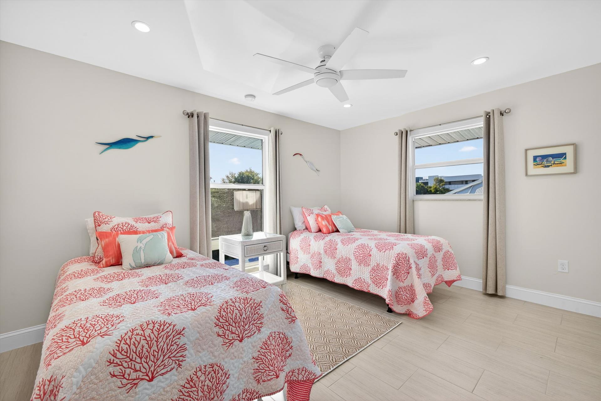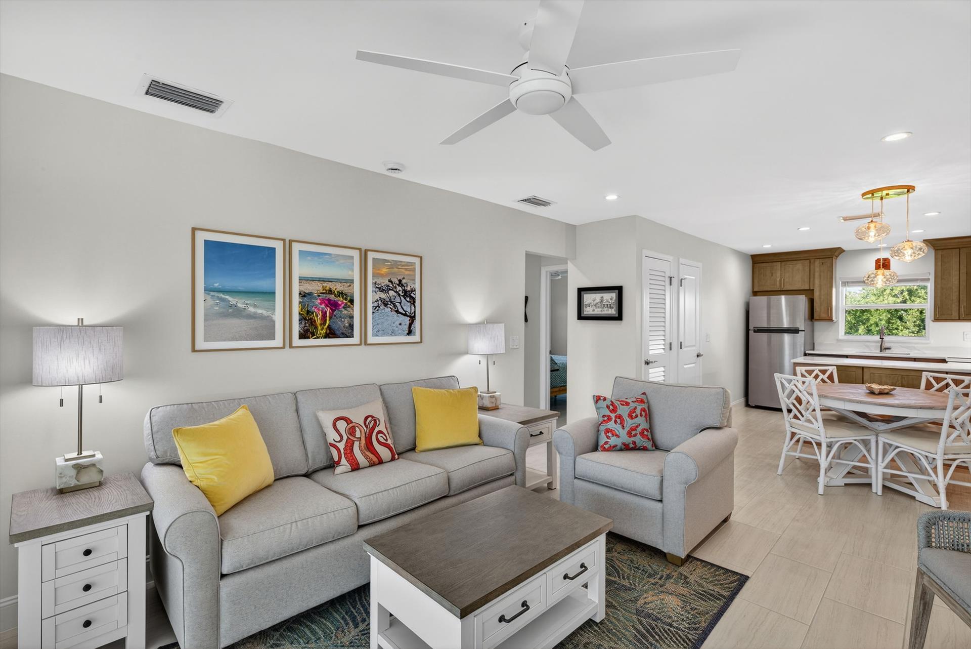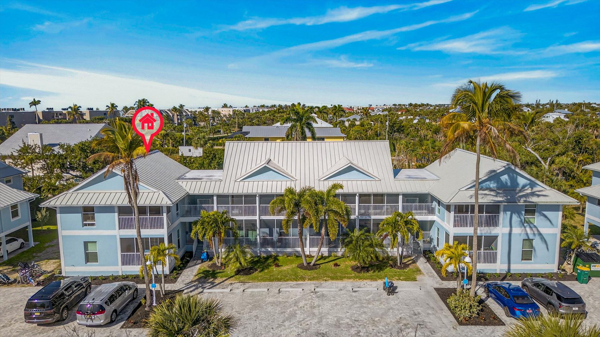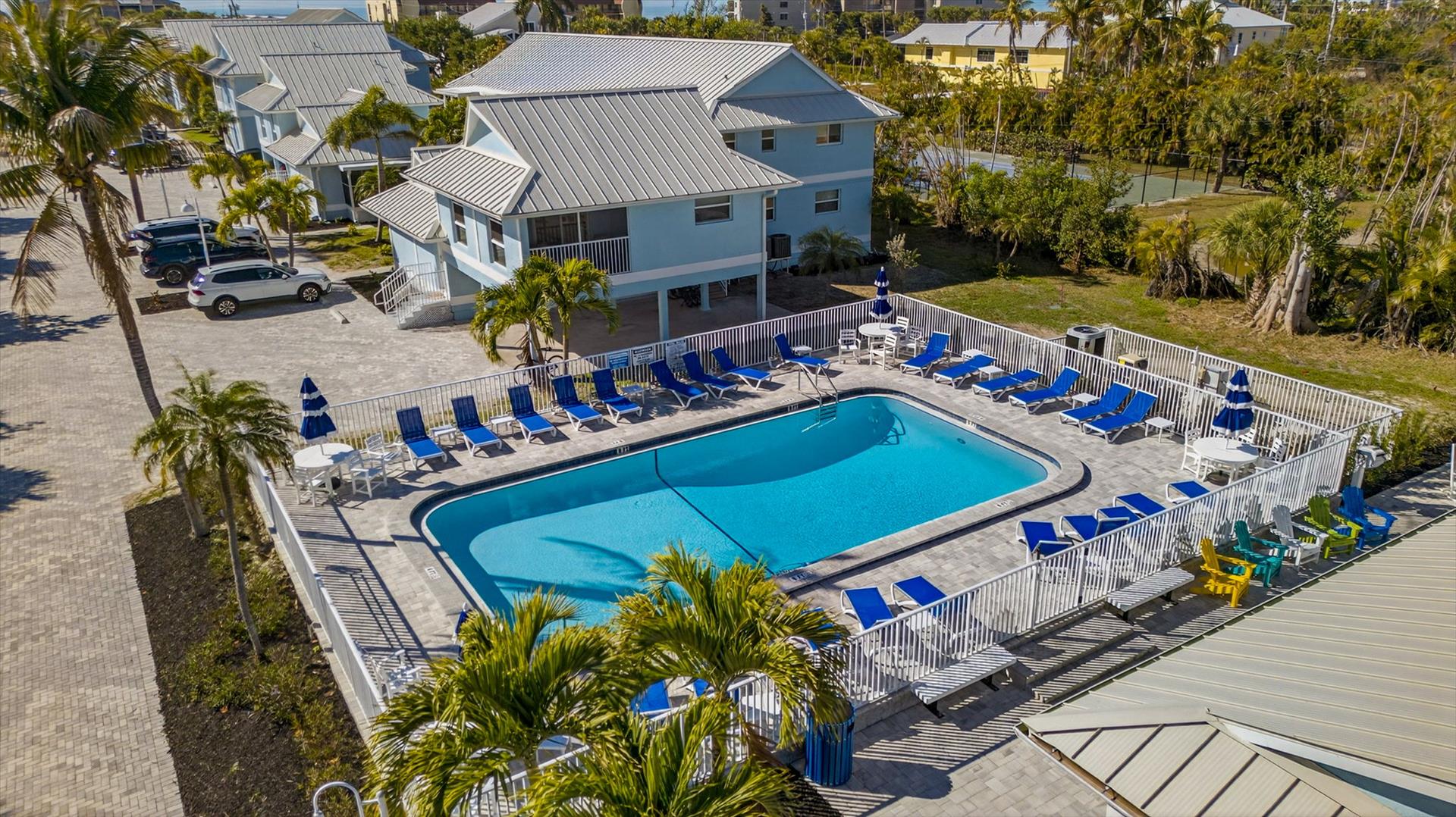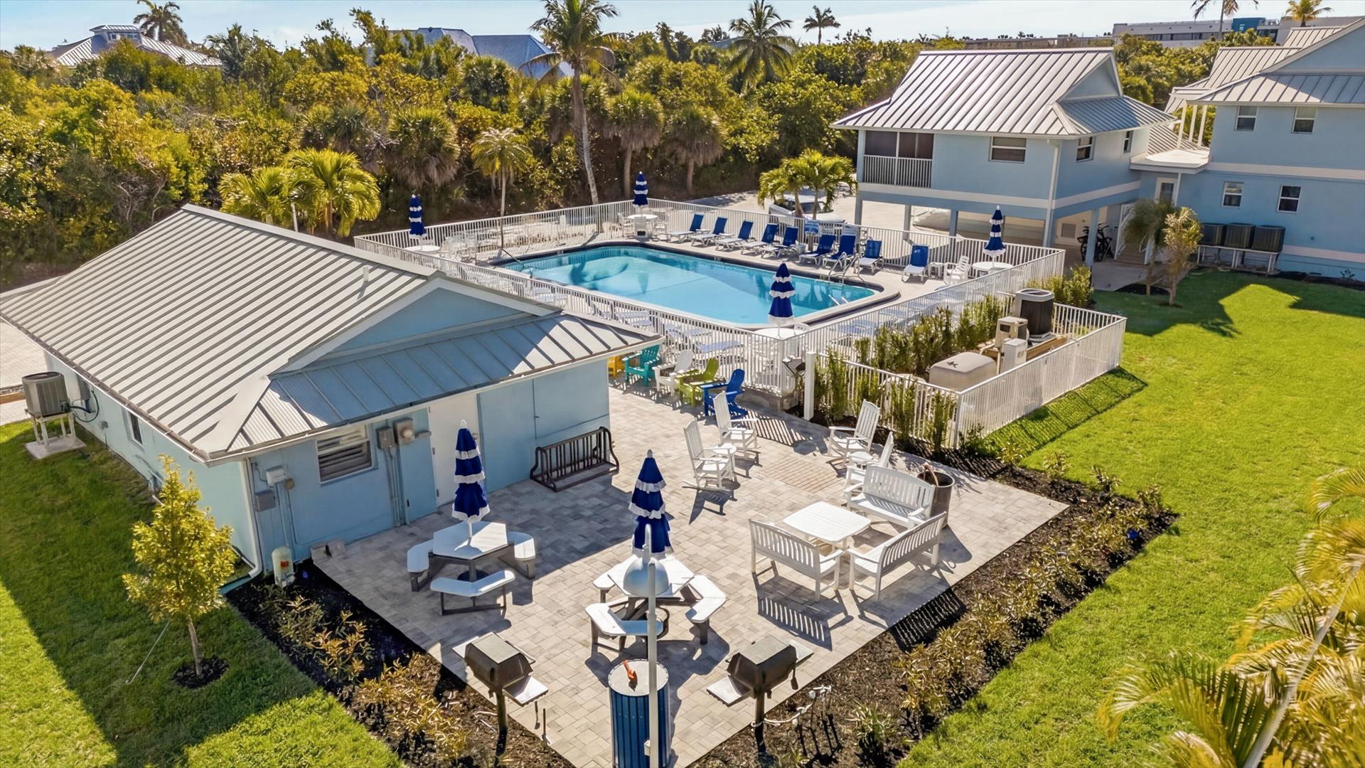 This bright, carpet-free 2-bedroom,2 bath second-floor unit features a king bed in the primary bedroom, two twin beds in the guest room, a fully equipped kitchen, and an in-unit laundry for your convenience. Everything is thoughtfully provided so you can focus on relaxing, including beach chairs, towels, umbrella, a beach cart, and 2 bikes for exploring. Gas BBQ grills located near the pool. Spend your days shelling, relaxing by the pool, or biking the scenic island path to nearby restaurants and bars.