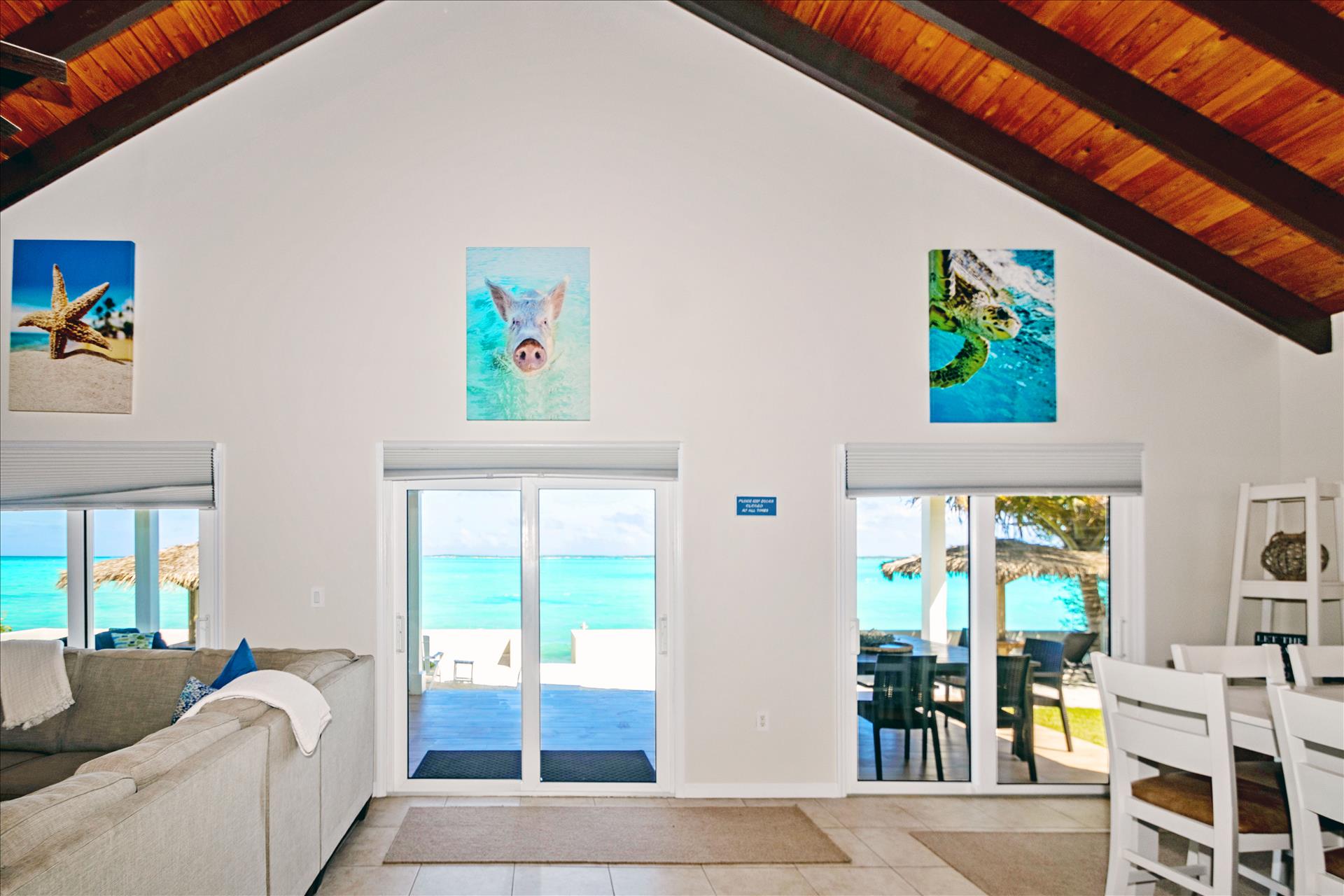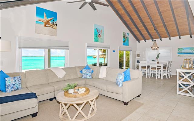 The great room offers vaulted ceilings and sliding glass doors that open to the ocean. Relax in the cozy seating of the great room in front of a 65" flatscreen TV equipped with cable and Roku. The great room flows to the dining area and kitchen, to stay connected to the conversation.