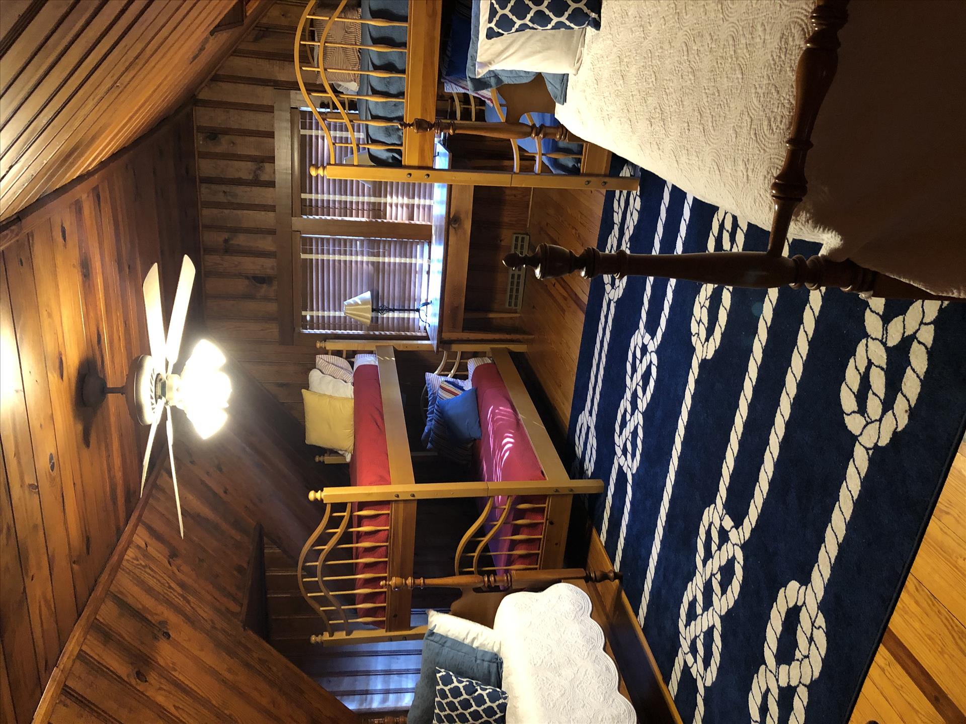 This cozy cottage is perfect for an intimate getaway or a larger family gathering. On the main level, you will find two queen bedrooms and one full bath. Upstairs is a large bunk room with 6 twin beds and a bathroom. The guest cottage out front provides extra privacy for two and has its own bathroom and kitchenette. Home has a pack and play, a Regalo toddler cot, as well as a queen aerobed for flexibility.