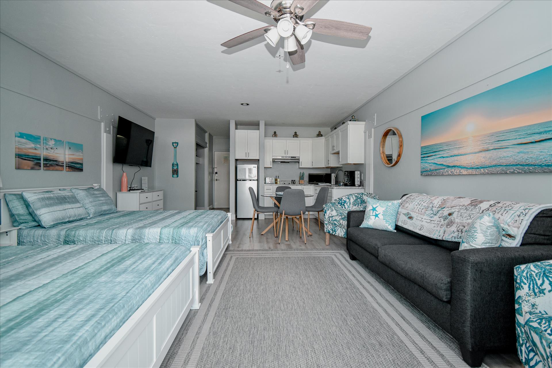 Welcome to our little slice of Old Florida heaven! This fully remodeled 1st floor condo features a fully stocked kitchen with a refrigerator, stove top and microwave. The living room area includes 2 queen beds and a pull out sleeper sofa.  Enjoy the 65 inch TV or relax on the porch with views of the city park, beach and the Gulf of America. Visit the gift shops, restaurants and be sure to bring your fishing rod to enjoy all our island oasis has to offer!