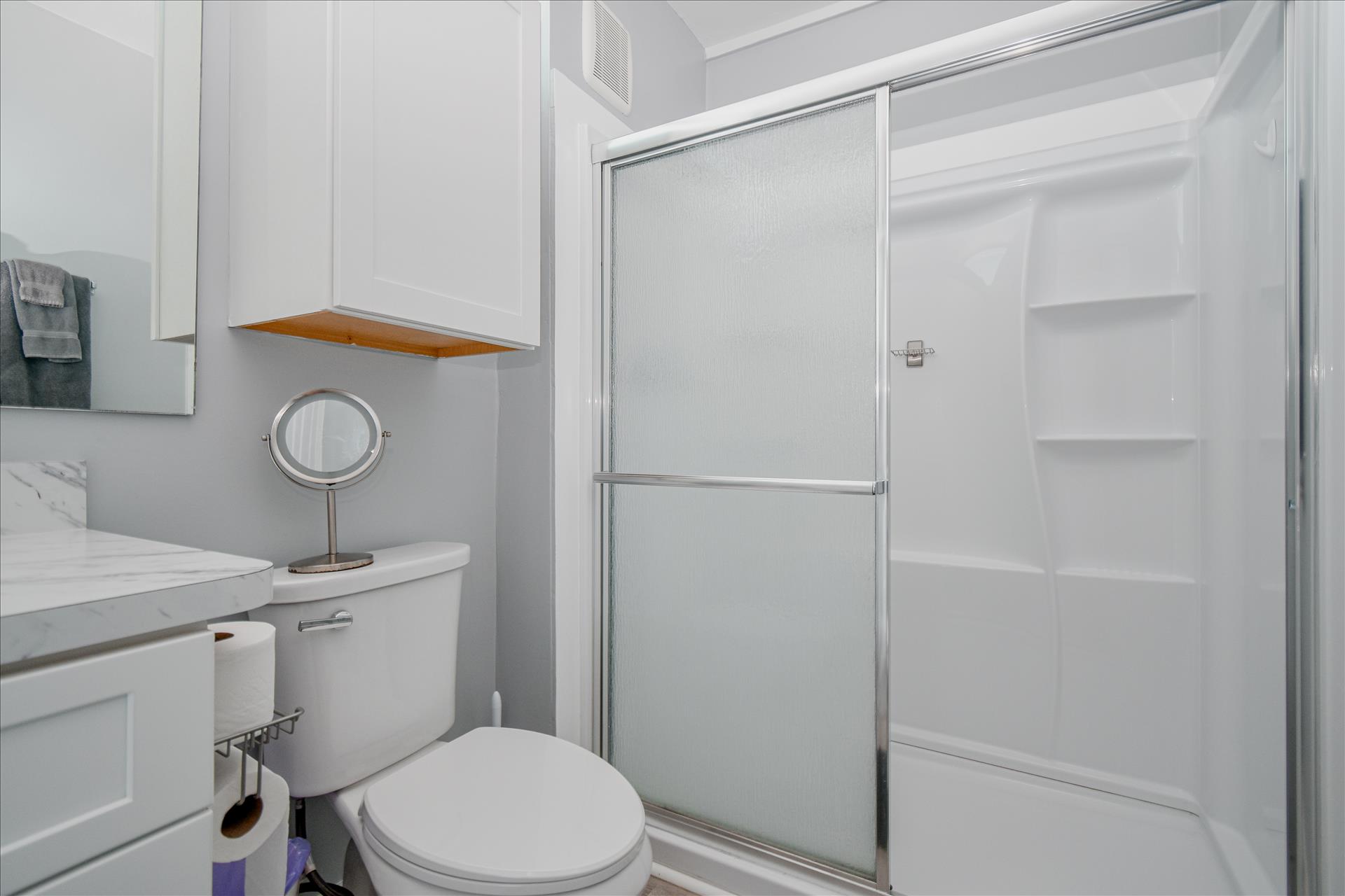 Our new walk-in shower has sliding doors. There are 3 cupboards to store your personal items. Closet is full size behind doors.