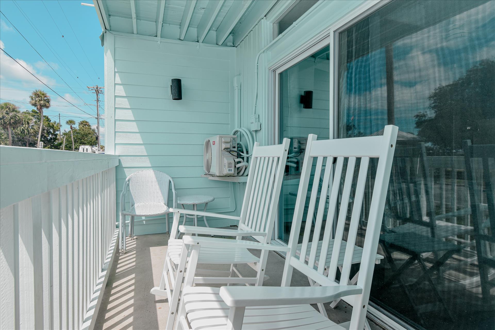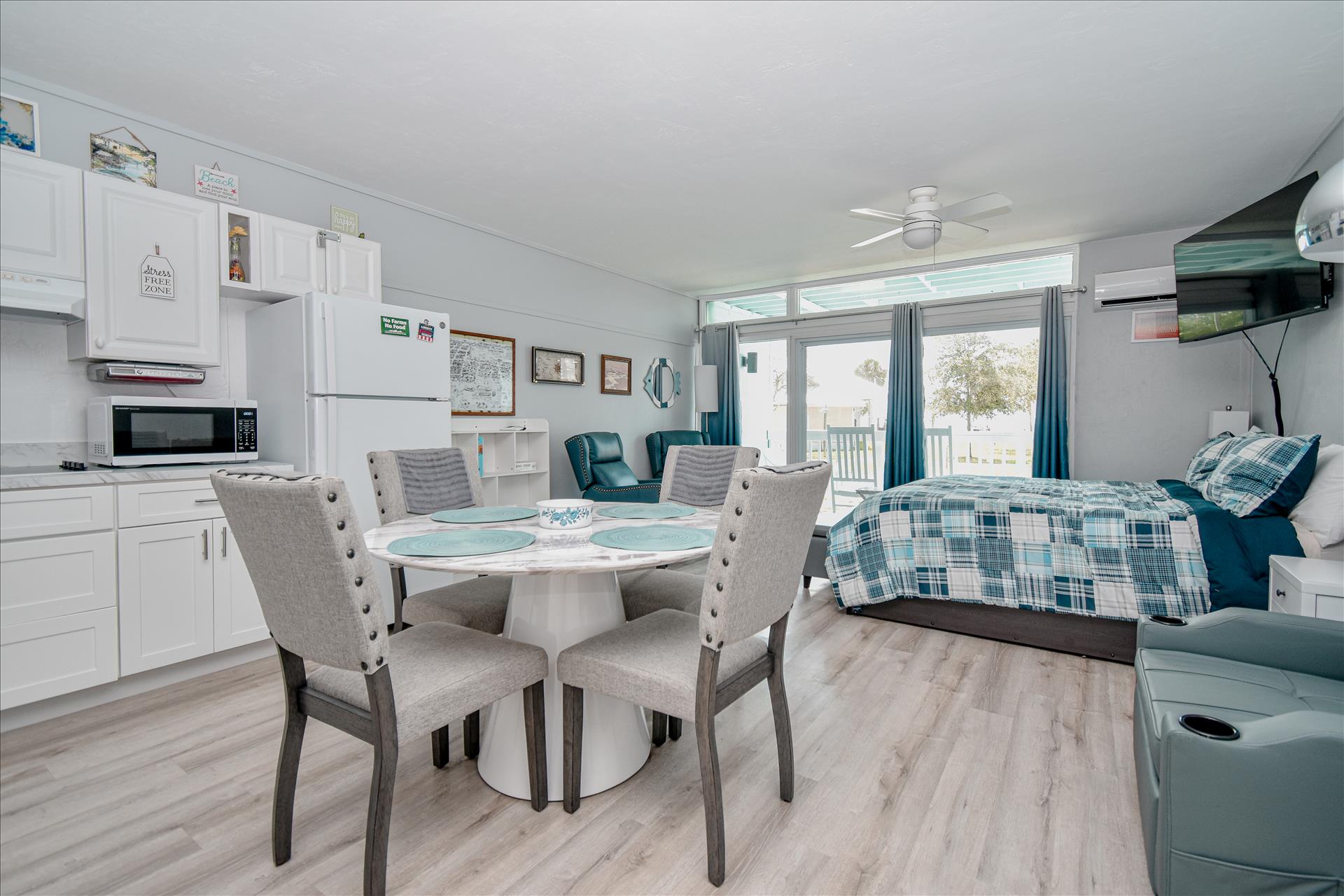kitchen table seats 8 if you bring our porch chairs in. There are 2 comfortable rockers on the porch and 2 small tables also.