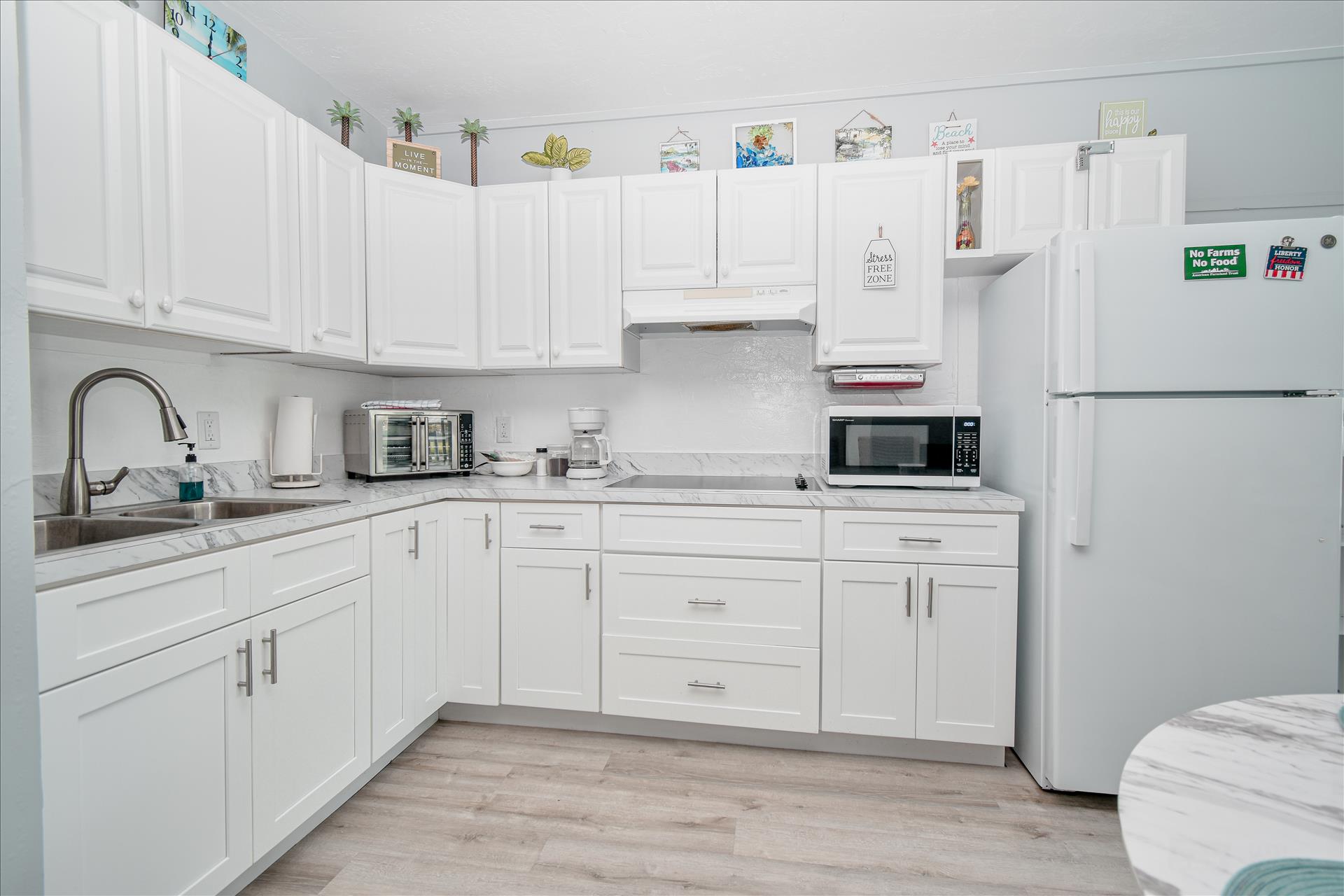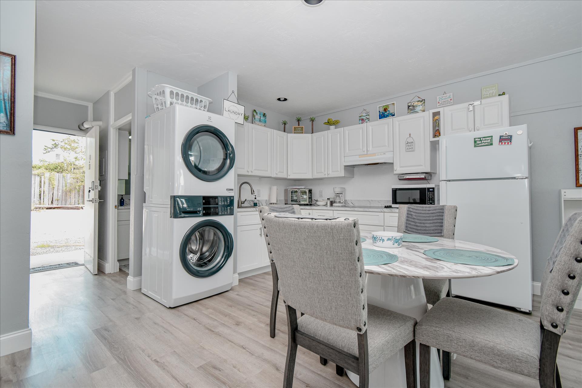 You will find a residential refrigerator,a washer/dryer tower, microwave, toaster oven combo with air fryer and other settings, toaster, coffee