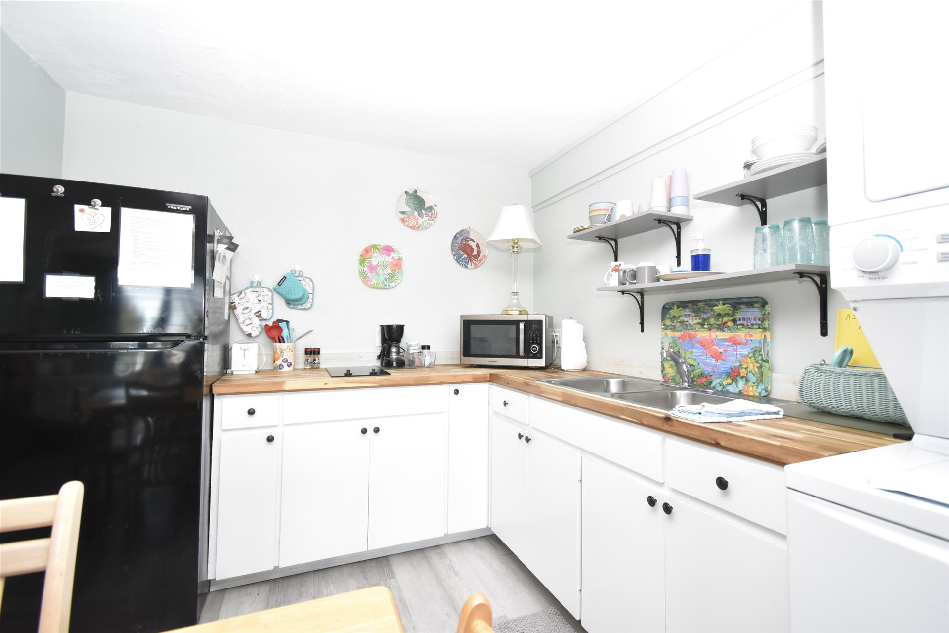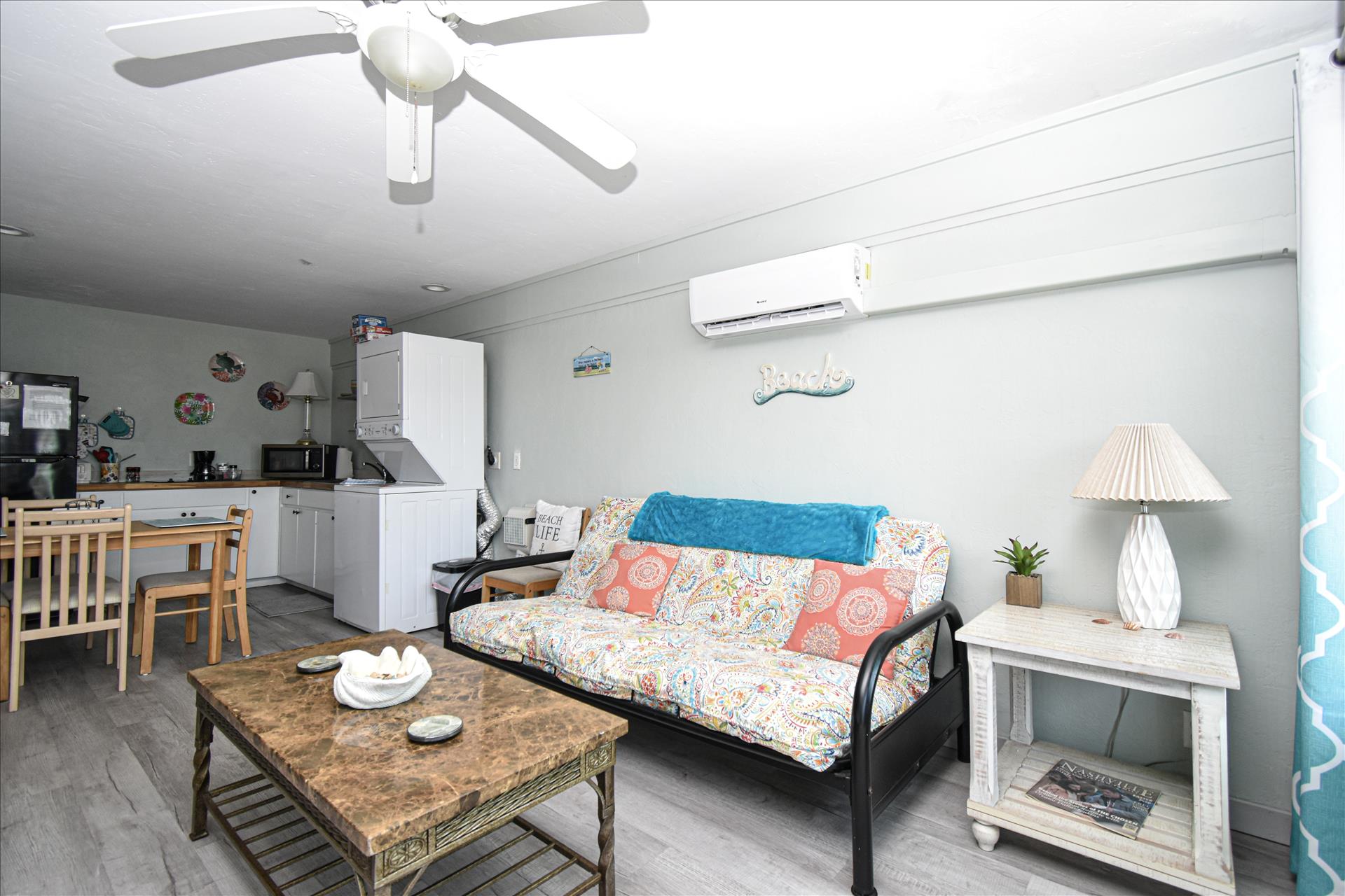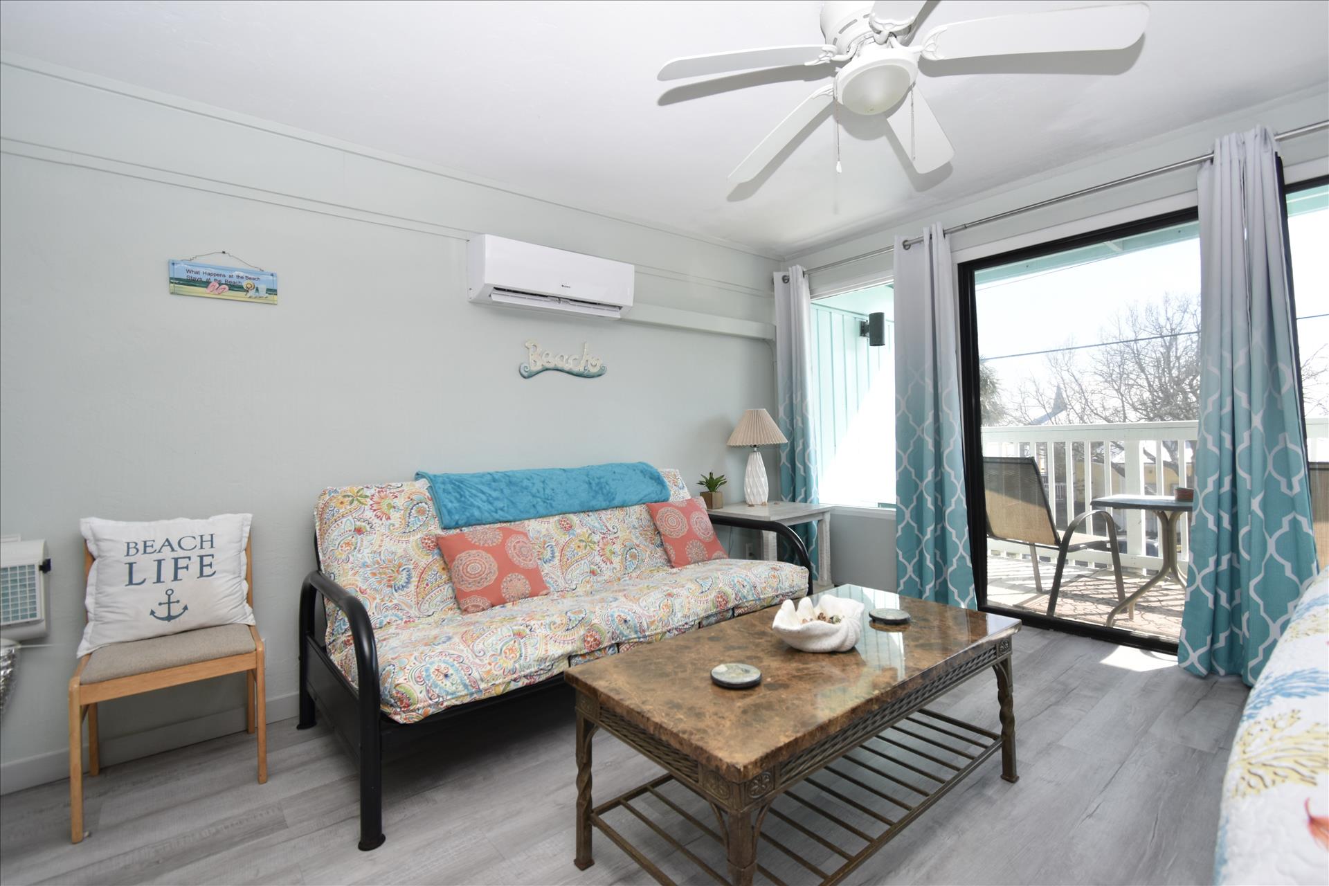 This lovely room offers you a king sized bed with a futon sleeper sofa for your additional guests. The kitchen has a 4 burner stove, microwave, coffee maker, toaster and refrigerator. See you soon! (2nd floor not wheelchair assessable)