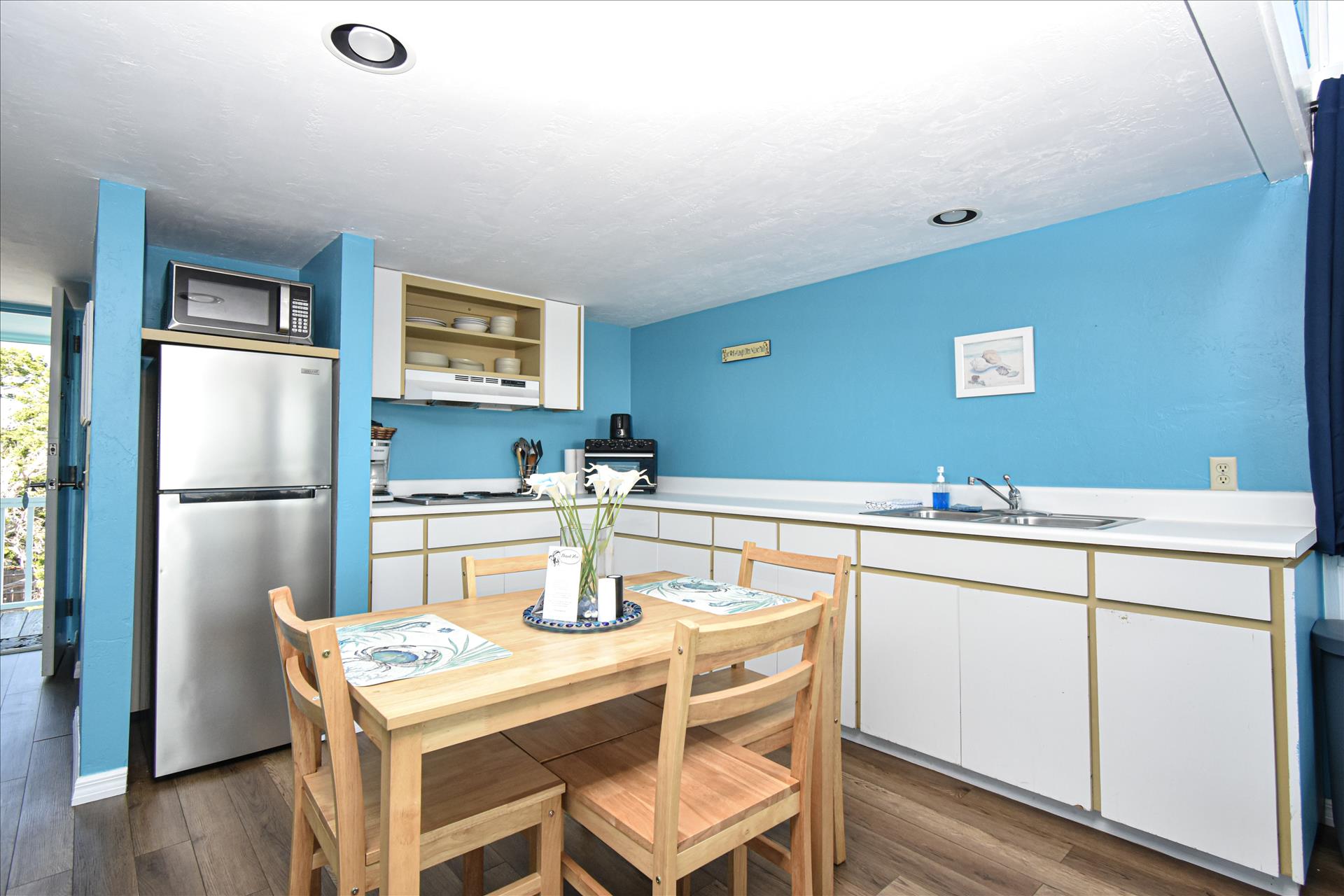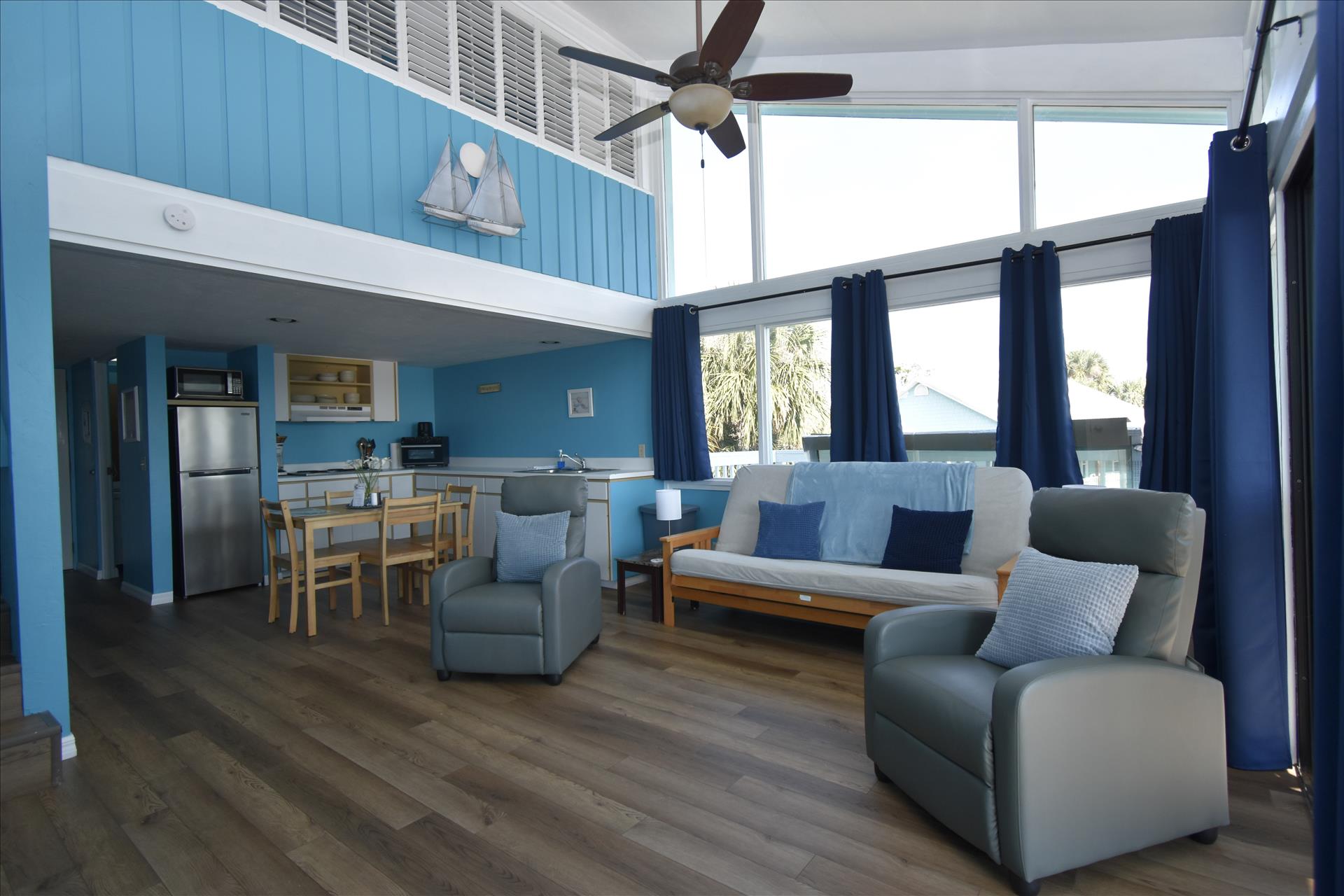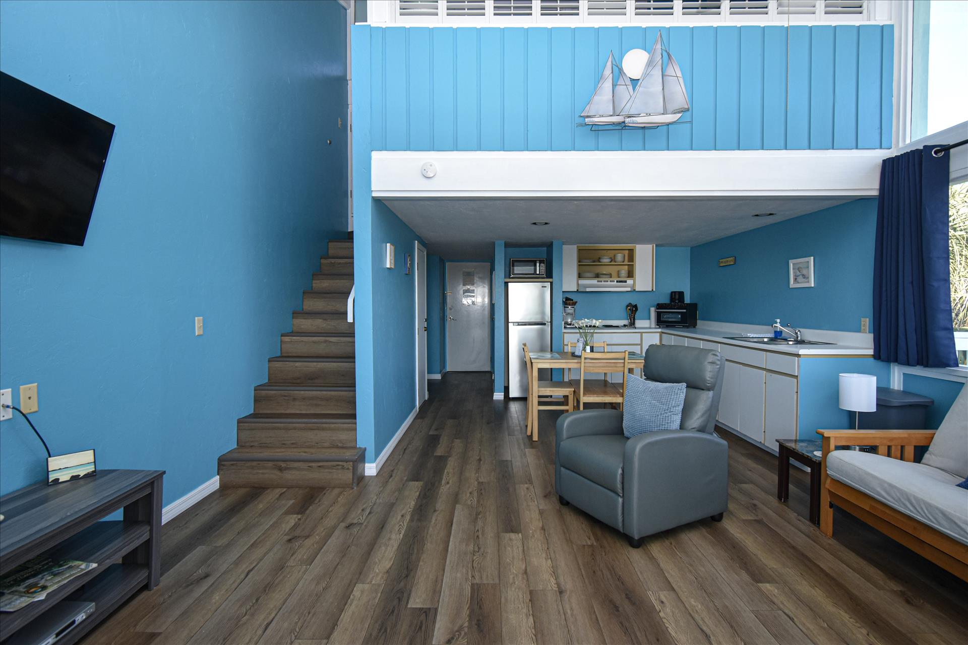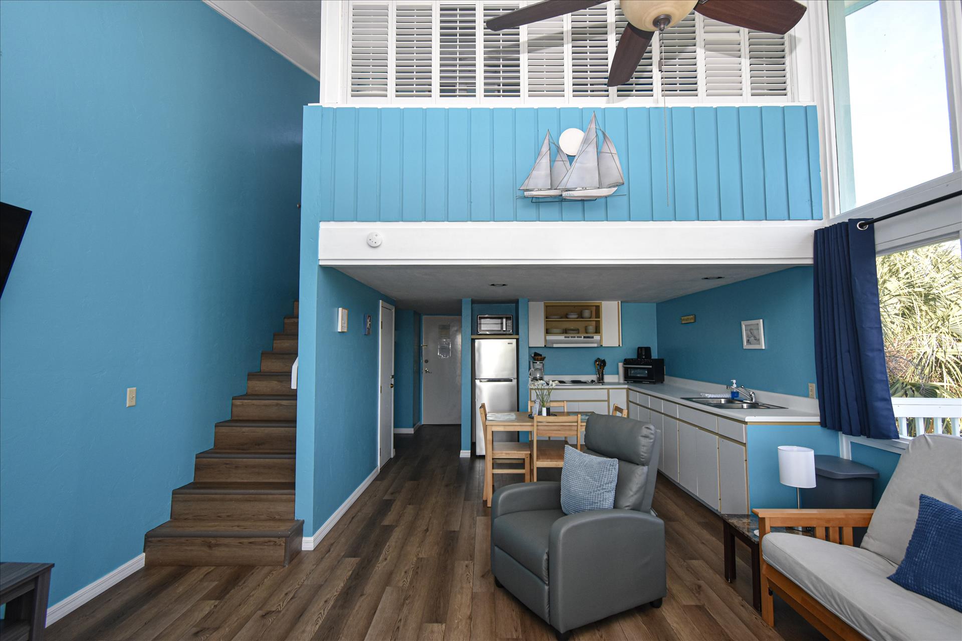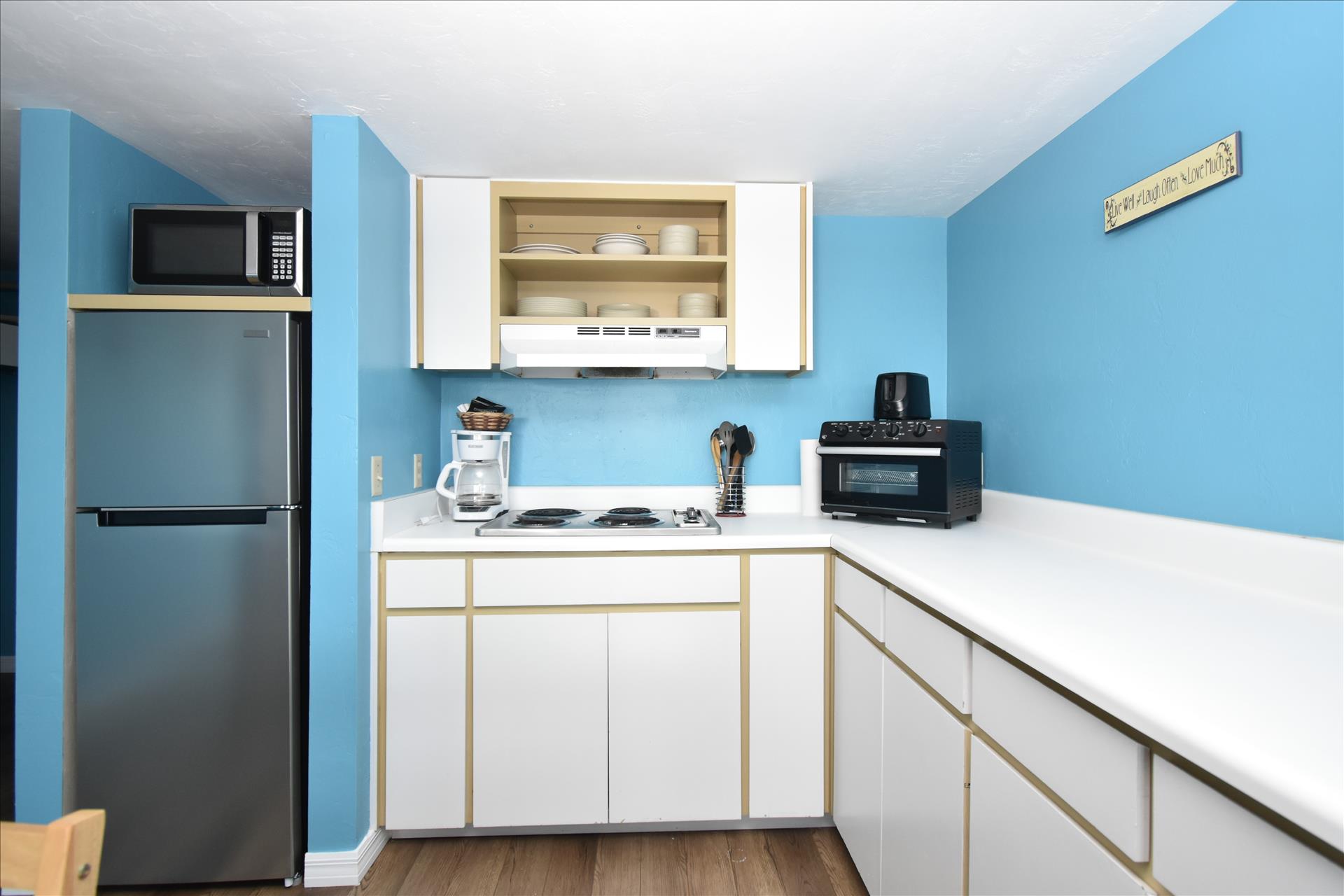 This 3rd floor unit has a queen bed upstairs in the loft area. There is a wrap around balcony to fully enjoy the views, especially the spectacular sunrises. The kitchen has a 4 burner stove with a microwave, toaster and coffee maker. See you soon! (3rd floor not wheelchair assessable)