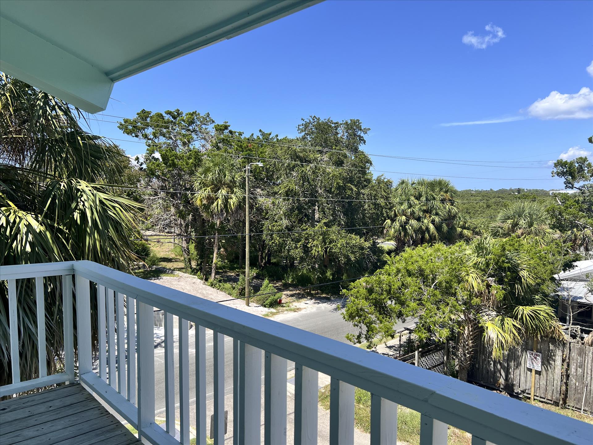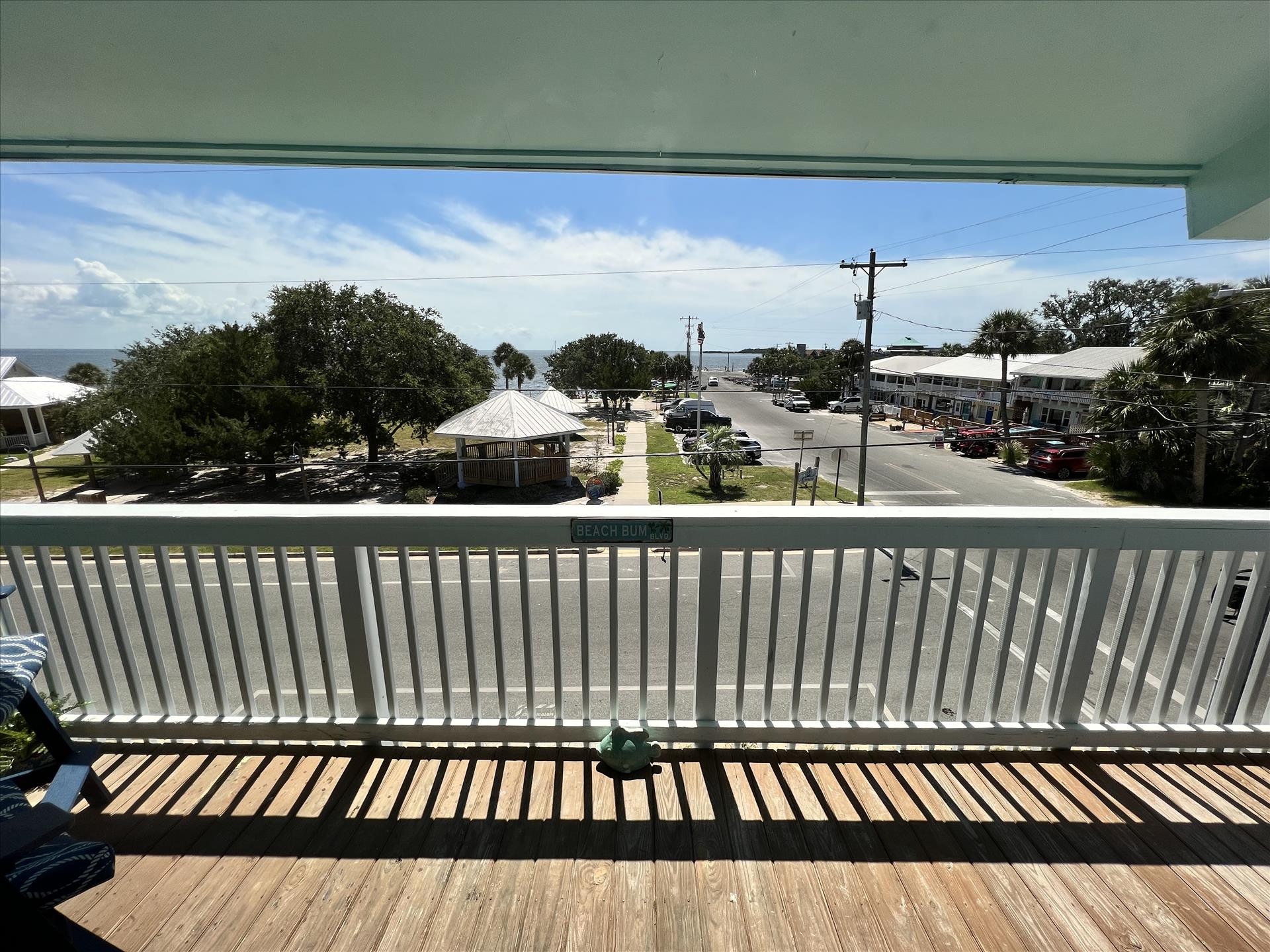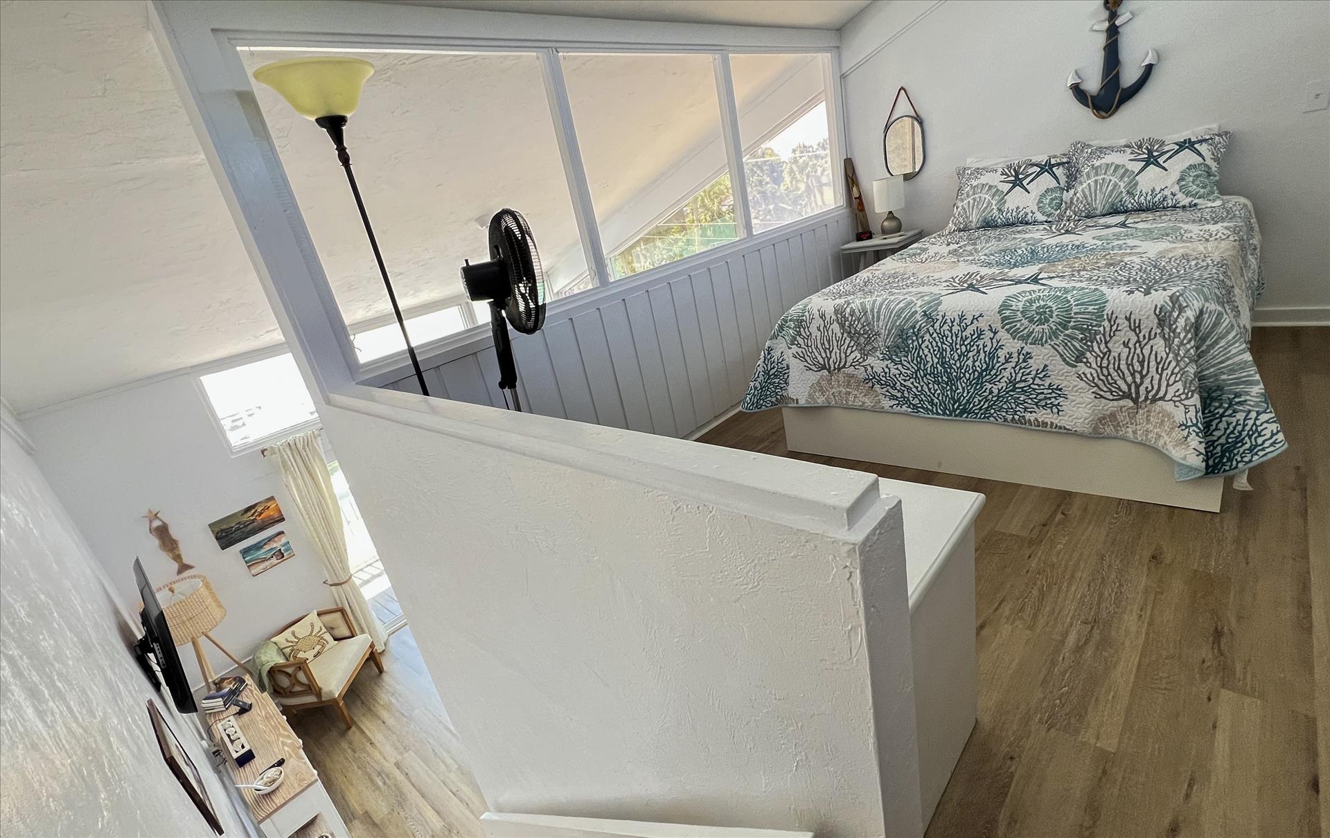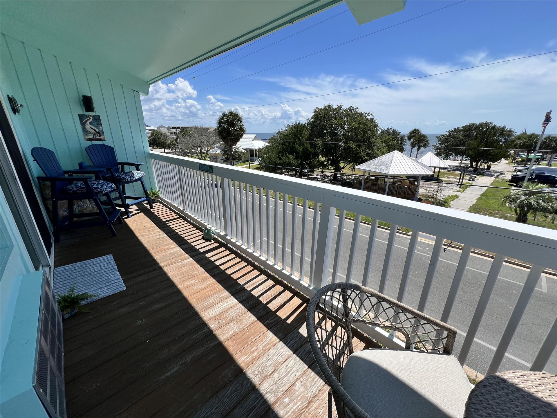 It is a third floor (top floor) corner unit, affording privacy and quiet. The unit’s wraparound main deck floor and railing were recently refinished. The deck is wonderful space, affording an excellent view of the City Park gazebo and park activities below, and of the beach area and Gulf of Mexico out on the edge of the park. We get beautiful sunrises from the main front wraparound deck, and sunset light from the west-facing area of the wraparound deck, and also from the rear deck. The rear deck also affords the best view in the island village of the most-recently installed osprey-nesting pole and nesting deck. Cedar Key is among the most bird-populated osprey and other raptor nesting areas in the country. It is birders’ paradise. Cedar Key is also known as a fishing mecca. Kayaks can be rented to paddle out around the bay and to other islands in the area. Unit 332, being on the top floor, has an upstairs bedroom loft, not available on lower floors. The main floor living room has a pullout futon-couch for extra guest sleeping space when needed. Recently-installed new washer and dryer are available for use by guests, and are located conveniently adjacent to the stairs on the second floor of the building. The well-stocked kitchen w dishwasher, fridge, freezer and other appliances, is perfect for foodies. There is much closet and shelf space on main floor and in upstairs bedroom loft. The owners love dogs so this is a dog-friendly unit, even with L.L. Bean doggie bed for your canine friend’s comfort. Onsite staff bring fresh towels and sheets for guests, and provide cleaning of units. Any issues can be addressed with the onsite management office staff. (3rd floor not wheelchair assessable)