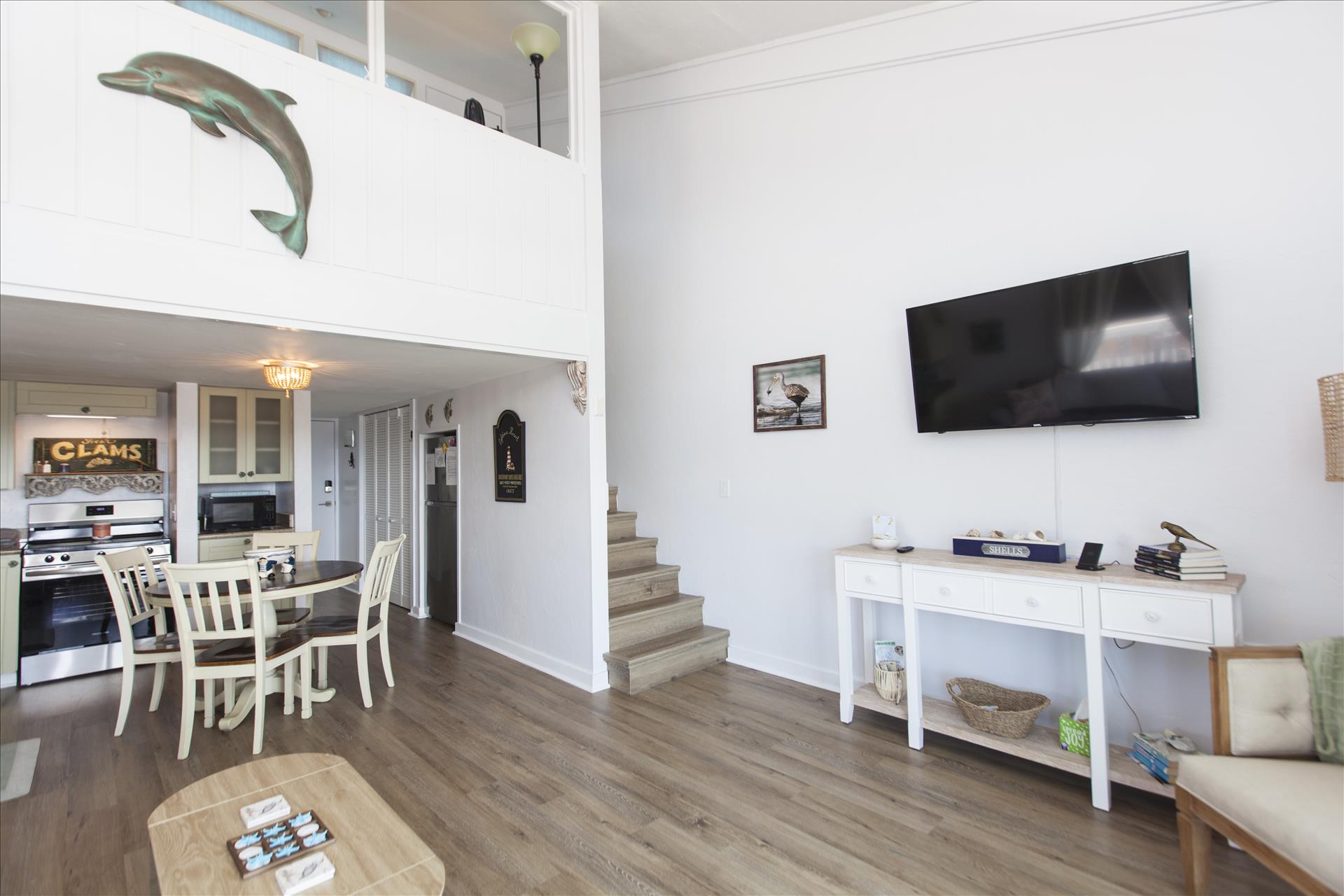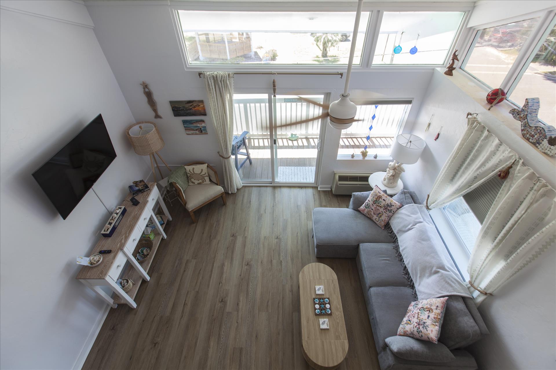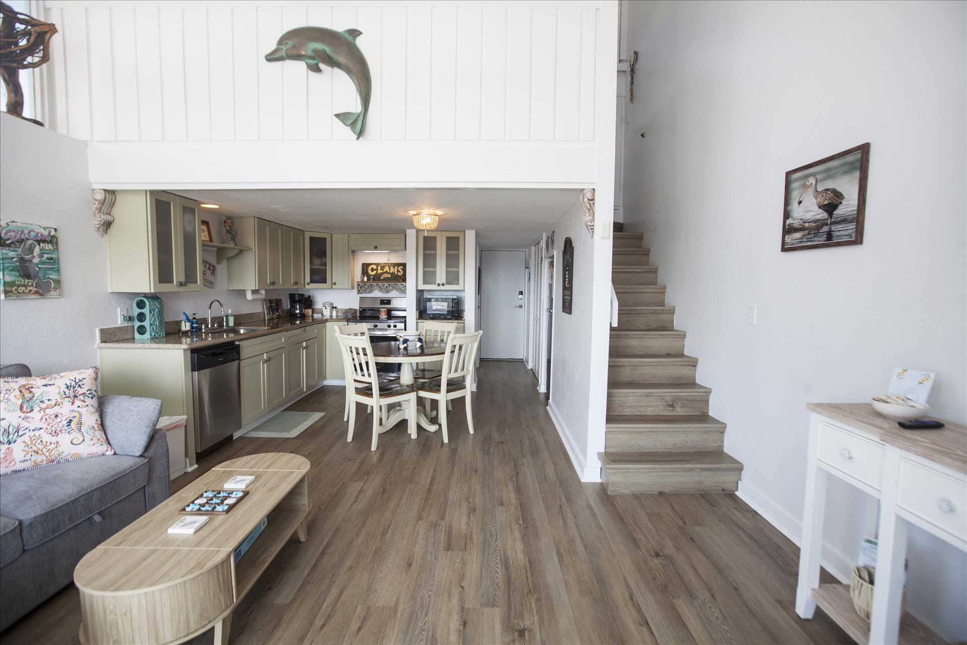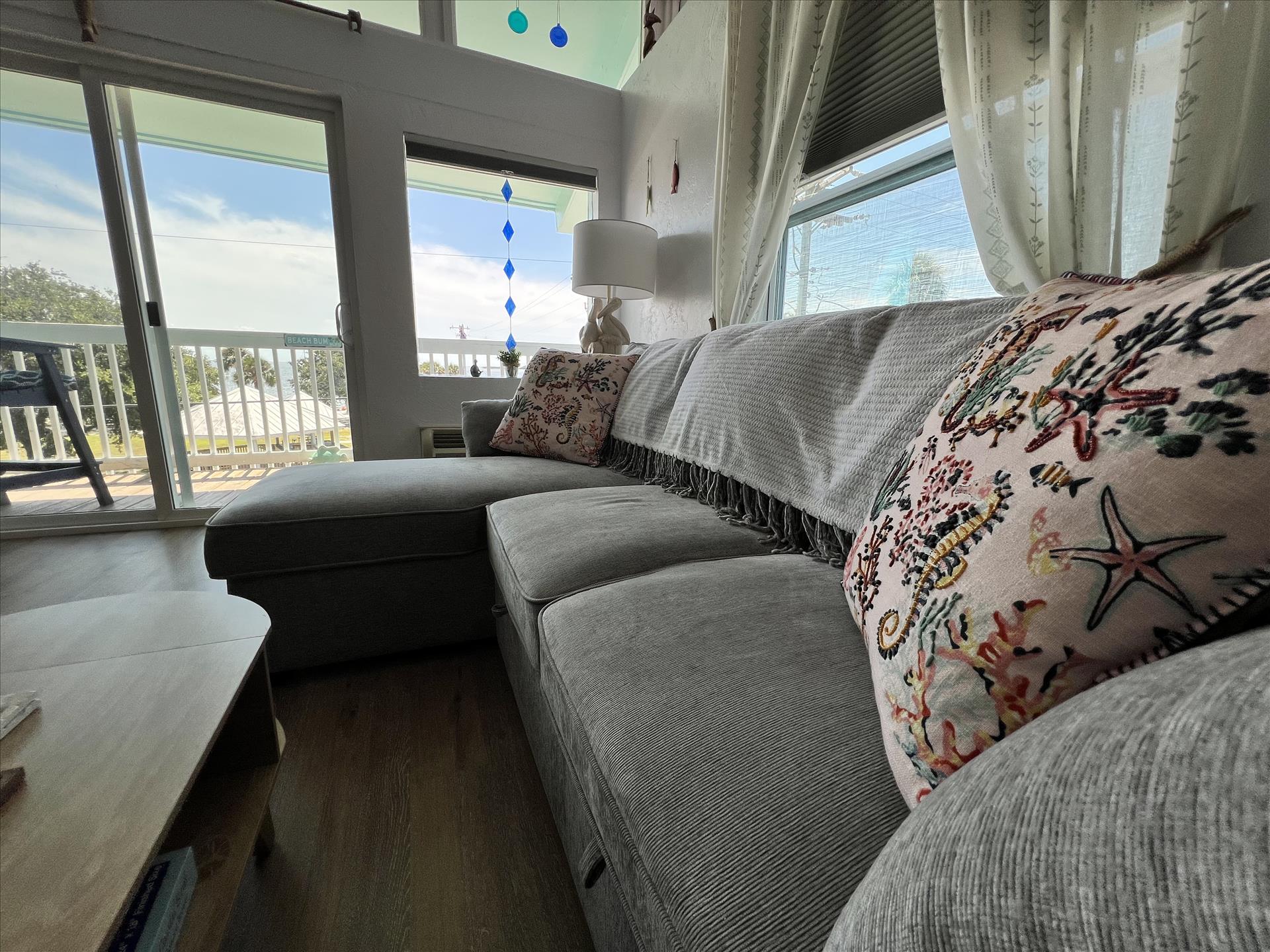 It is a third floor (top floor) corner unit, affording privacy and quiet. The unit’s wraparound main deck floor and railing were recently refinished. The deck is wonderful space, affording an excellent view of the City Park gazebo and park activities below, and of the beach area and Gulf of Mexico out on the edge of the park. We get beautiful sunrises from the main front wraparound deck, and sunset light from the west-facing area of the wraparound deck, and also from the rear deck. The rear deck also affords the best view in the island village of the most-recently installed osprey-nesting pole and nesting deck. Cedar Key is among the most bird-populated osprey and other raptor nesting areas in the country. It is birders’ paradise. Cedar Key is also known as a fishing mecca. Kayaks can be rented to paddle out around the bay and to other islands in the area. Unit 332, being on the top floor, has an upstairs bedroom loft, not available on lower floors. The main floor living room has a pullout futon-couch for extra guest sleeping space when needed. Recently-installed new washer and dryer are available for use by guests, and are located conveniently adjacent to the stairs on the second floor of the building. The well-stocked kitchen w dishwasher, fridge, freezer and other appliances, is perfect for foodies. There is much closet and shelf space on main floor and in upstairs bedroom loft. The owners love dogs so this is a dog-friendly unit, even with L.L. Bean doggie bed for your canine friend’s comfort. Onsite staff bring fresh towels and sheets for guests, and provide cleaning of units. Any issues can be addressed with the onsite management office staff. (3rd floor not wheelchair assessable)