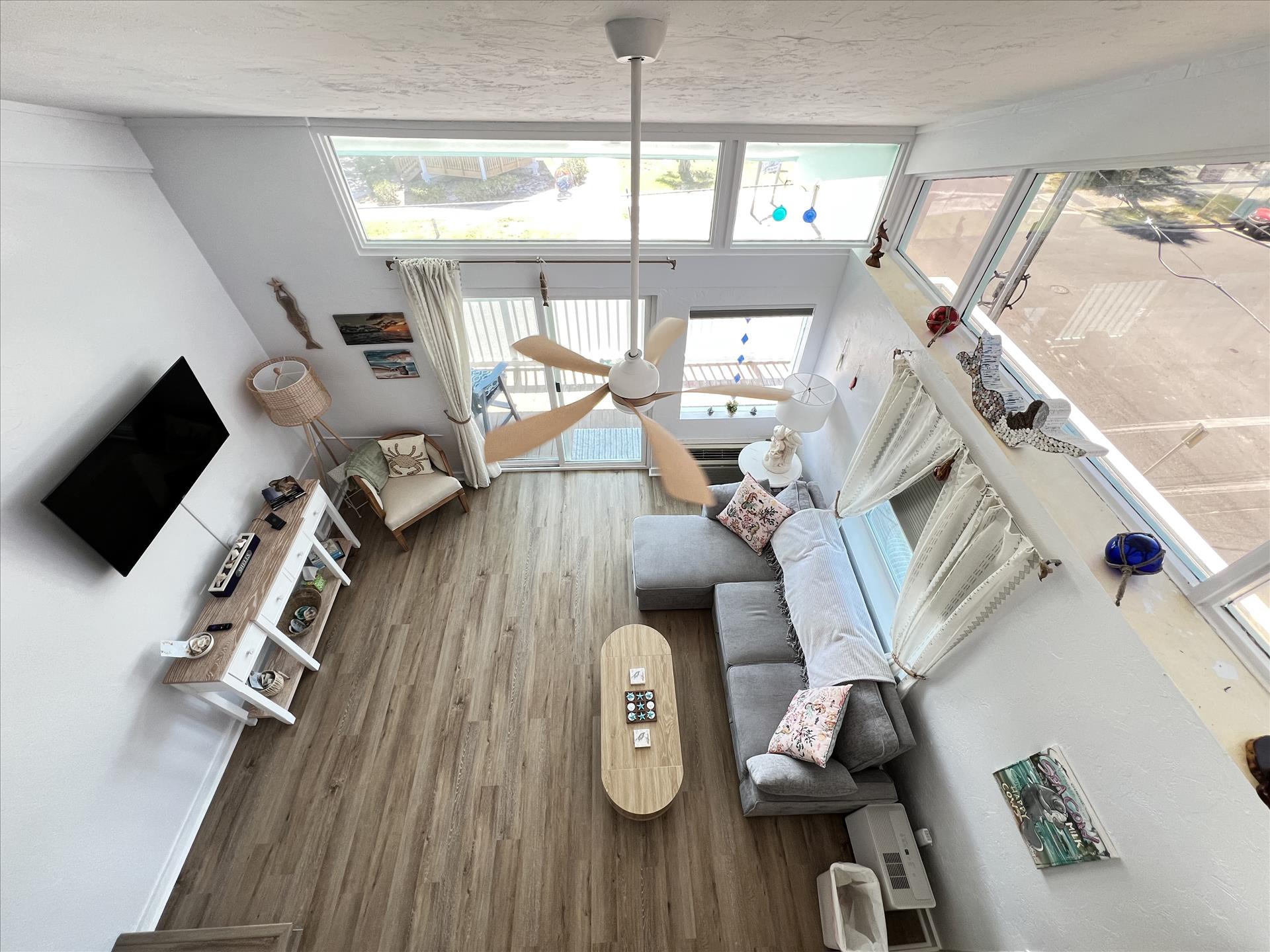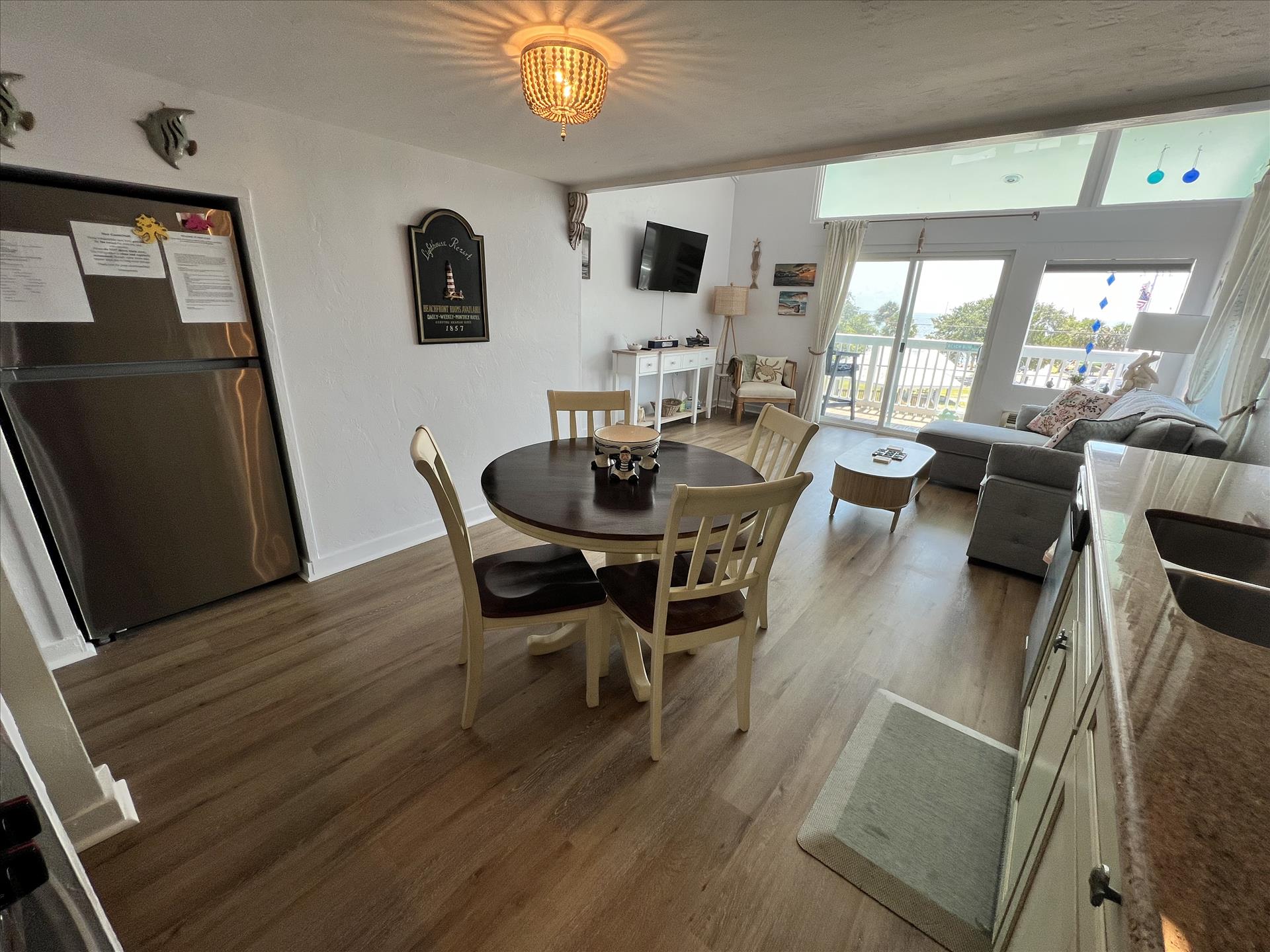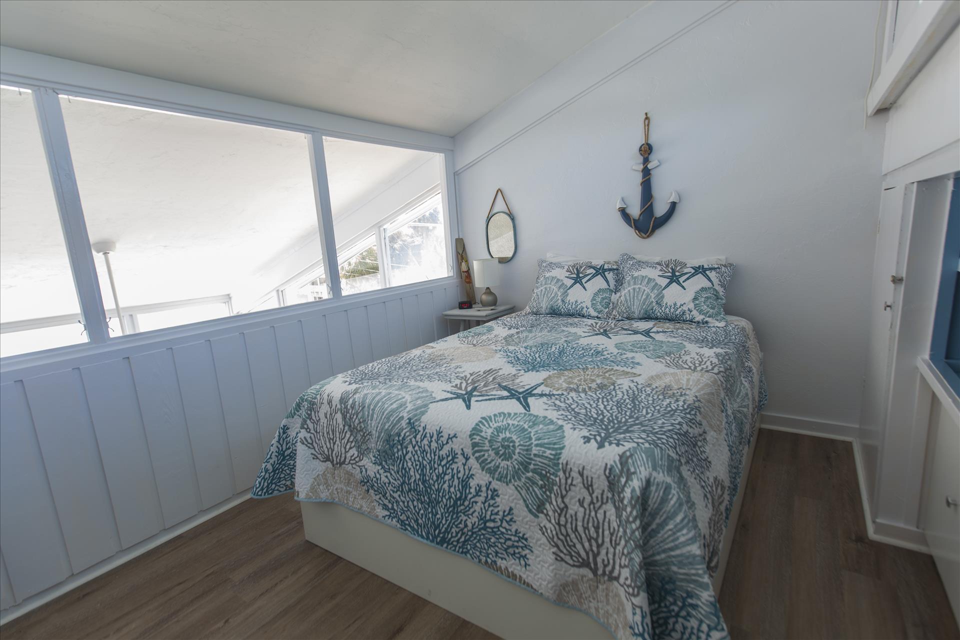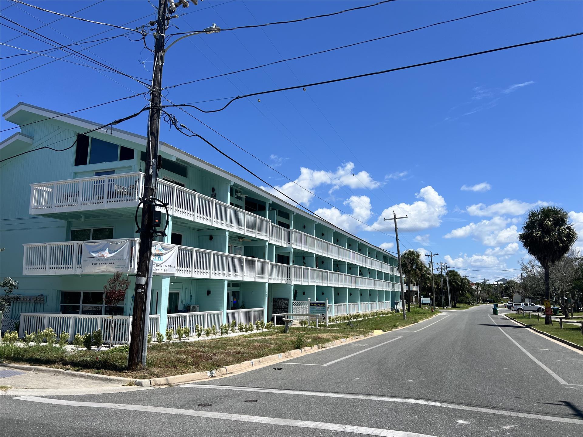 It is a third floor (top floor) corner unit, affording privacy and quiet. The unit’s wraparound main deck floor and railing were recently refinished. The deck is wonderful space, affording an excellent view of the City Park gazebo and park activities below, and of the beach area and Gulf of Mexico out on the edge of the park. We get beautiful sunrises from the main front wraparound deck, and sunset light from the west-facing area of the wraparound deck, and also from the rear deck. The rear deck also affords the best view in the island village of the most-recently installed osprey-nesting pole and nesting deck. Cedar Key is among the most bird-populated osprey and other raptor nesting areas in the country. It is birders’ paradise. Cedar Key is also known as a fishing mecca. Kayaks can be rented to paddle out around the bay and to other islands in the area. Unit 332, being on the top floor, has an upstairs bedroom loft, not available on lower floors. The main floor living room has a pullout futon-couch for extra guest sleeping space when needed. Recently-installed new washer and dryer are available for use by guests, and are located conveniently adjacent to the stairs on the second floor of the building. The well-stocked kitchen w dishwasher, fridge, freezer and other appliances, is perfect for foodies. There is much closet and shelf space on main floor and in upstairs bedroom loft. The owners love dogs so this is a dog-friendly unit, even with L.L. Bean doggie bed for your canine friend’s comfort. Onsite staff bring fresh towels and sheets for guests, and provide cleaning of units. Any issues can be addressed with the onsite management office staff. (3rd floor not wheelchair assessable)