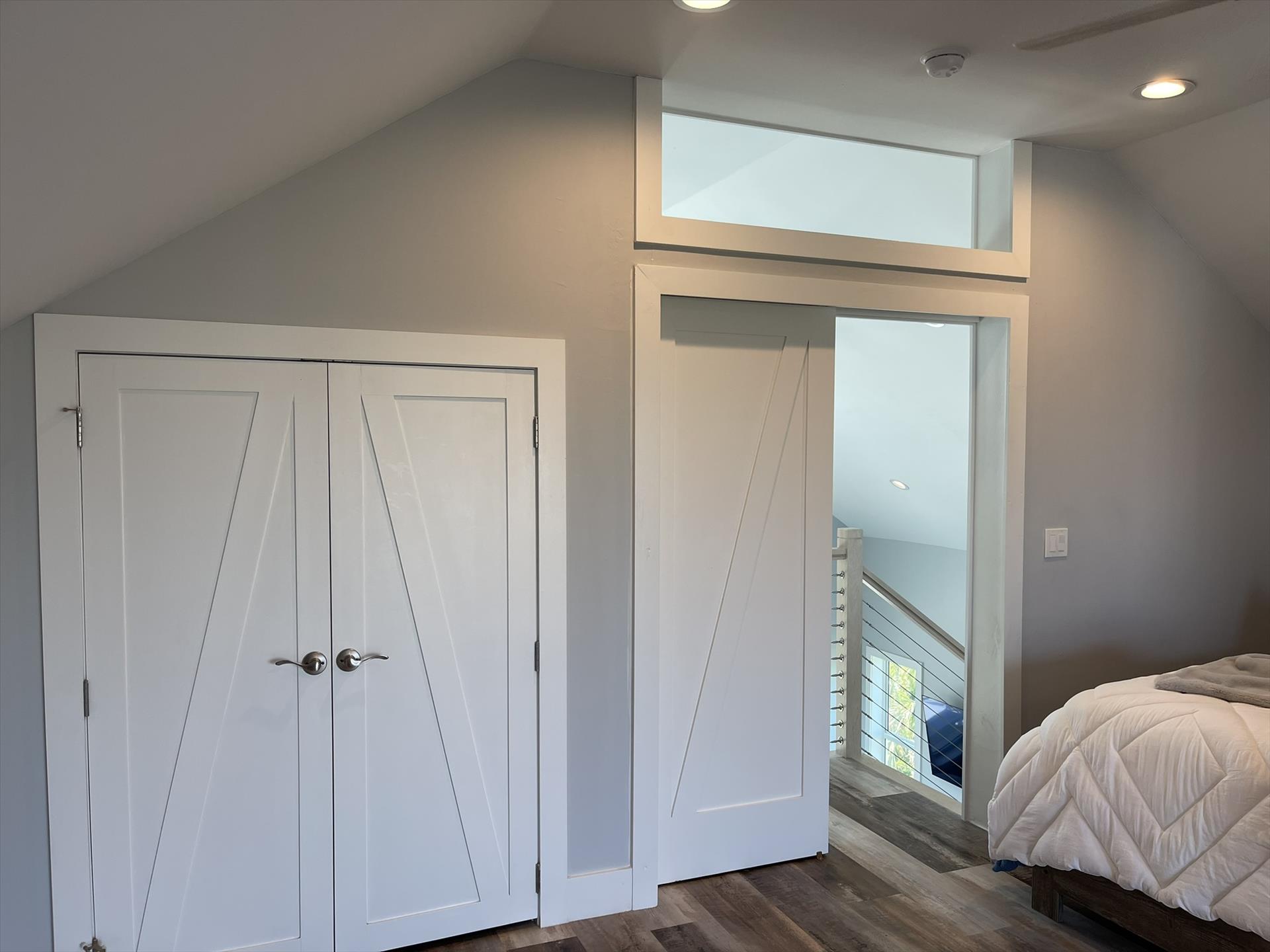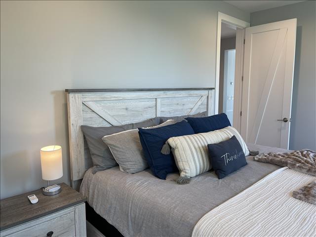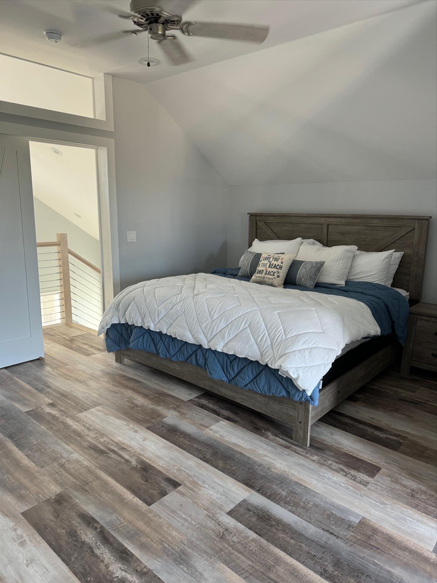 2nd Floor Loft - Huge Main Bedroom with King Bed, Nightstand, TV, Fan, Bureau and Closet. Walk out Back Yard Balcony. En Suite Full Bath with Sink, Toilet, and Tiled Shower.