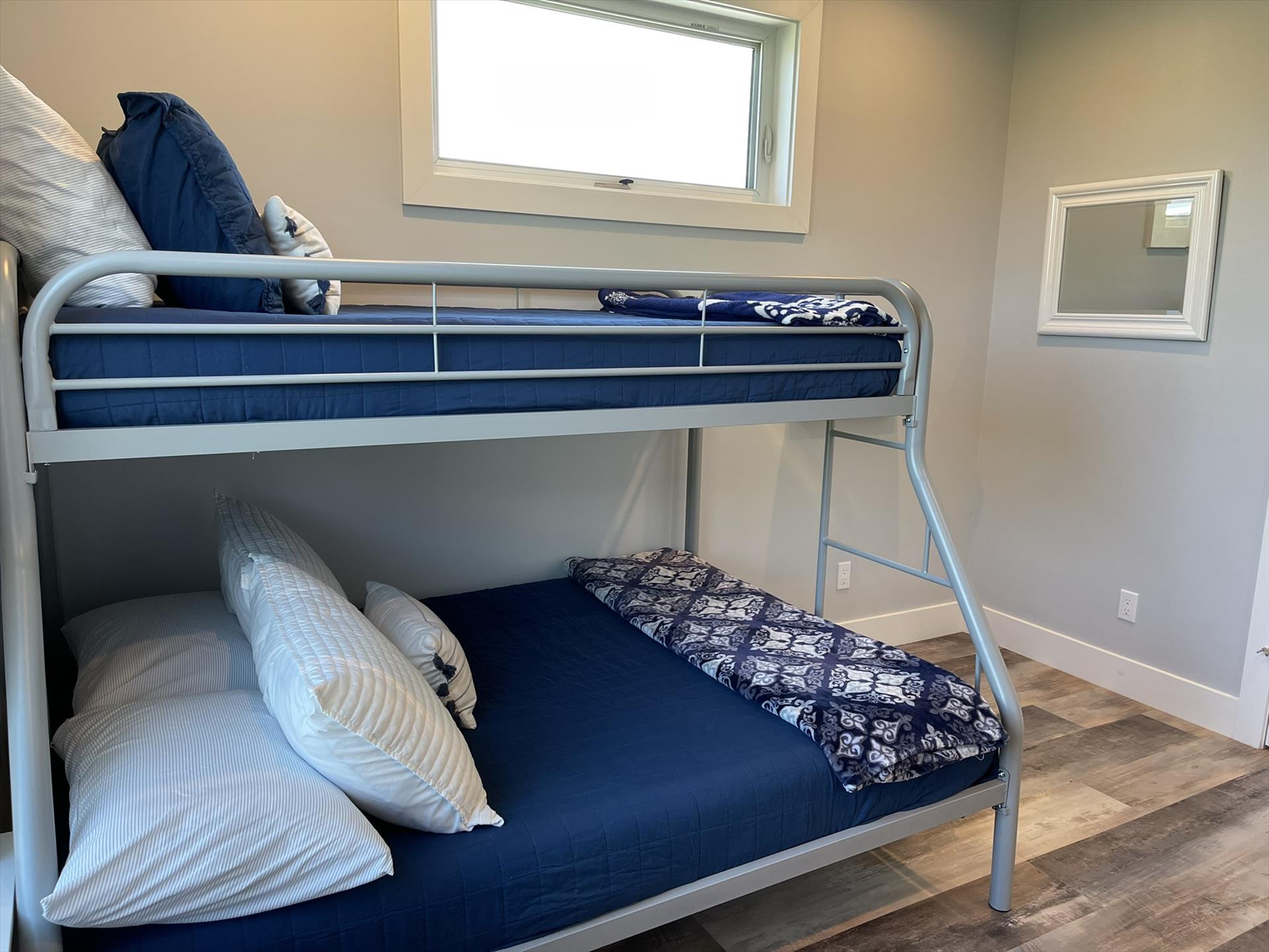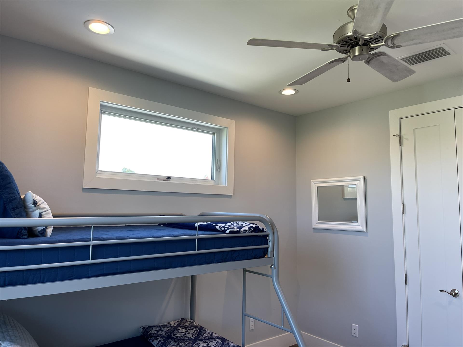 1st Floor - "Kids" Bedroom Right Side - Top Twin Bunk with Bottom Full Bunk, TV, Fan, Bureau, Closet and access to the Hallway Guest Full Bath.