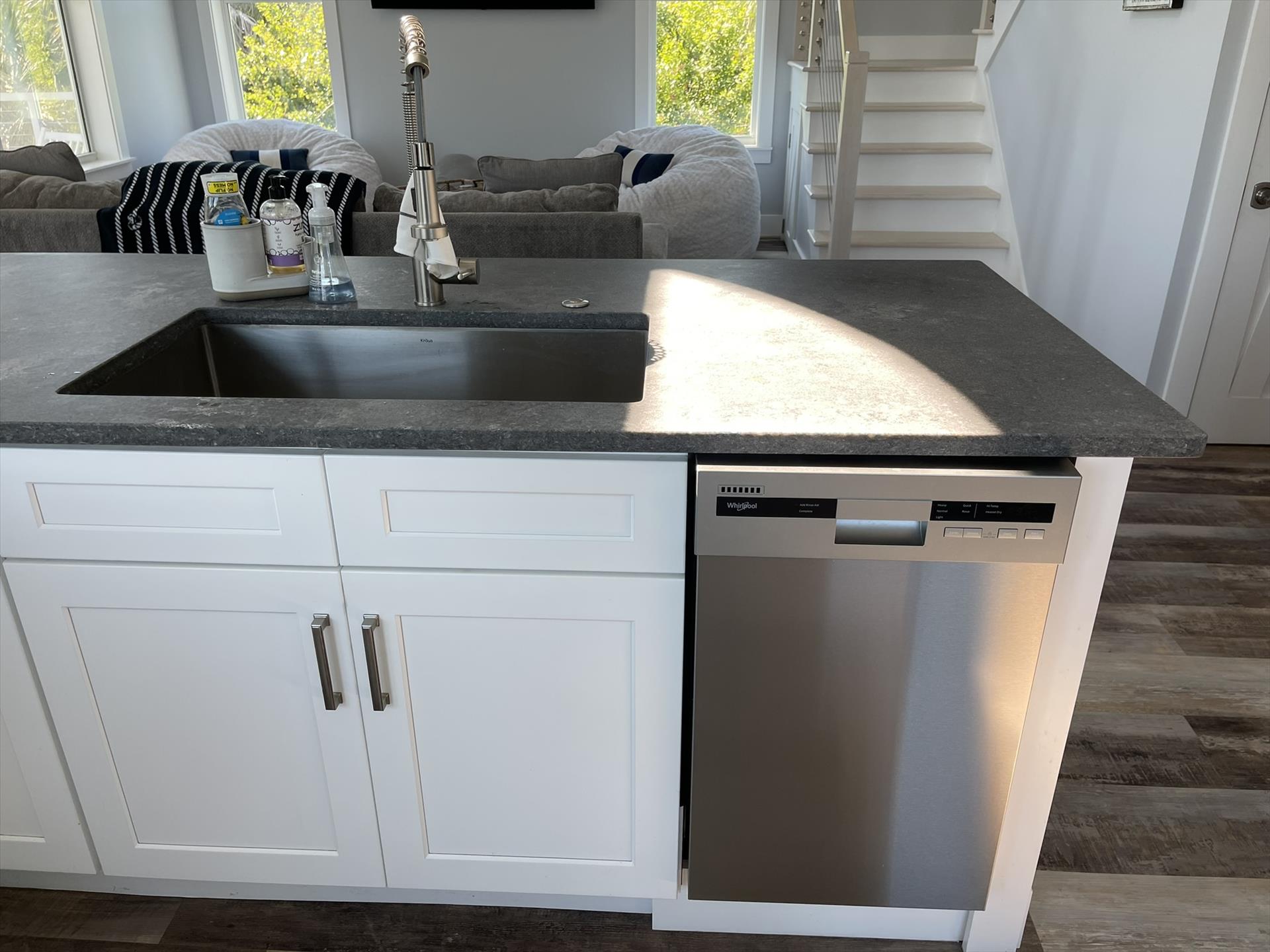 1st Floor Living Room with TV, Laundry Room and Fabulous Kitchen with Huge Island